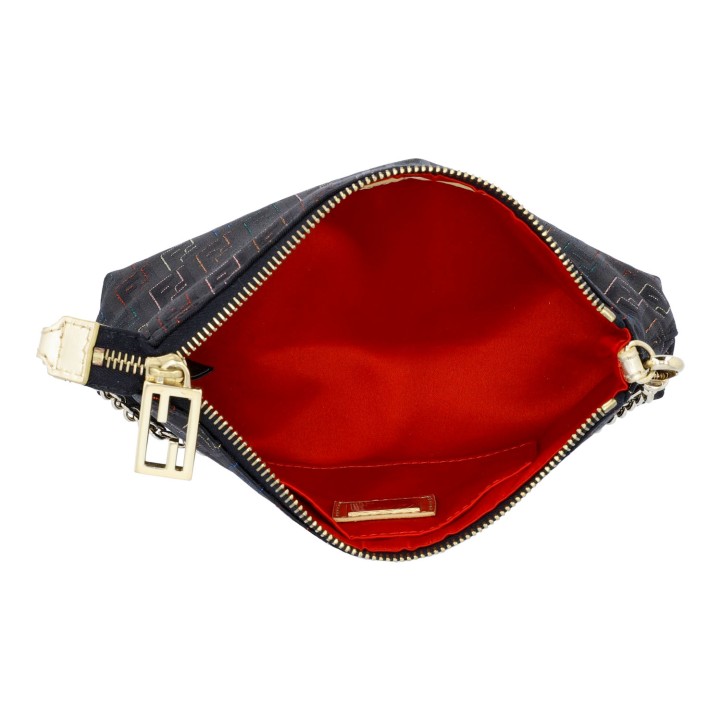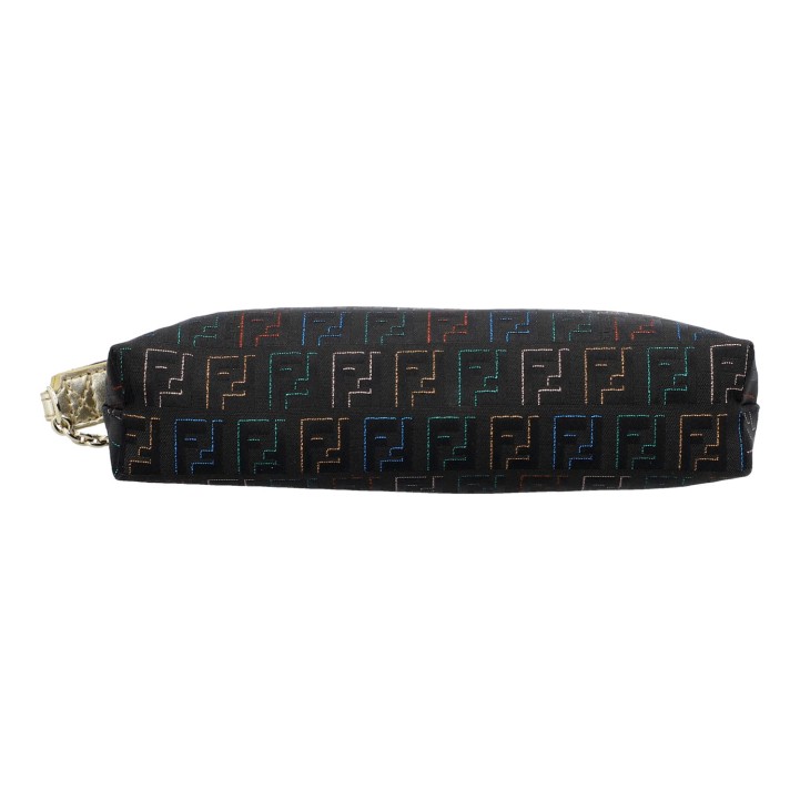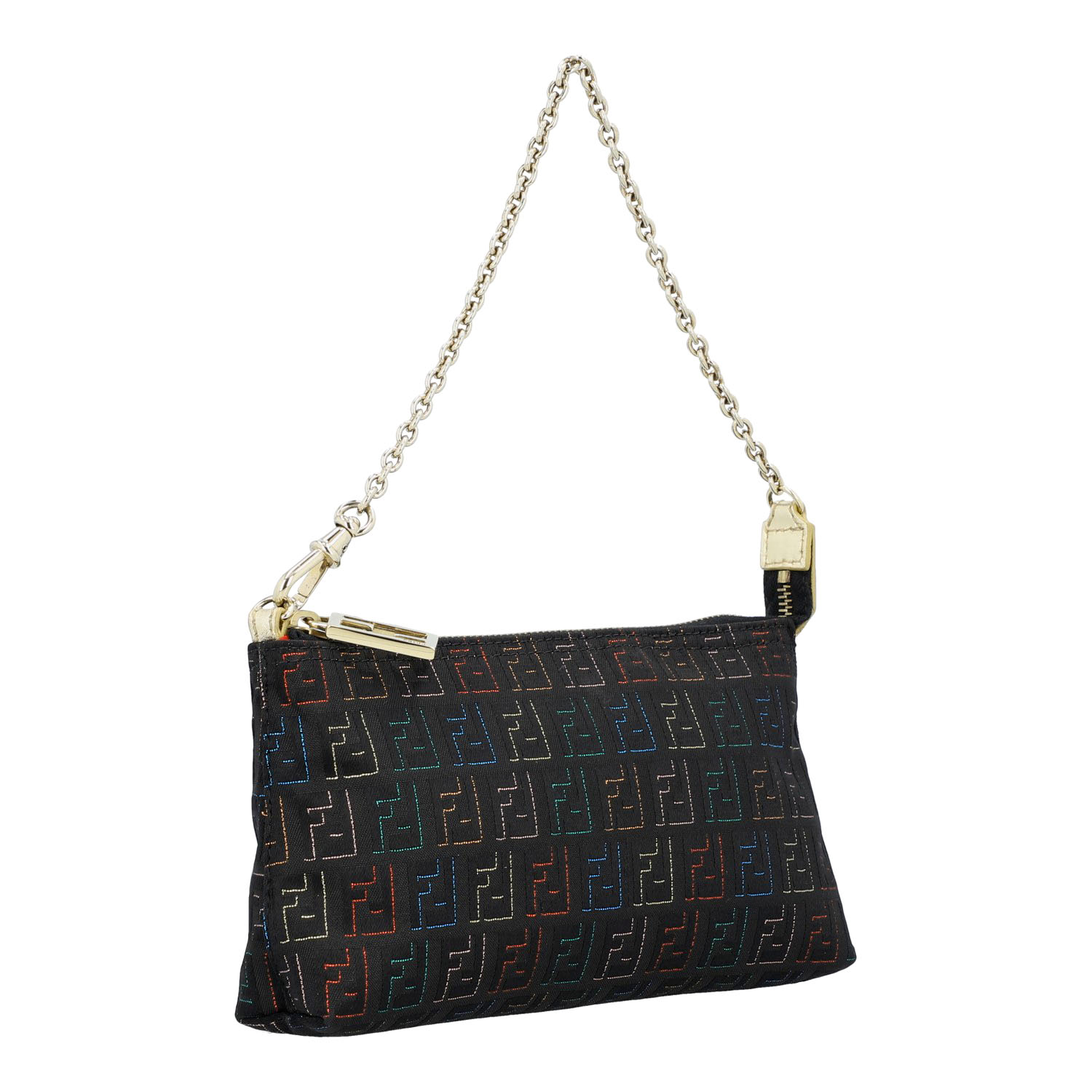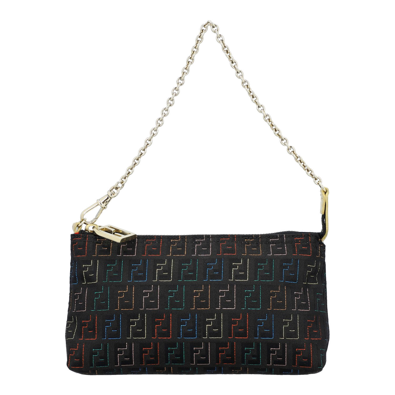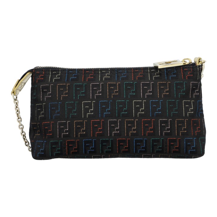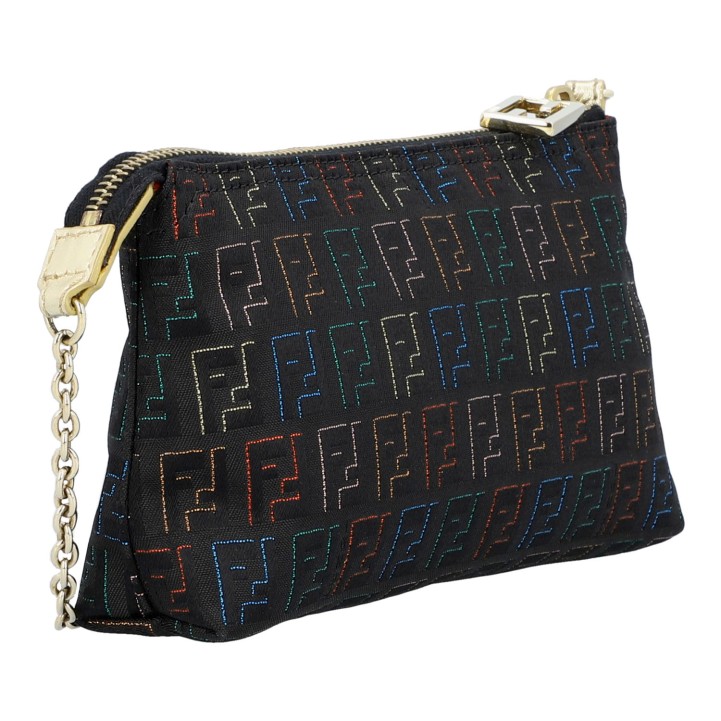 FENDI Pochette. Black textile with multicoloured Zucca design in shimmering yarn, gold-coloured hardware, zip closure and chain strap. Red satin interior with one compartment. Dust bag included. Signs of wear. 21 x 4 x 11 cm.
