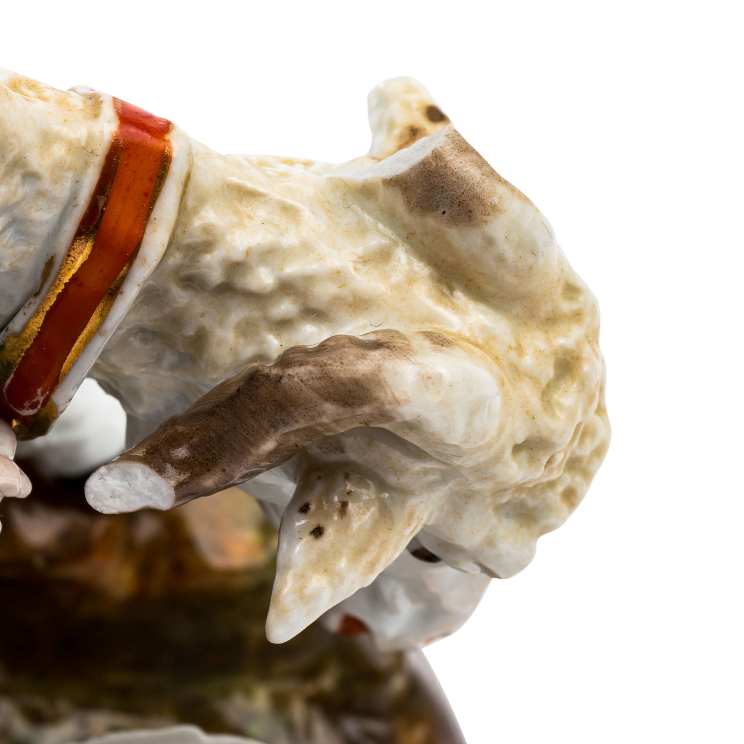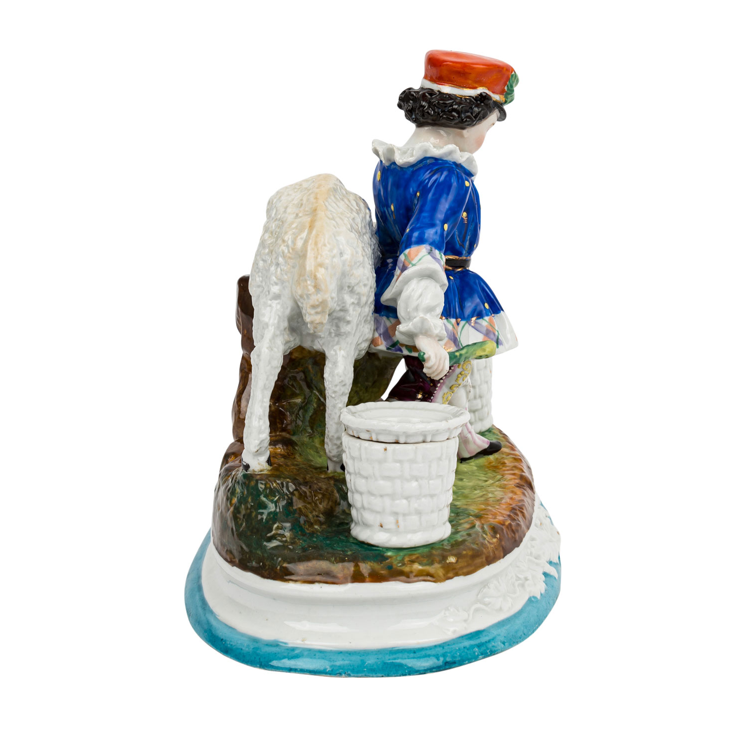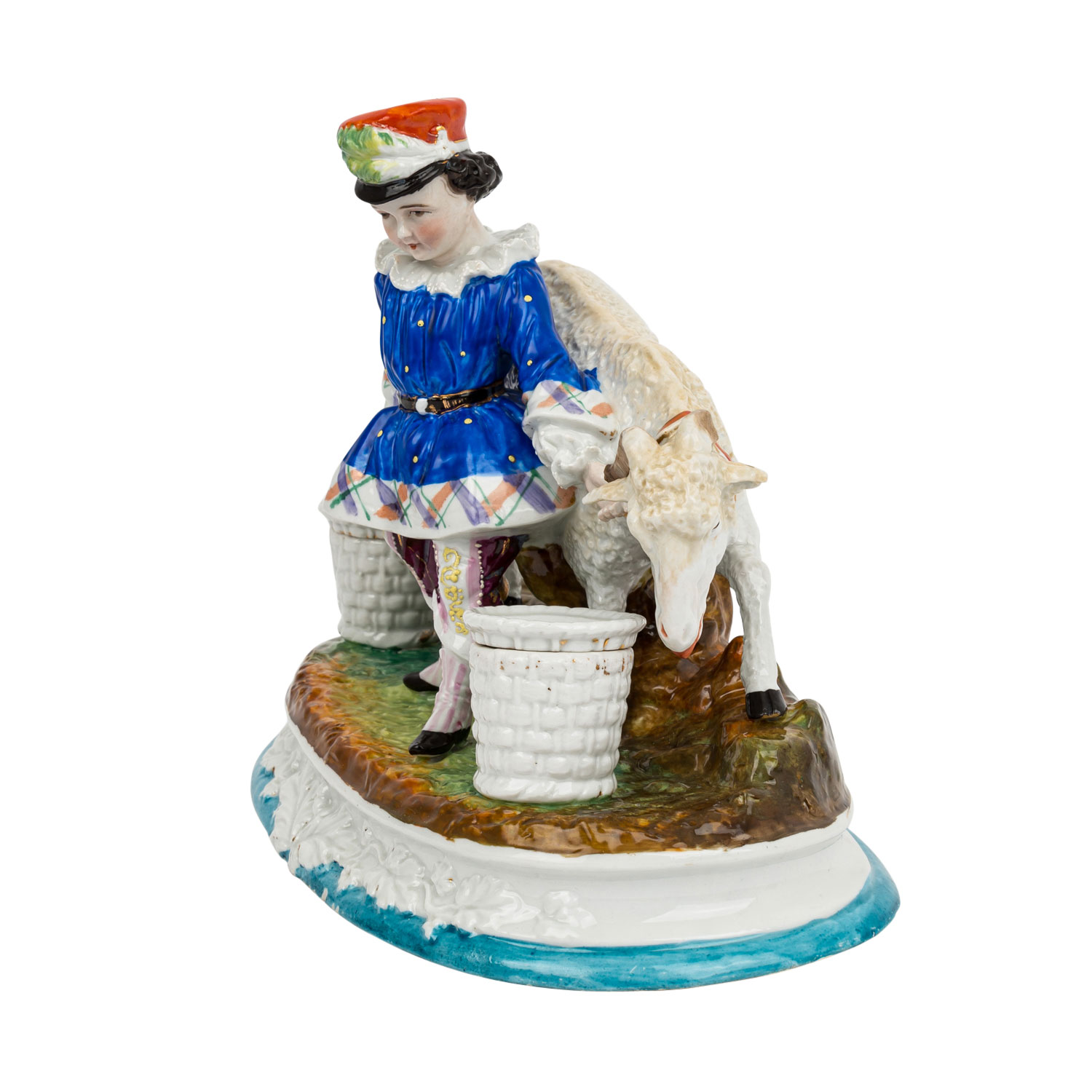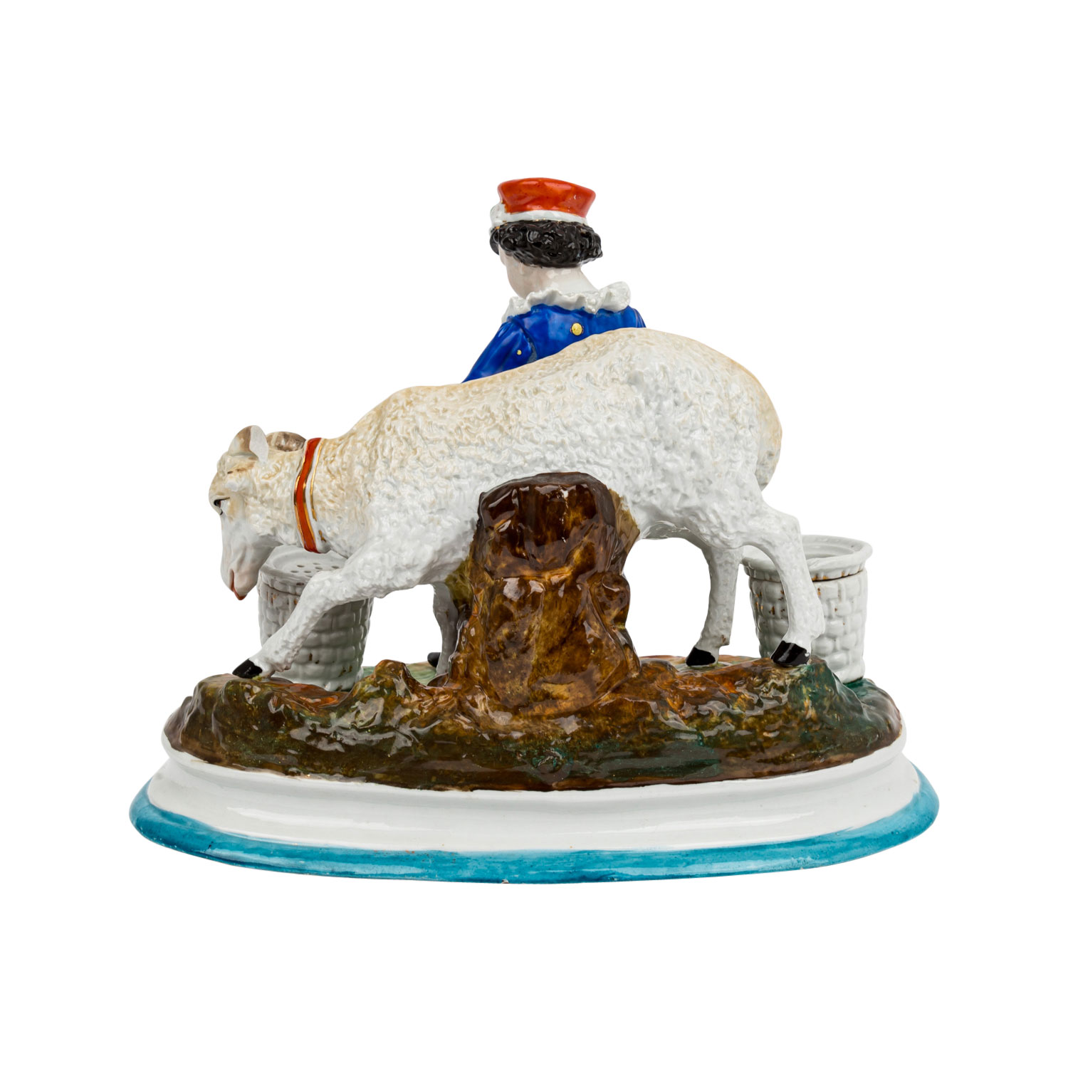 Figural ink stuff, 19th/20th century, shepherd with ram on oval base, flanked by a sand shaker and inkwell, colorfully decorated and in relief, embossed number '39' on the bottom, dam. (horns), base ring bumped, rubbed, H 22 x L 28.