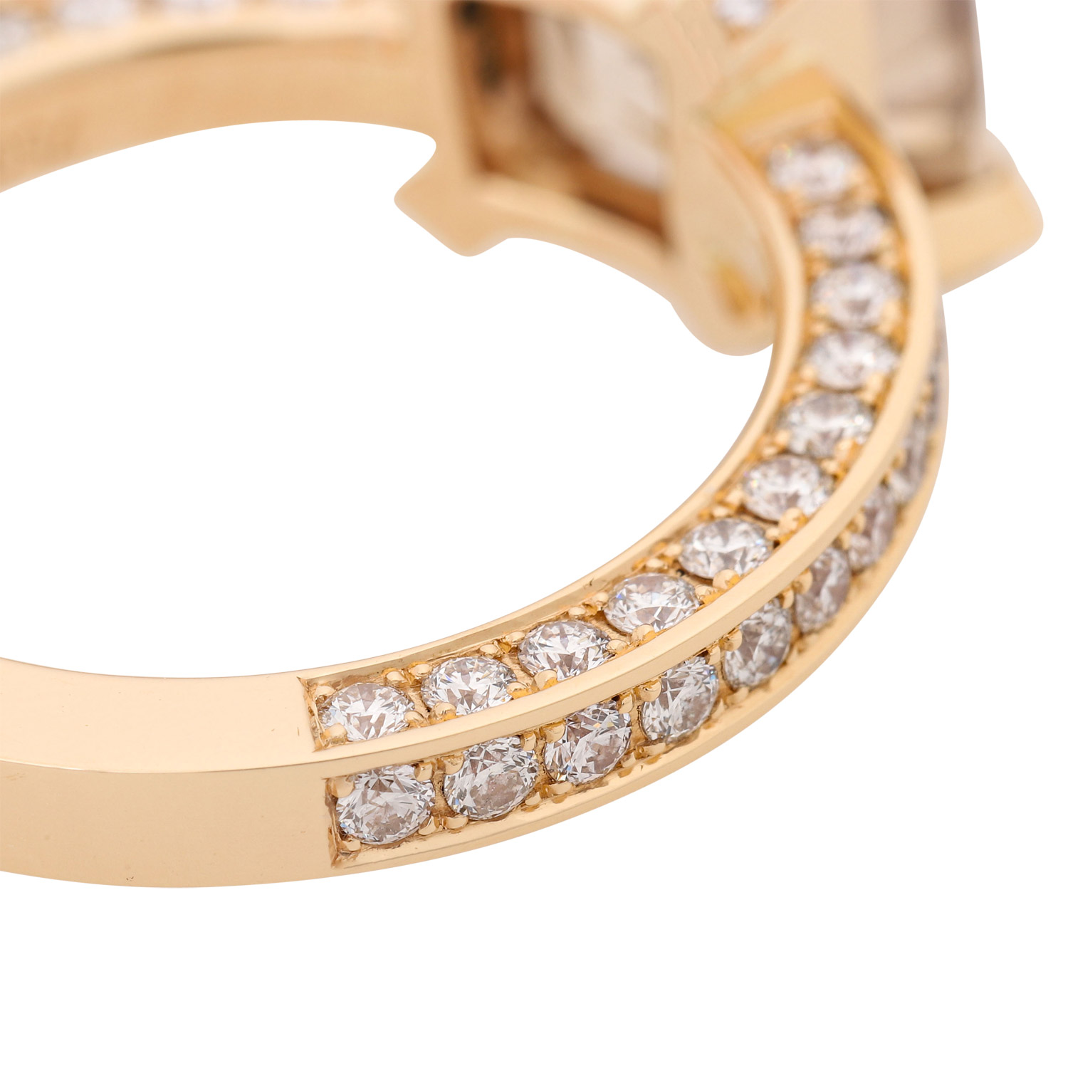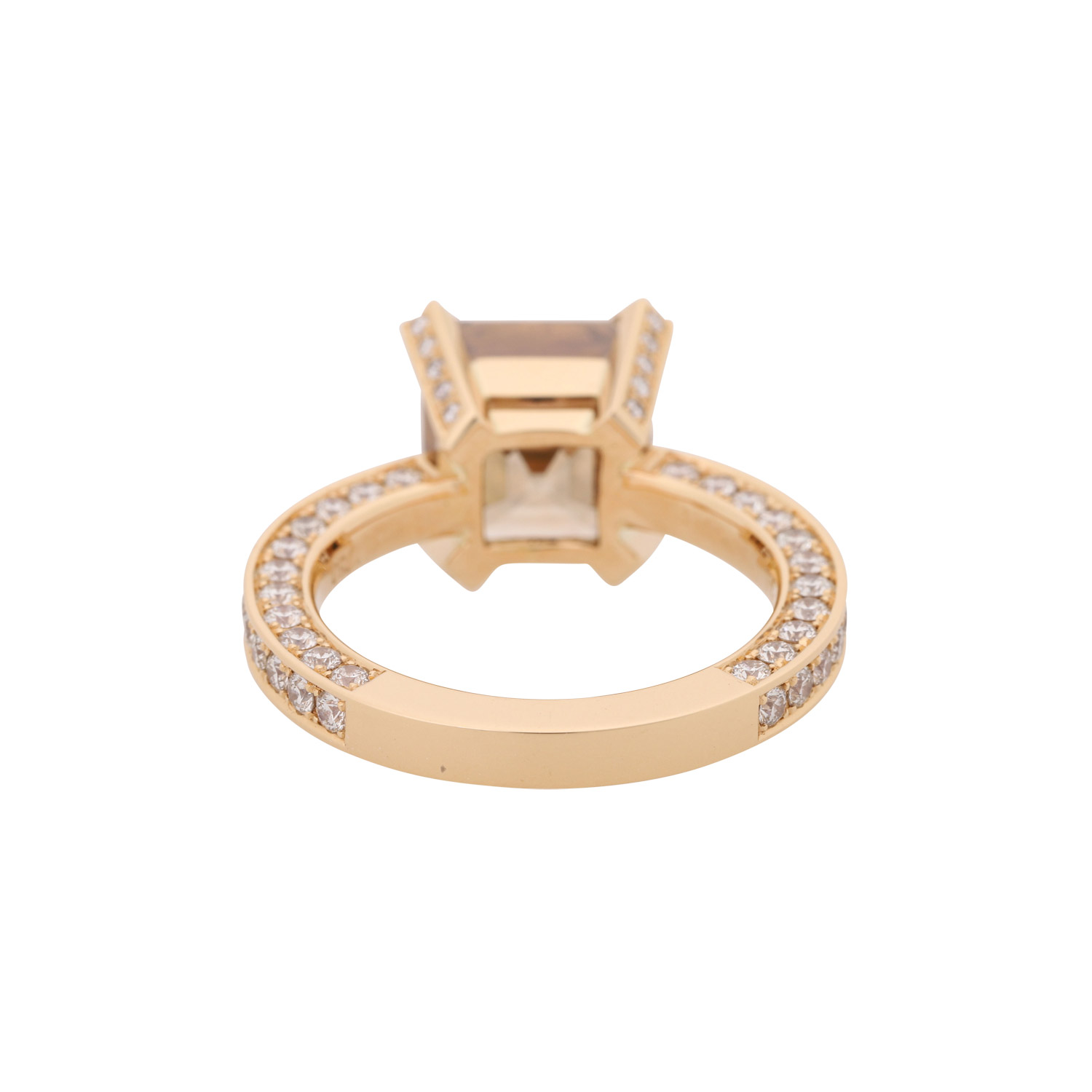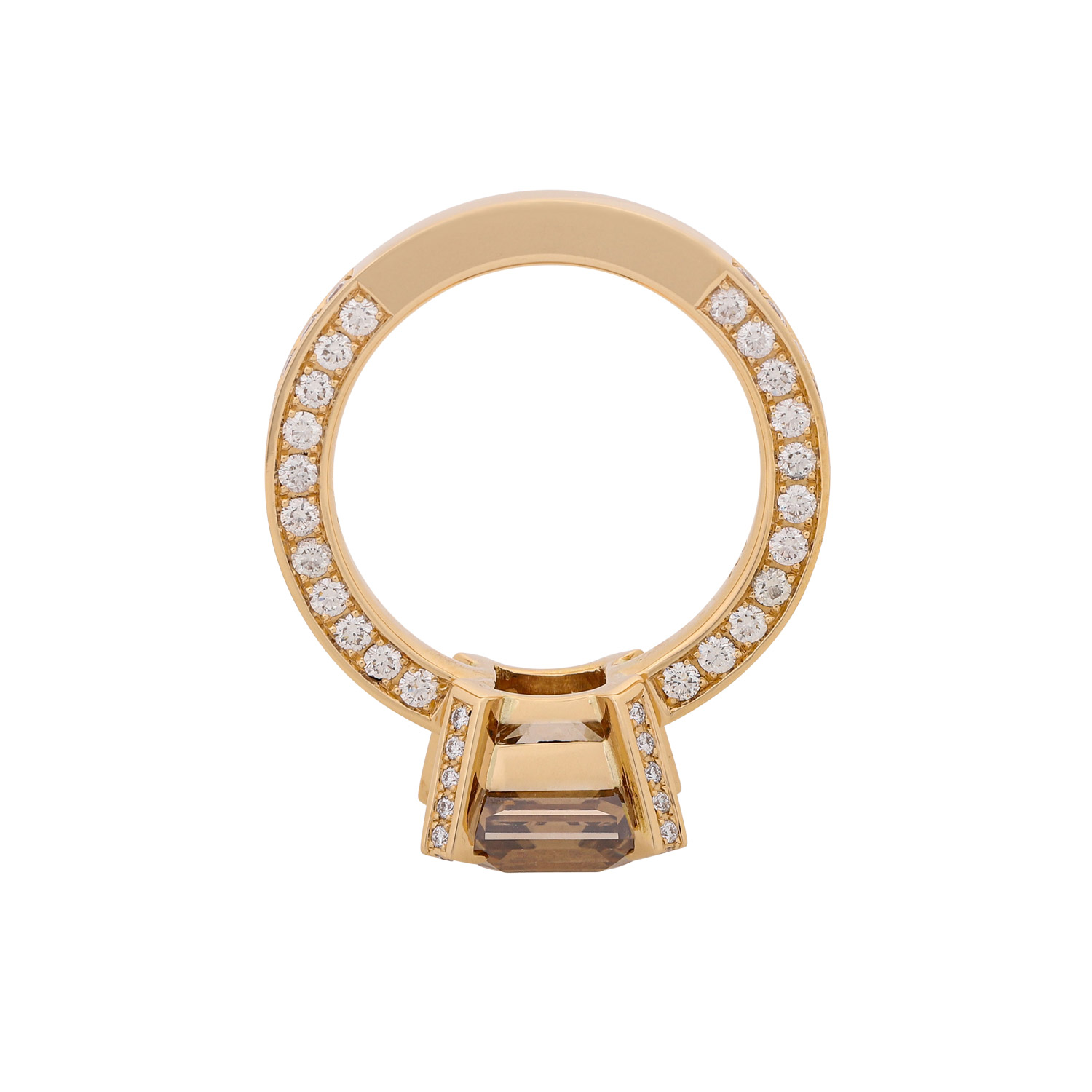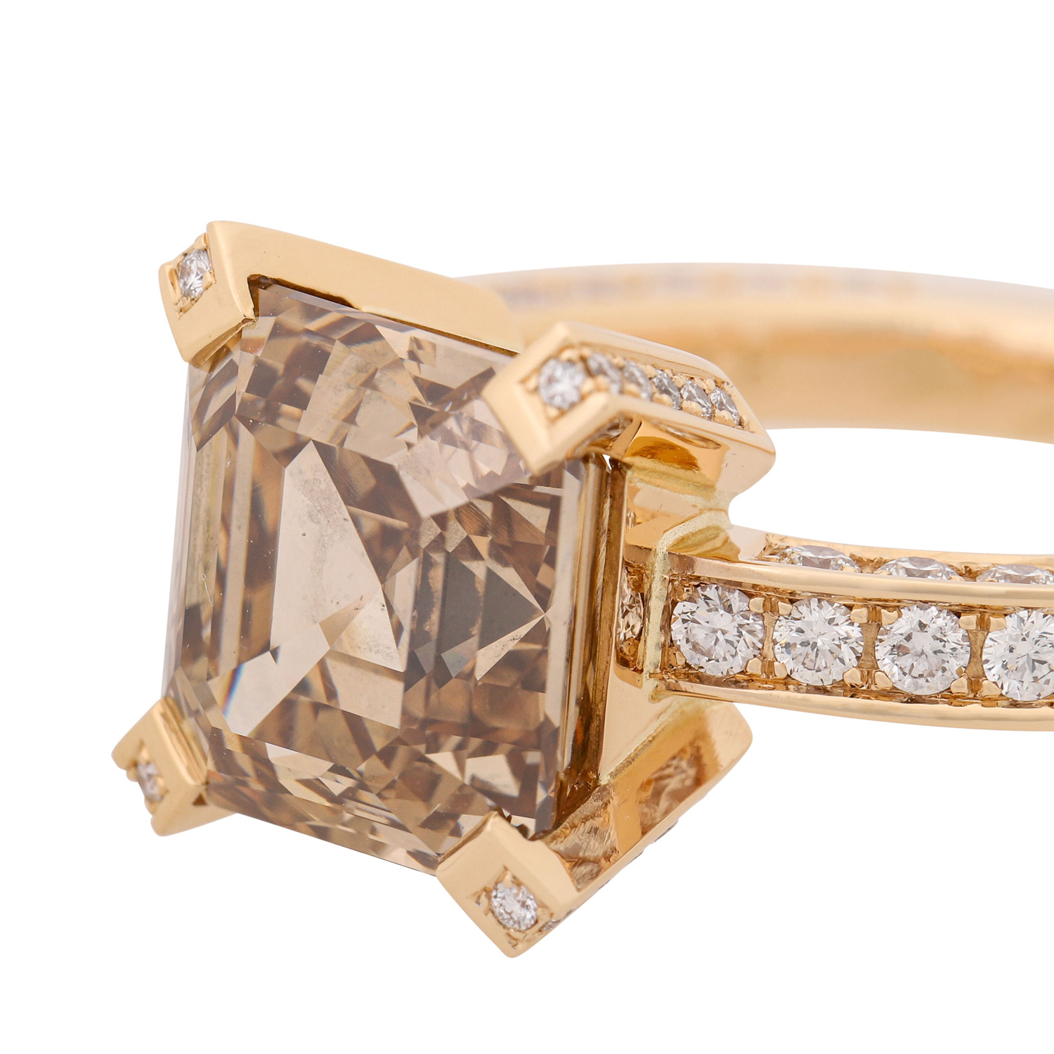 Ring with Assher cut diamond ca. 5.58 ct, FANCY ORANGE-YELLOW-BROWN/VSI and 94 brilliant-cut diamonds totalling 1.38ct, engraved RW (G) / VVS, YG 18K, 8 g, ring size 55, 21st century, high-quality goldsmith's work. Mint condition.