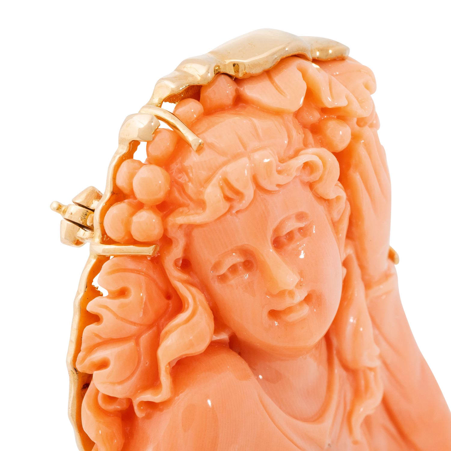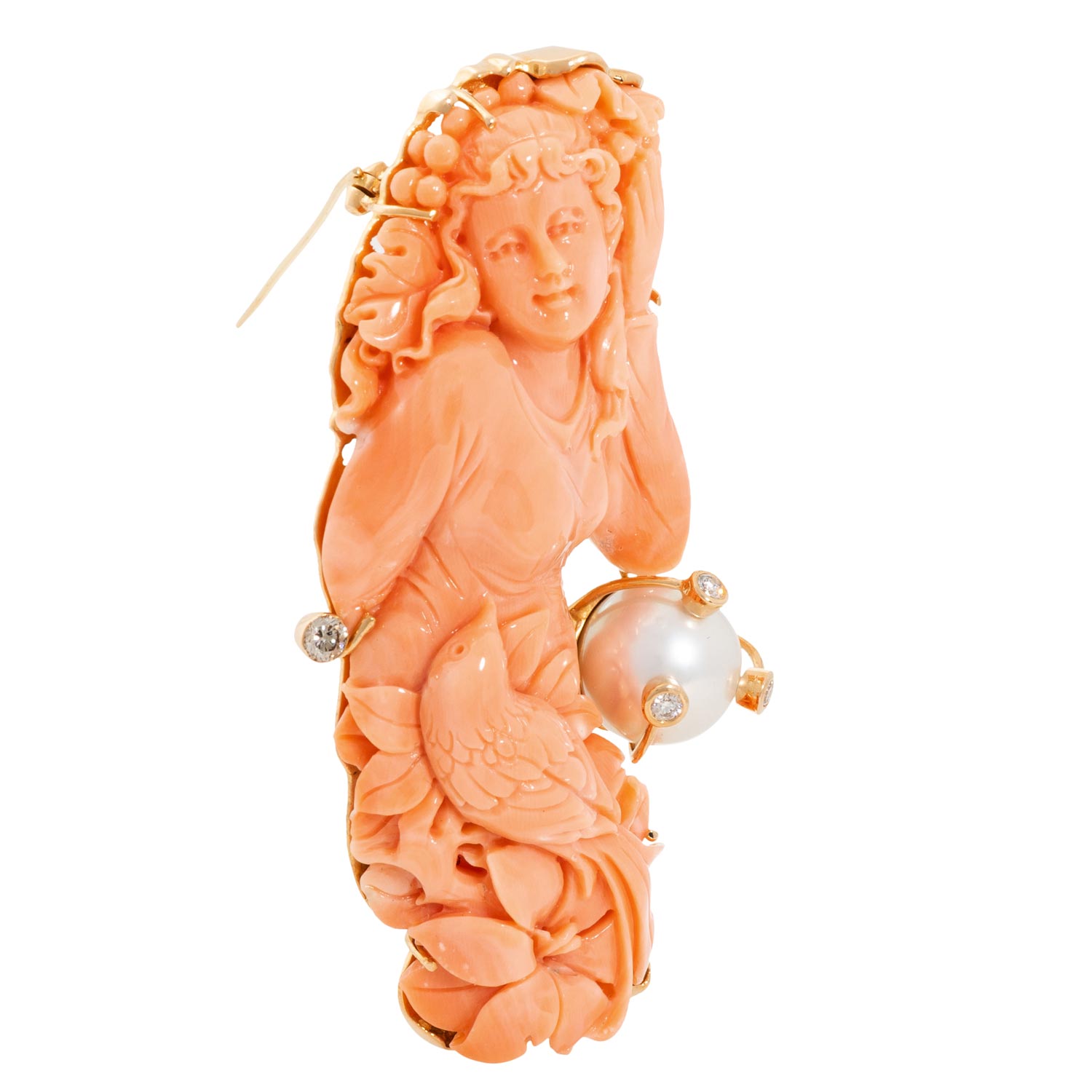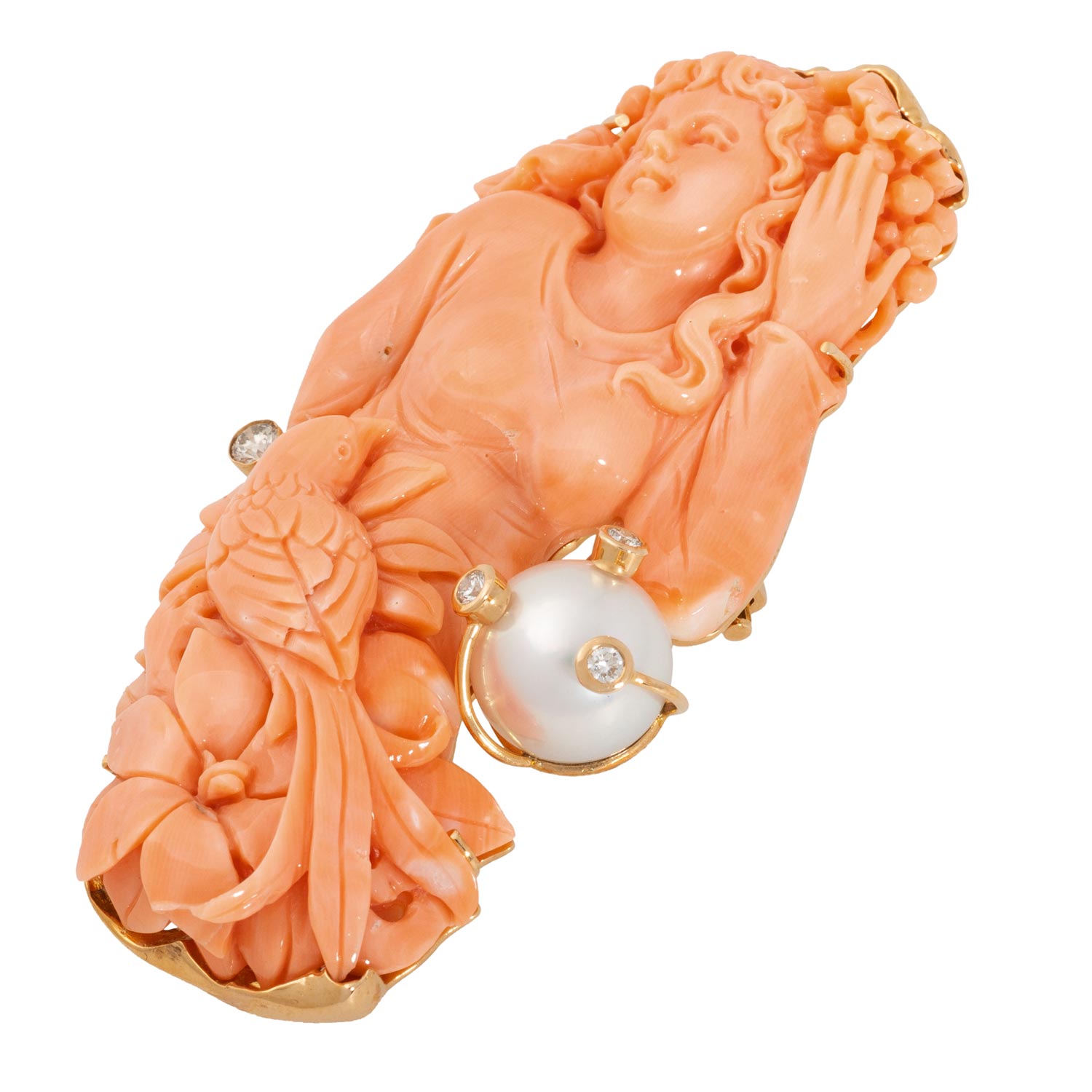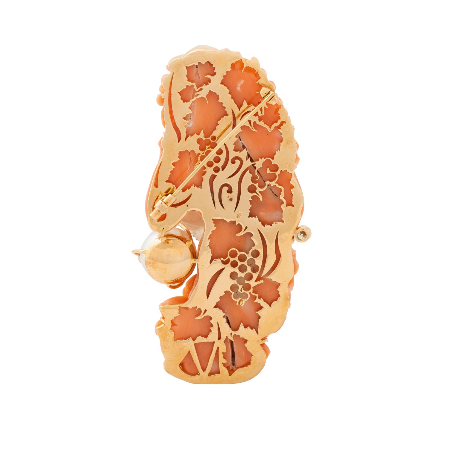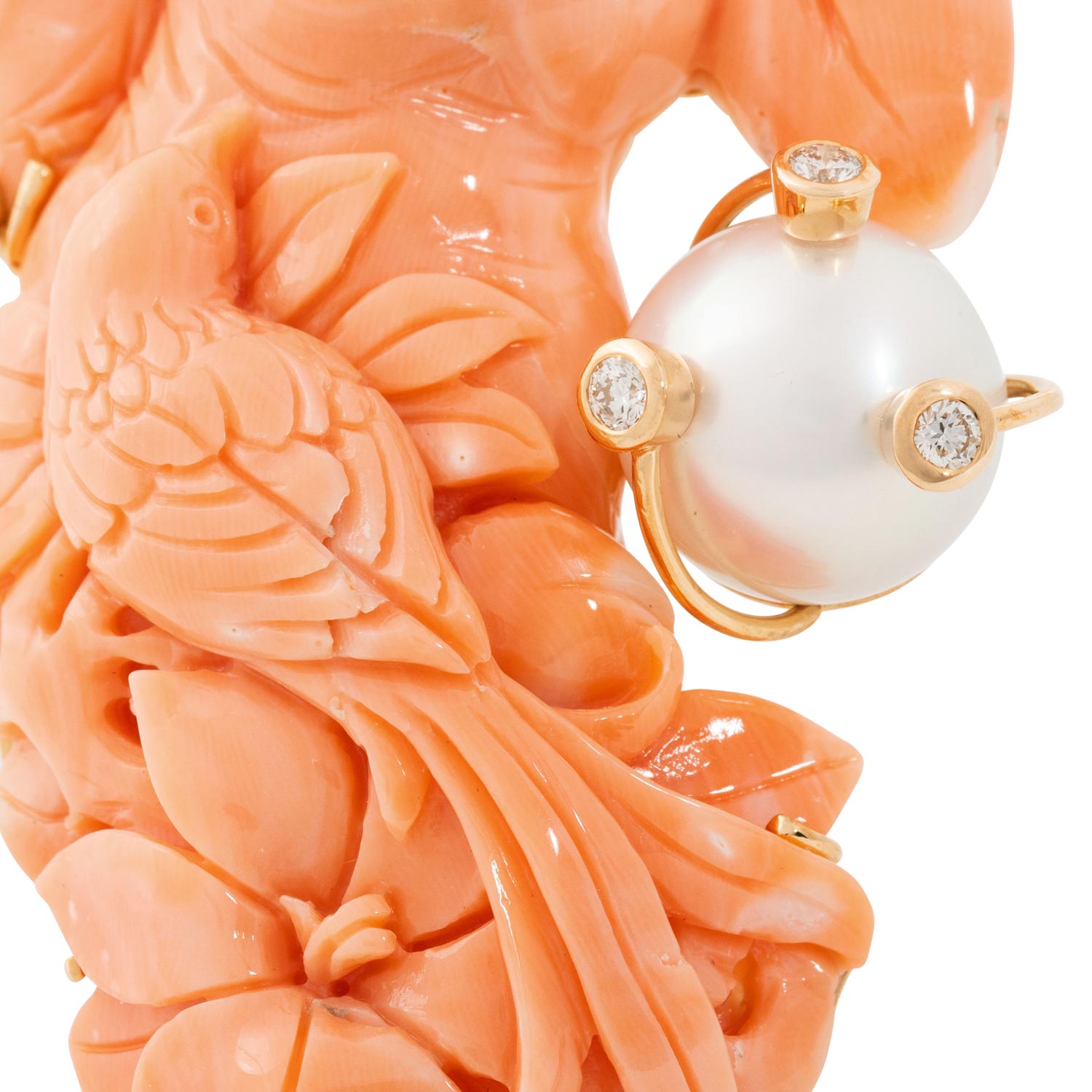 Elaborately carved coral brooch with South Sea cultured pearl ca. 13 mm with fine lustre and 4 brilliant-cut diamonds totalling ca. 0.38 ct, ca. RW (G)/VS-SI, frame 18K RSG, 59.3 gr, L: ca. 8 cm, 21st century, mint condition. IMPORT/EXPORT RESTRICTIONS OUTSIDE THE EU!