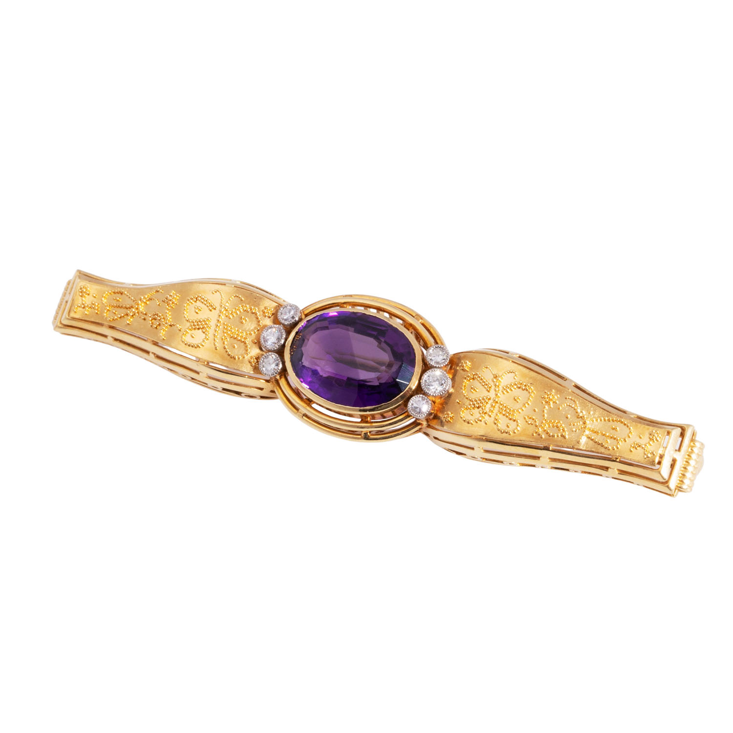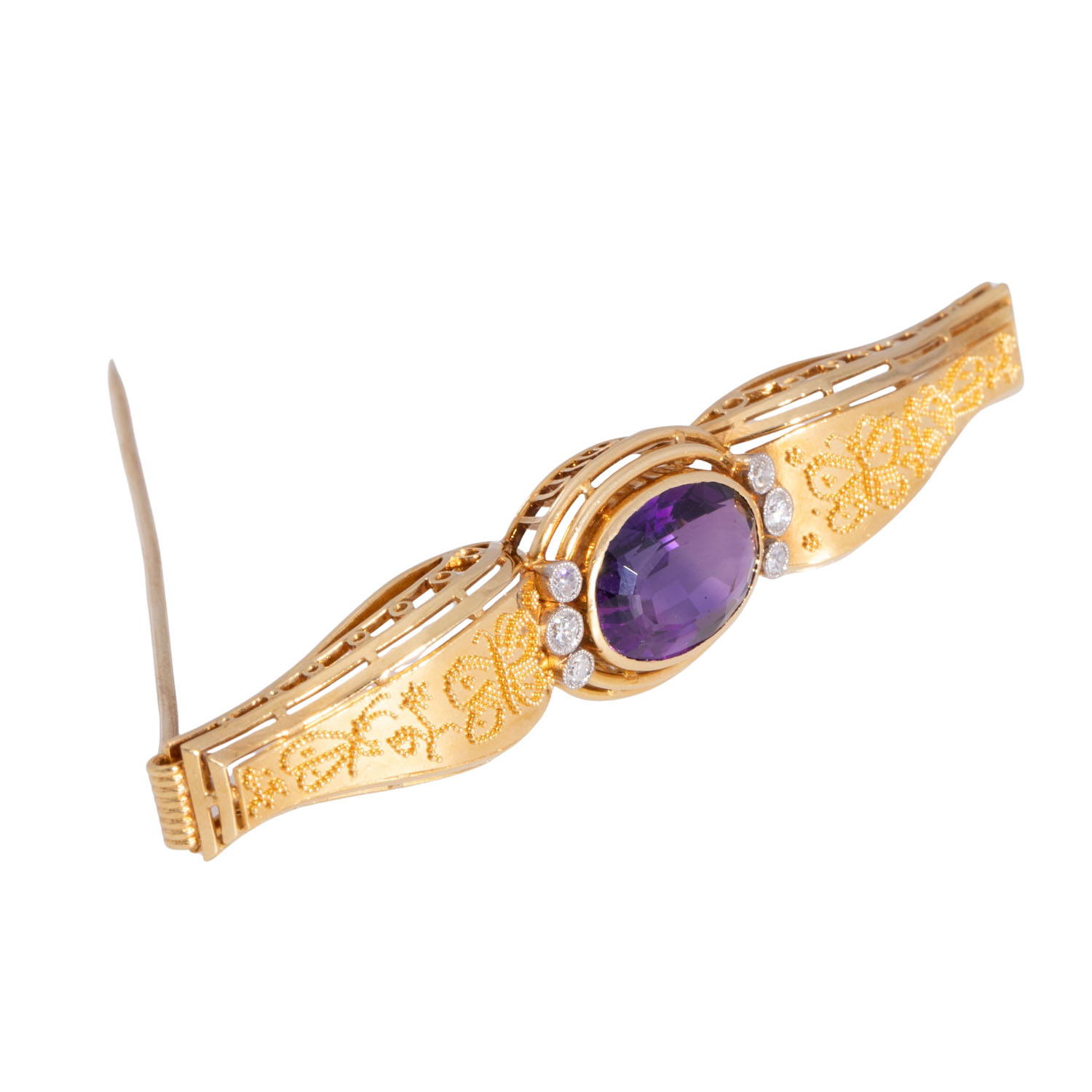 Fine granulated brooch with amethyste and diamonds totalling ca. 0.2 ct, good colour and clarity, 14K yellow gold, 10.7 g, 6.5x1 cm, granulation of butterflies and floral motives, mid of 20th century, nice condition, elaborately handcrafted!