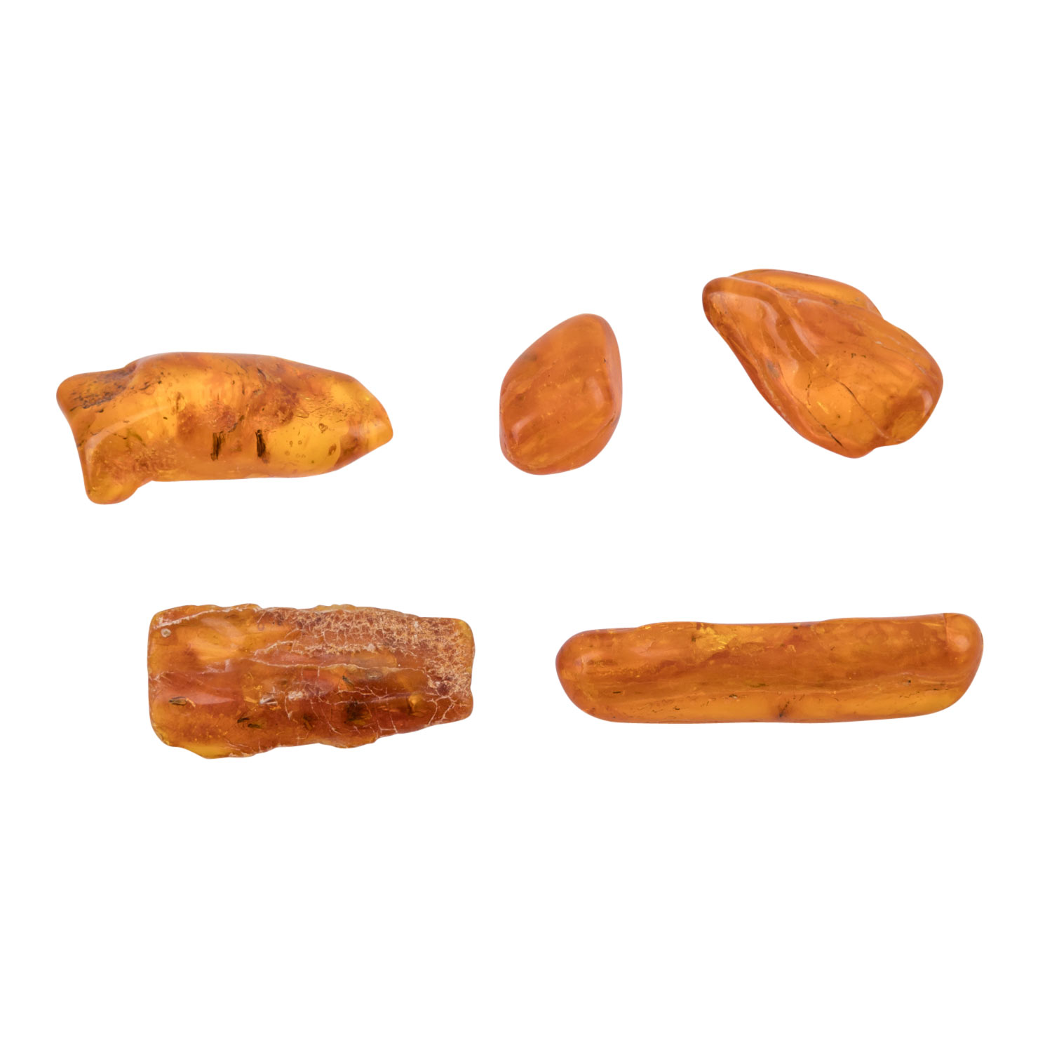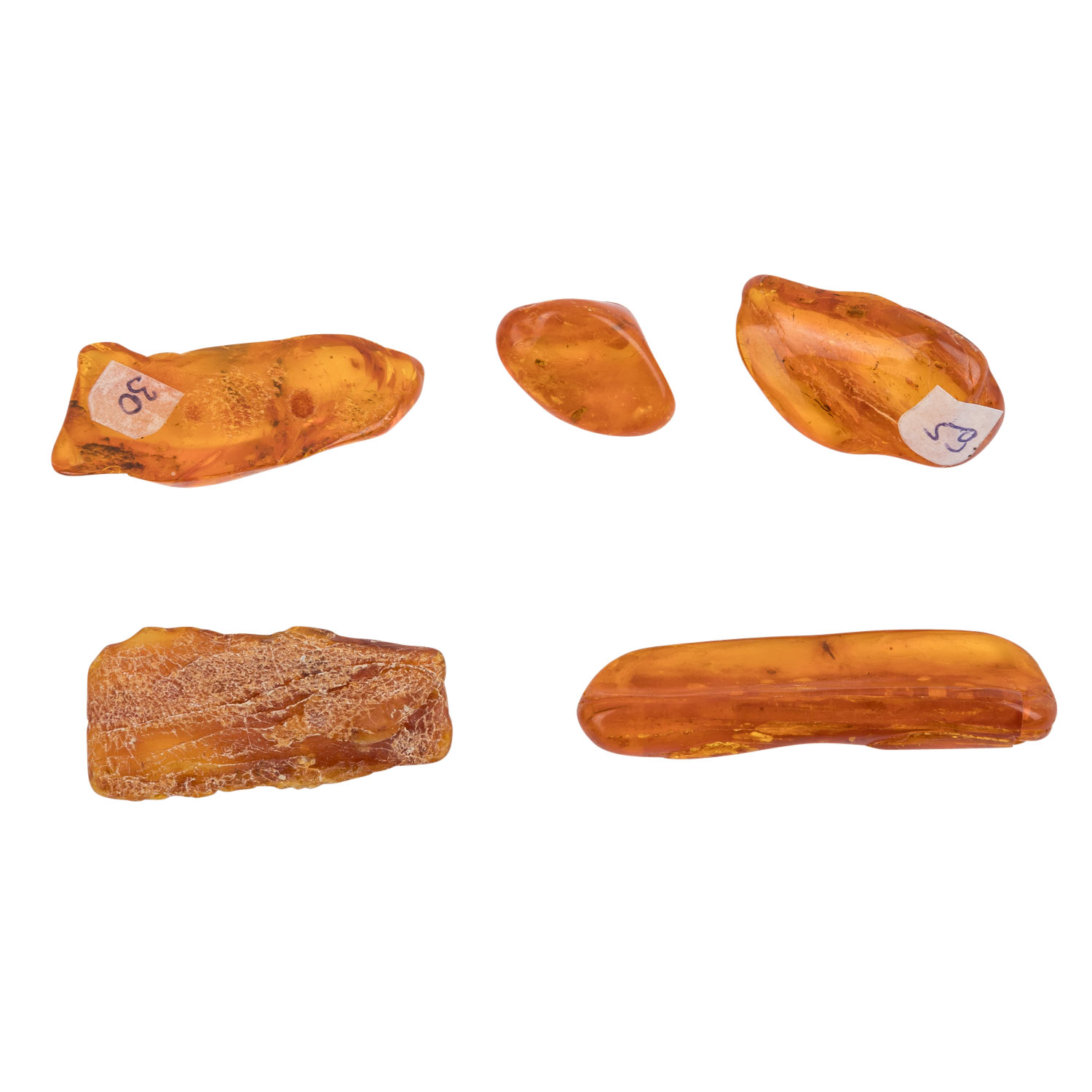 FIVE AMBER STONES WITH MOSTLY MULTIPLE INCLUSIONS OF VARIOUS INSECTS, Amber of different sizes. L max approx.: 54 mm. beautiful condition.