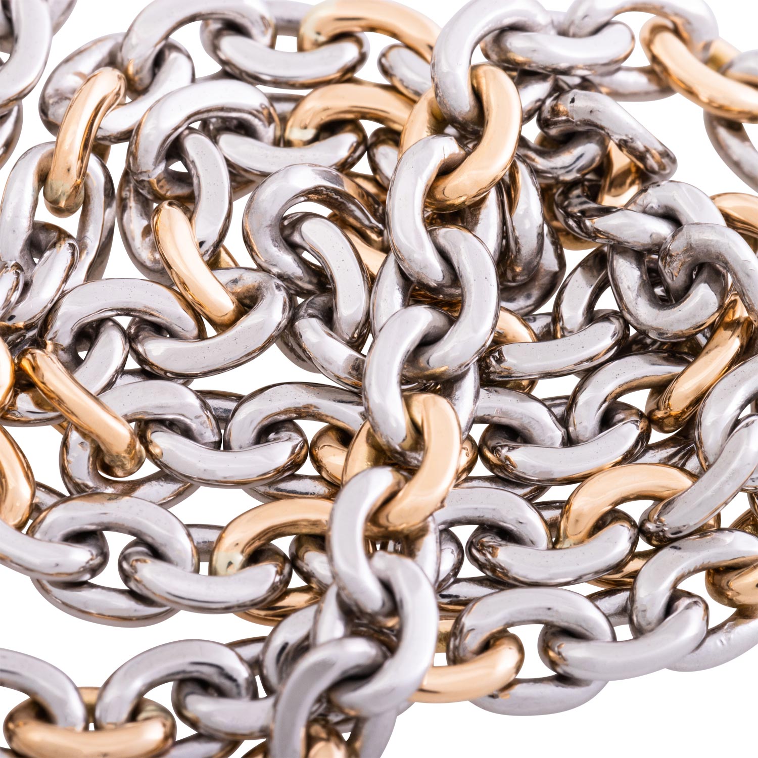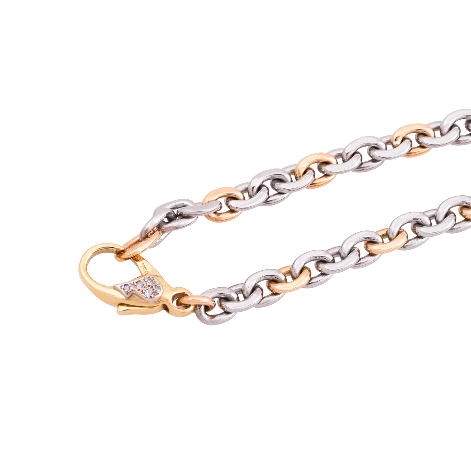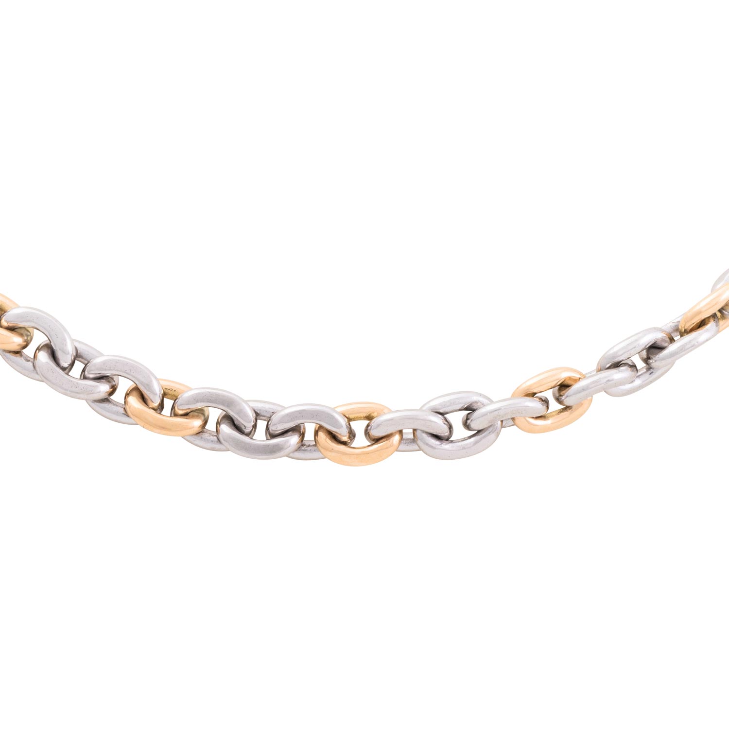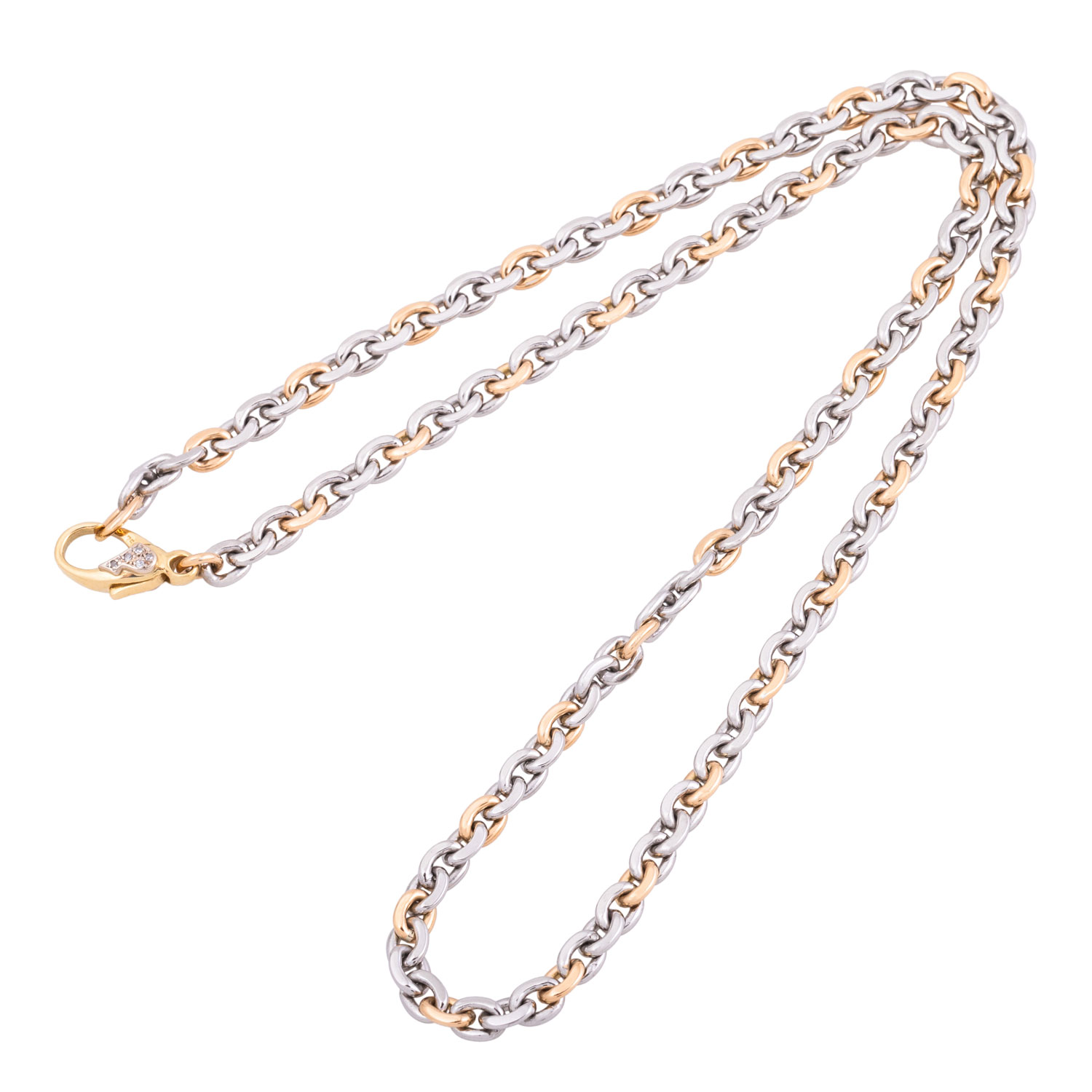 Necklace, flat anchor chain, bicoloured in white and yellow, platinum 900 and 18K yellow gold, 50.8 g, L: 49.5 cm, W (chain) ca: 4.6 mm, carabiner clasp with 10 single cut diamonds, late 20th century, minimal signs of wear.