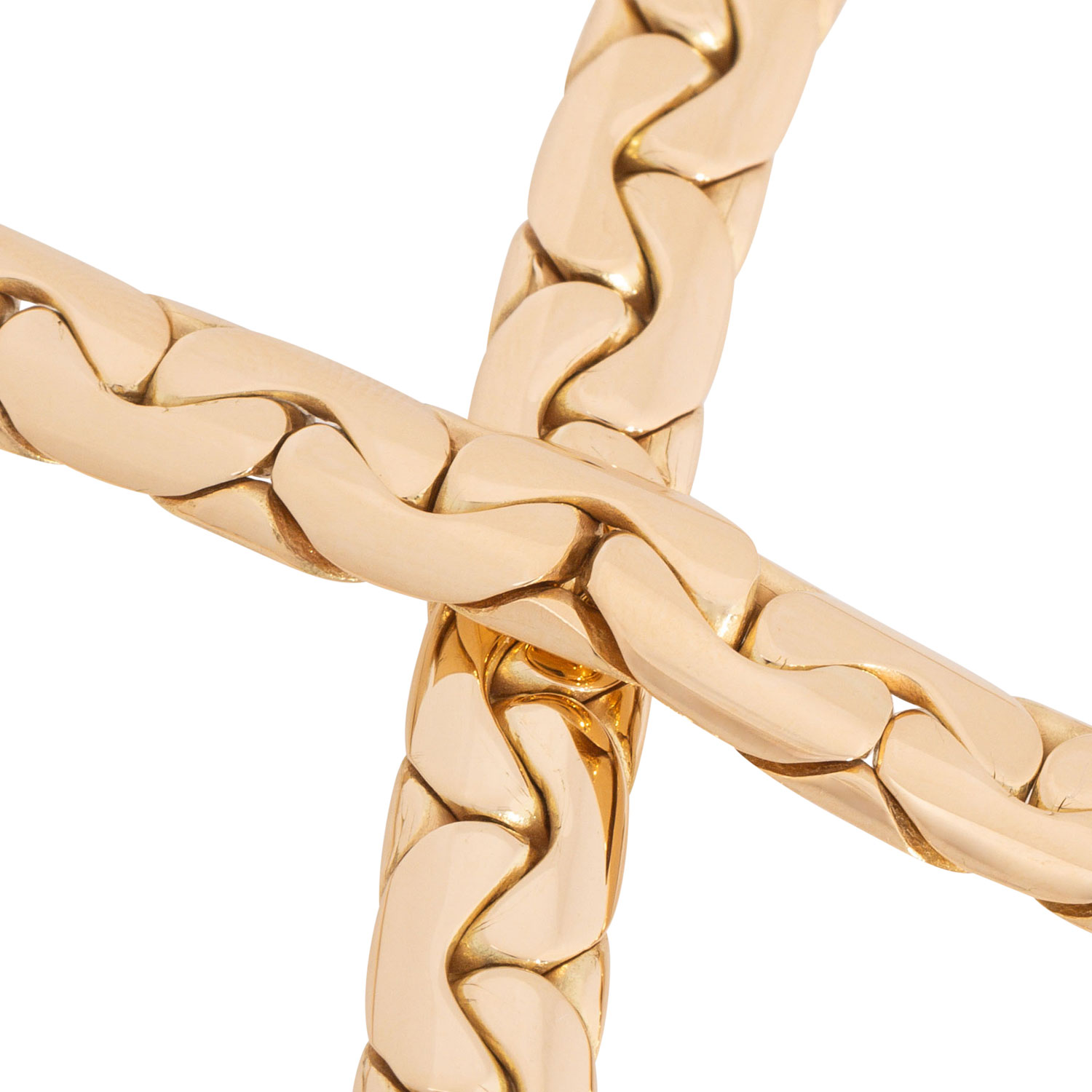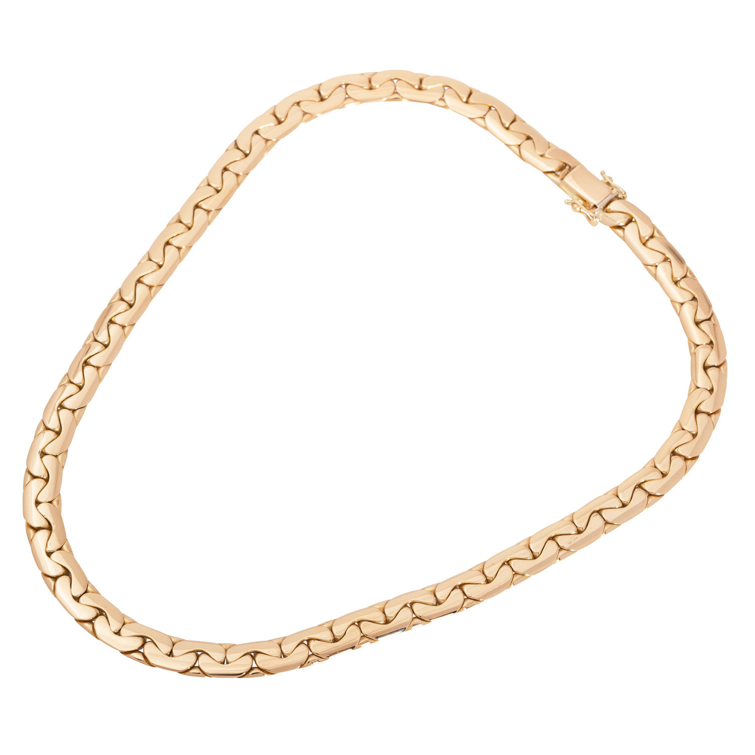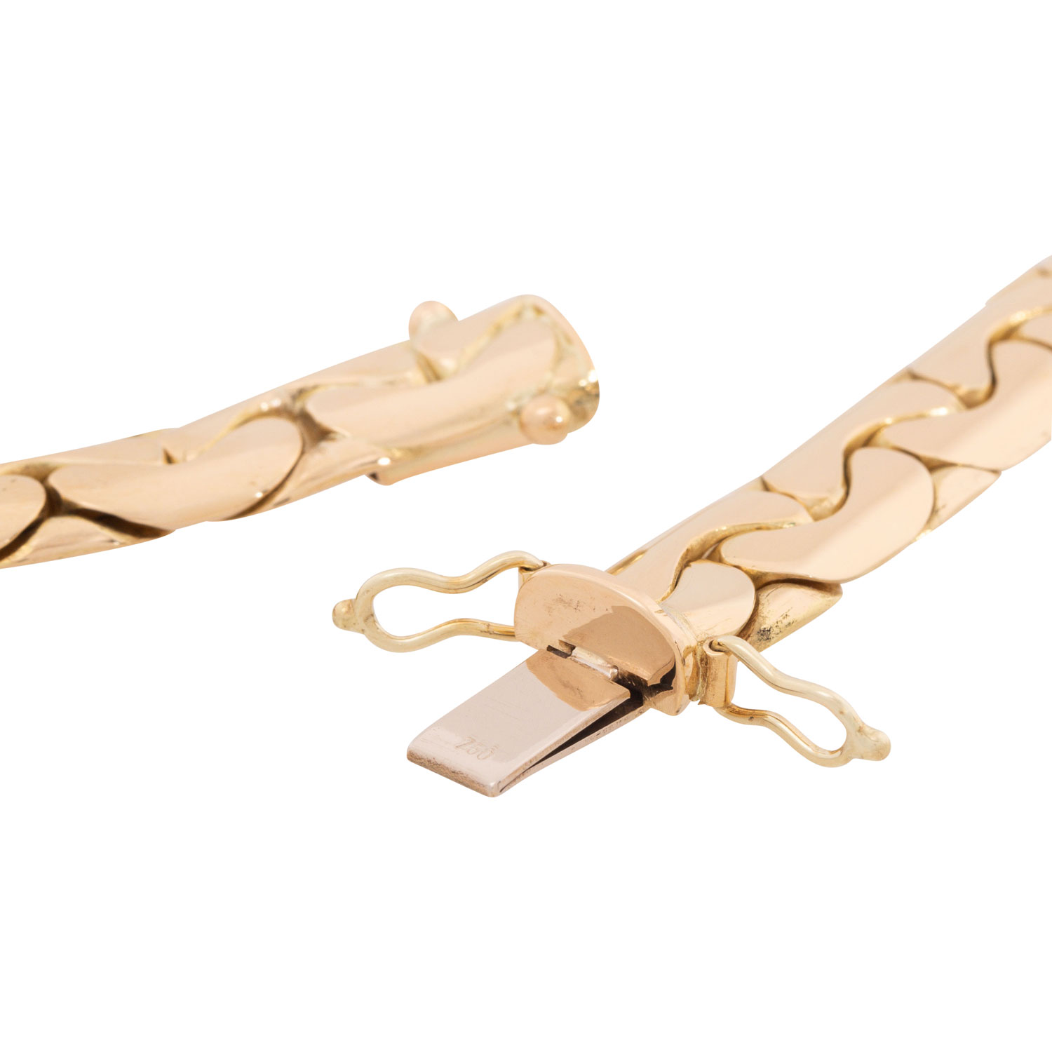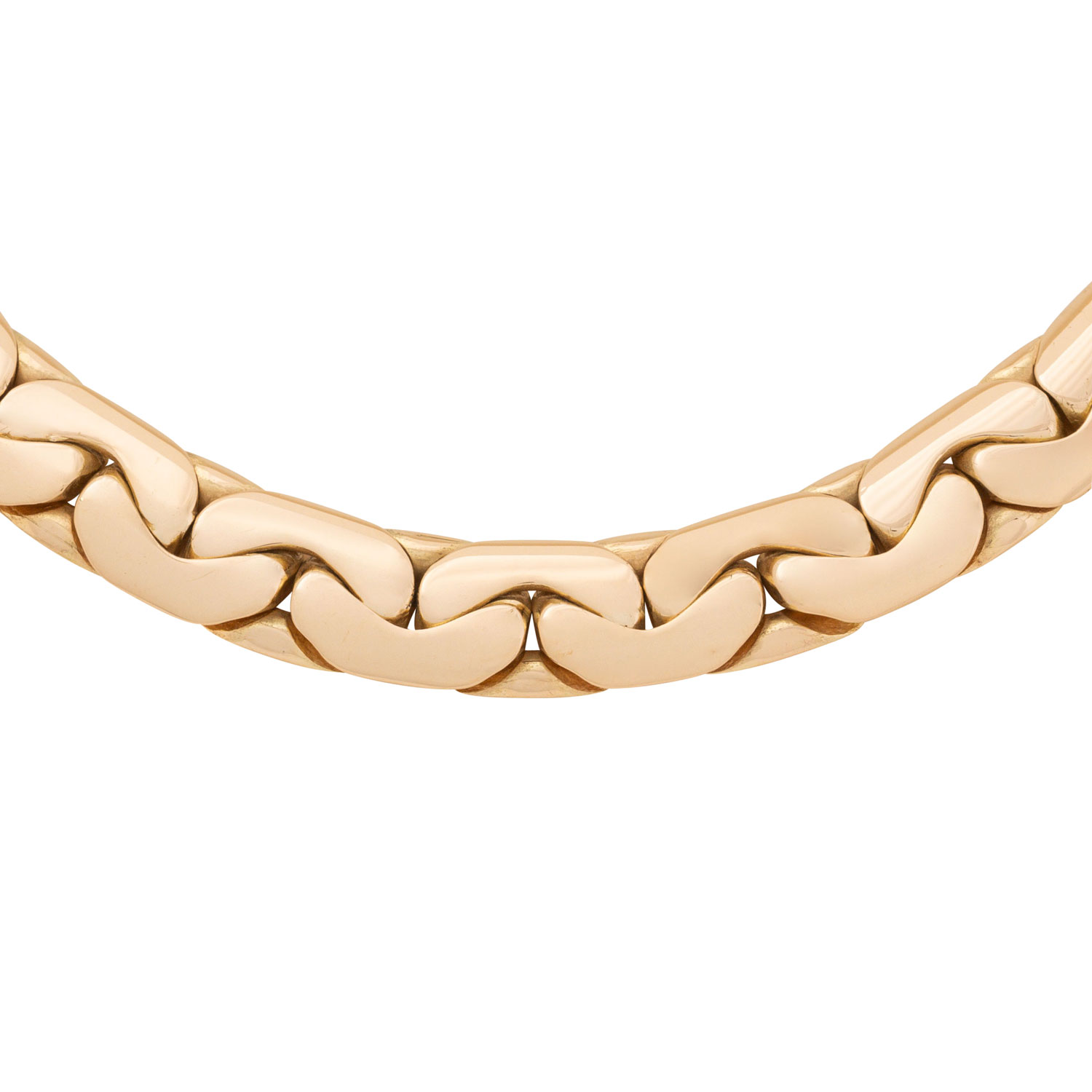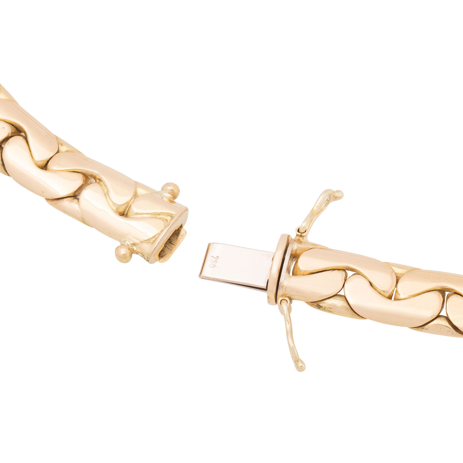 Flat curb link chain, slightly curved ground, 18K yellow gold, 129.3 g, L: 46 cm, W: 8.6 mm, box clasp, 2 security catches 20th/21st century, minor signs of wear.
