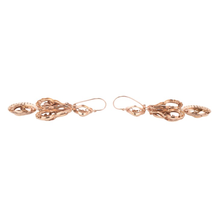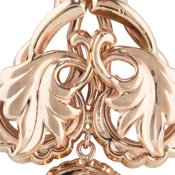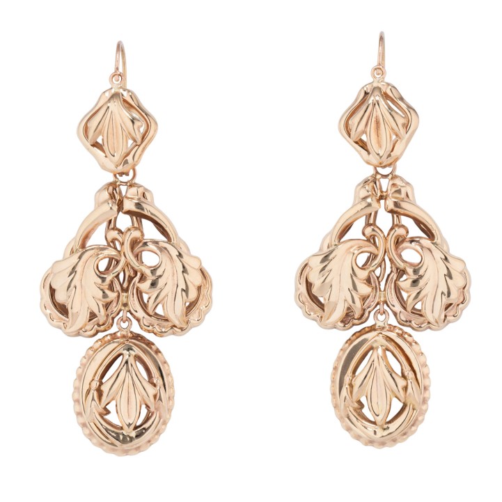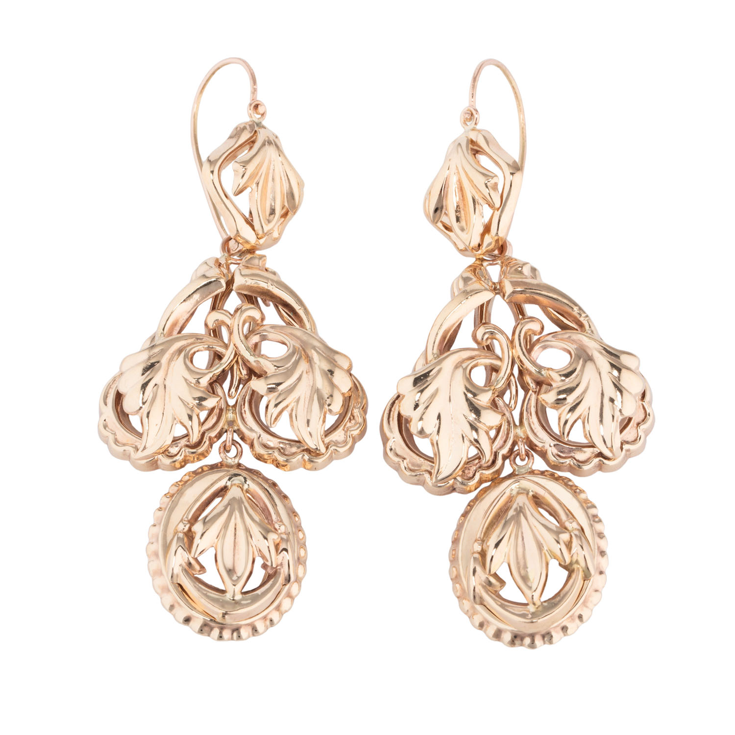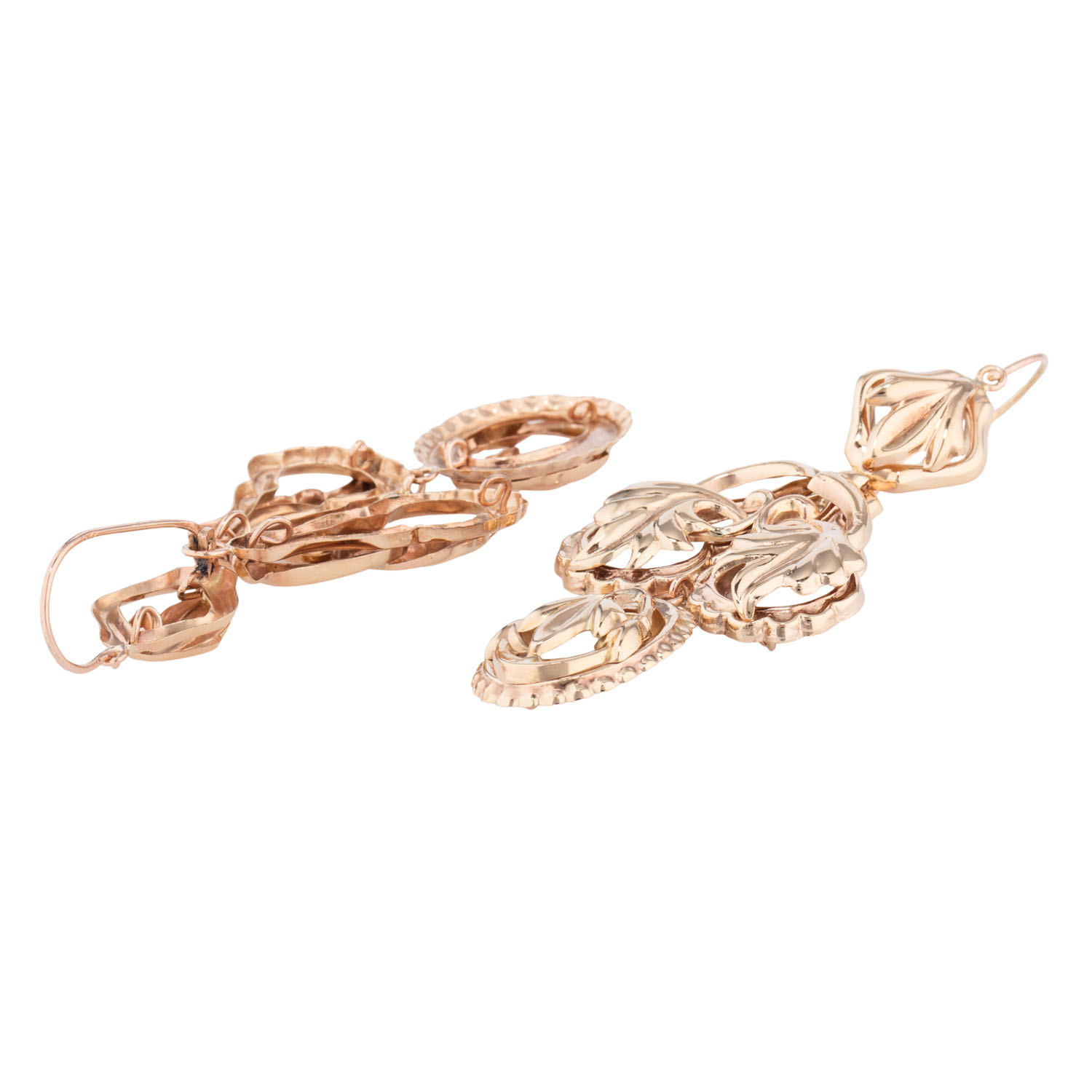 Floral earrings from 12K yellow gold, 13 g, L: 7.5 cm, upper parts also separately wearable, L: 2.5 cm, 20th century, good condition.