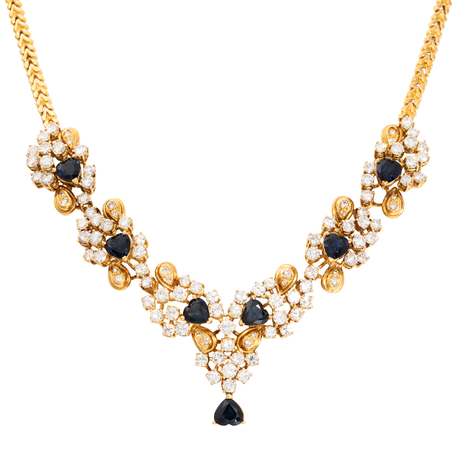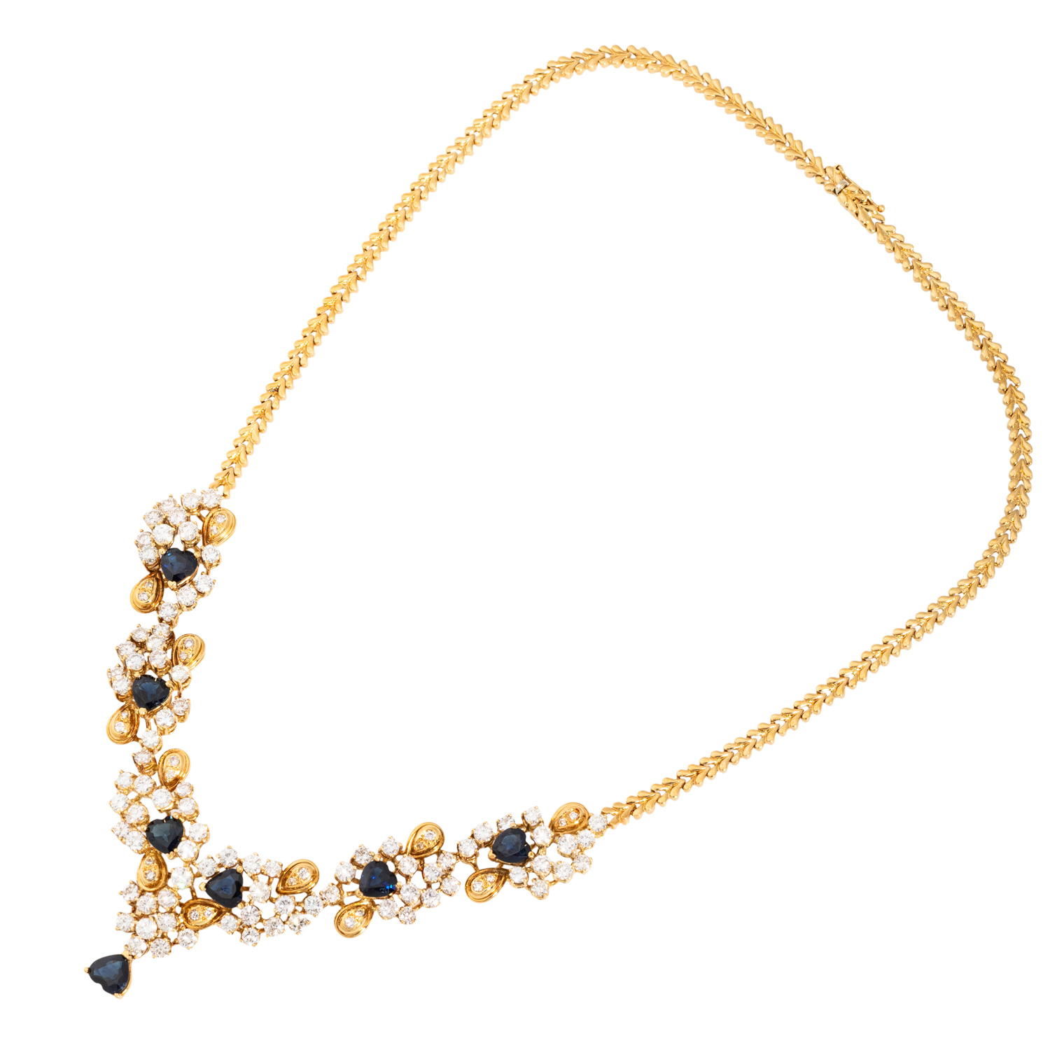 Floral necklace with 7 heart-cut sapphires and brilliant-cut diamonds totalling ca. 9 ct, ca. WHITE (H)/VS, 18K yellow gold, 46 g, L: 42 cm, 2nd half of 20th century, signs of wear, handcrafted.
