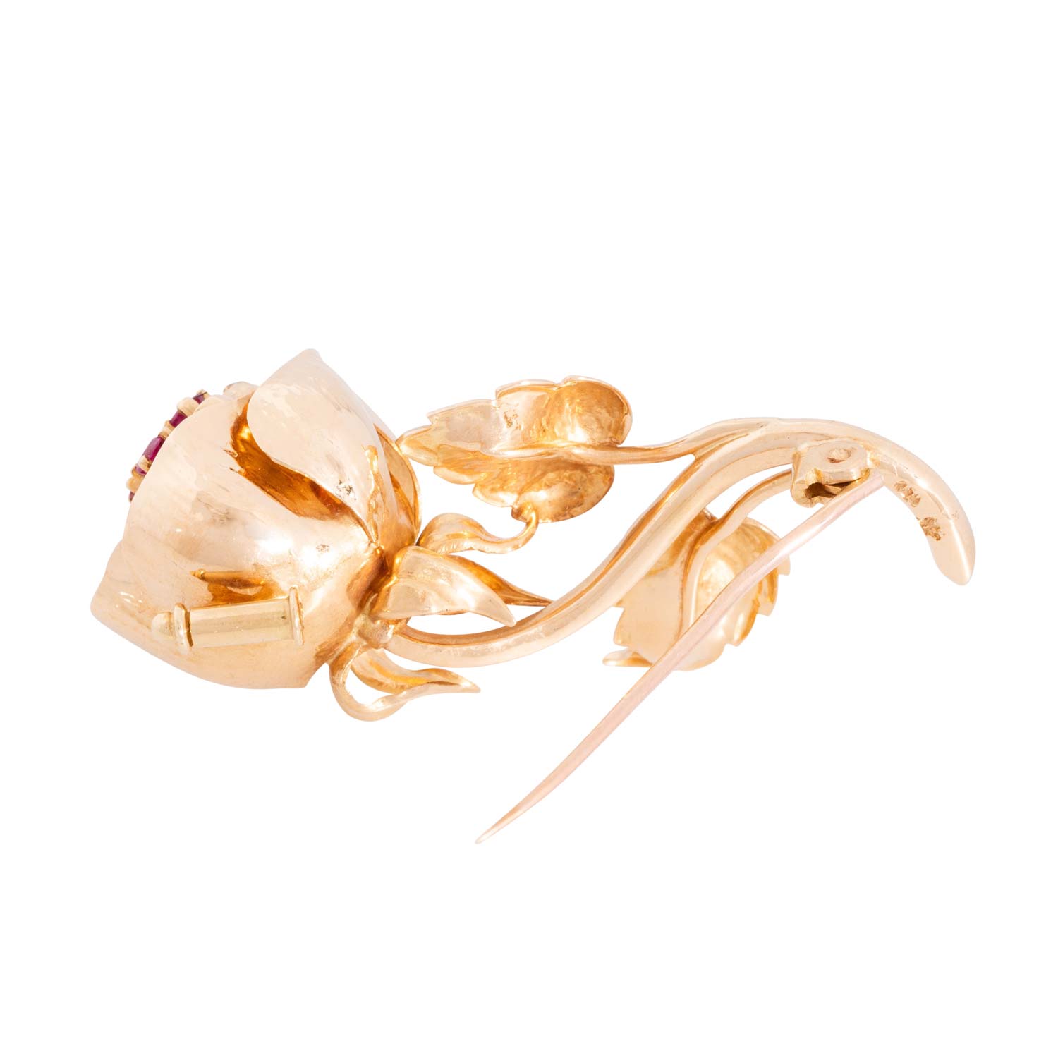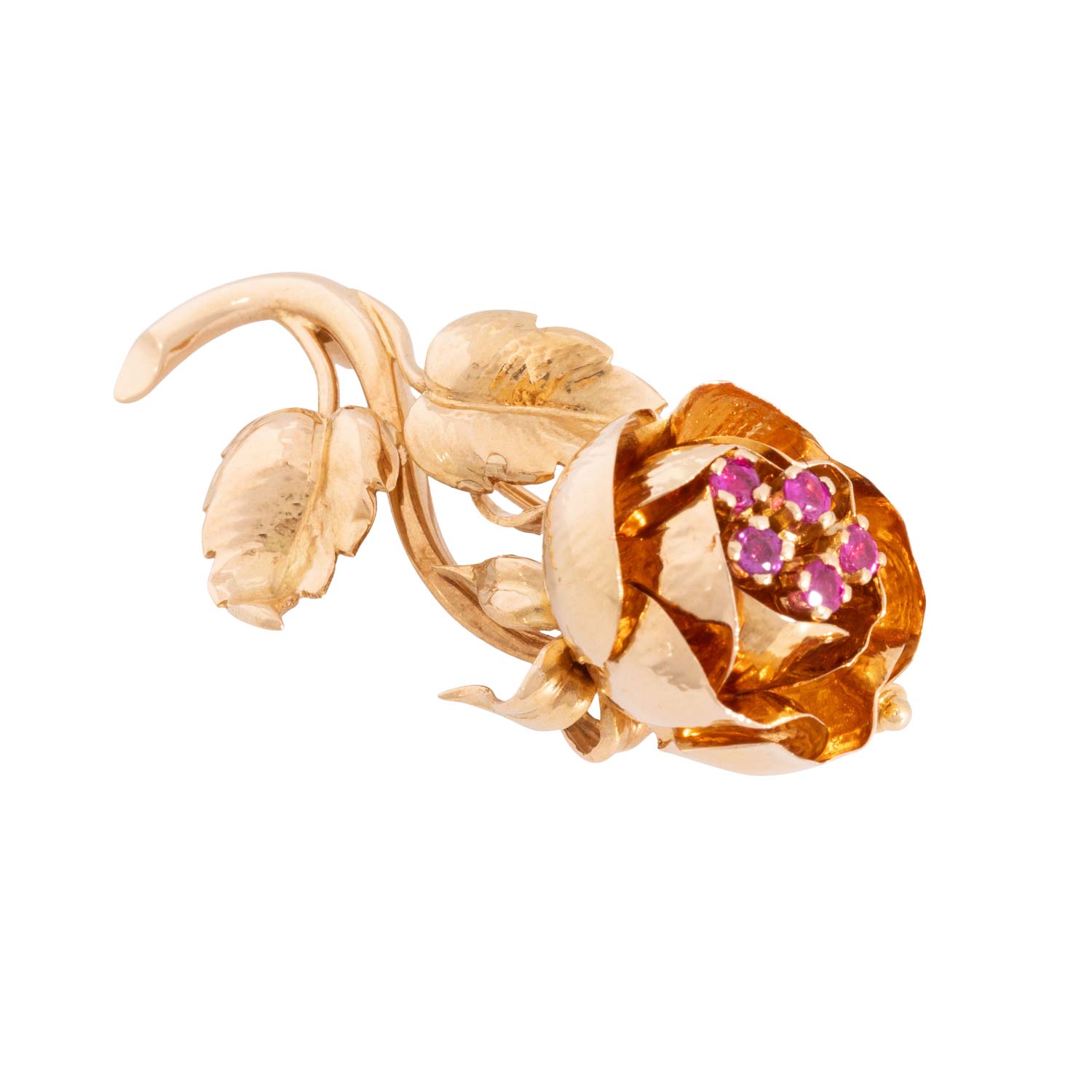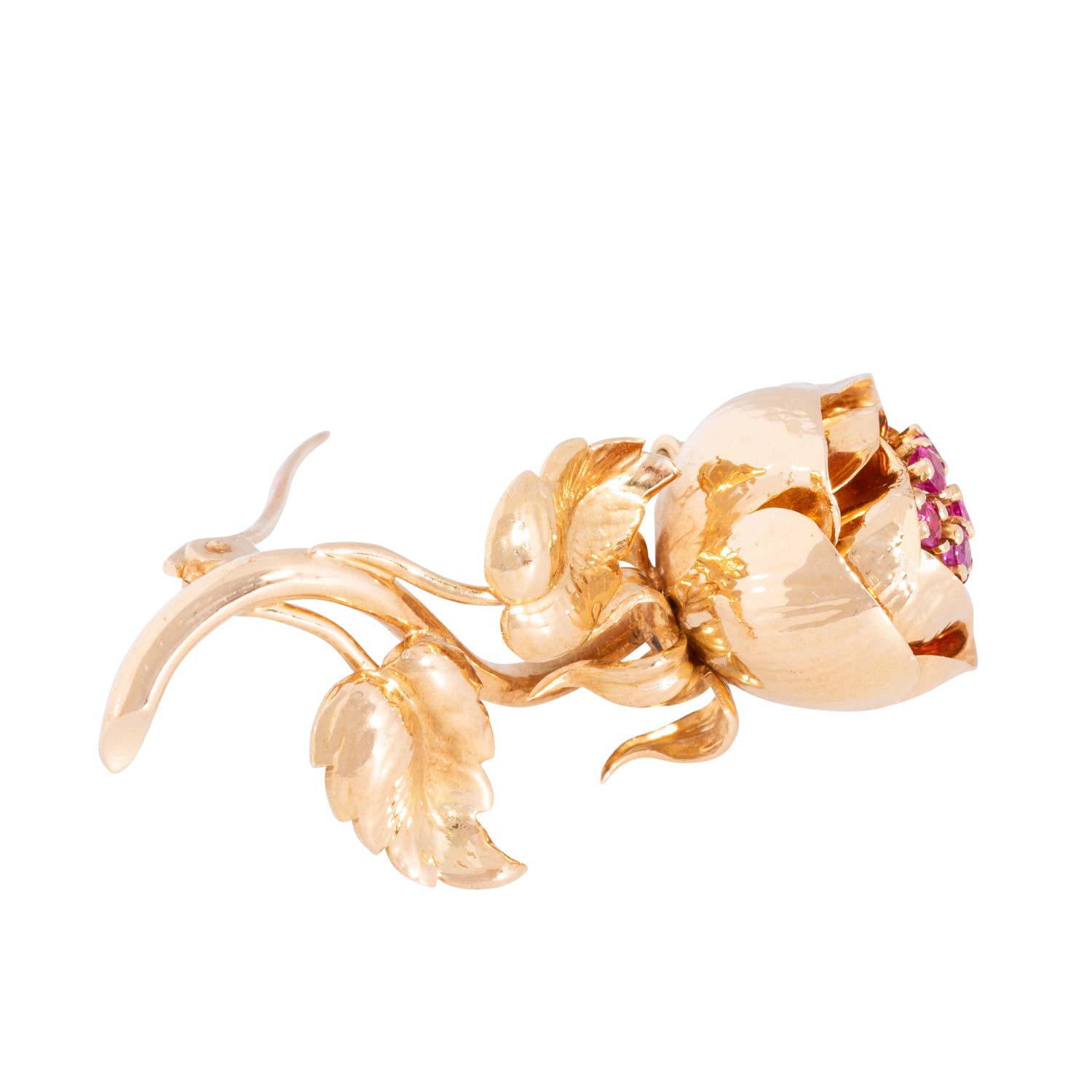 Flower brooch with 5 rubies, round faceted, 2,5 mm, 14K yellow gold, 11.2 g, L x W: 20 x 45 mm, late 20th century, minimal signs of wear.