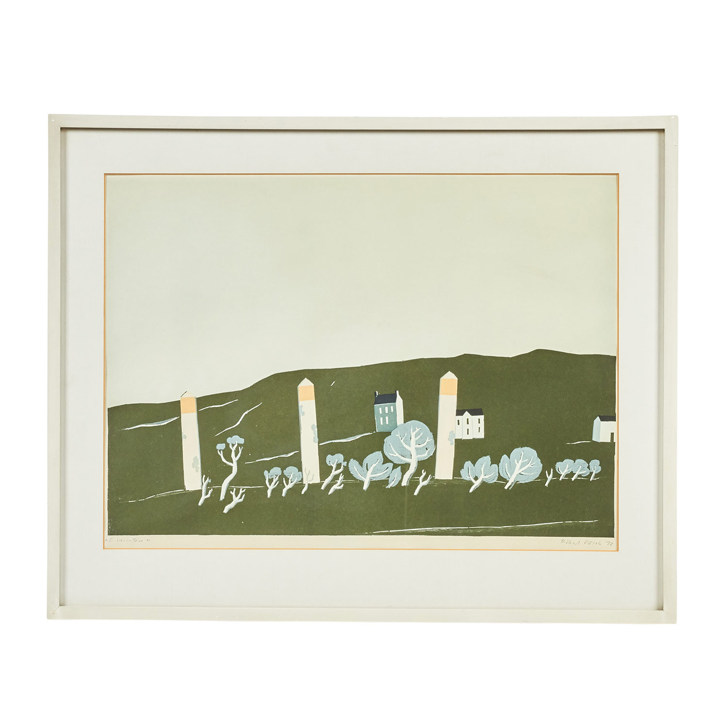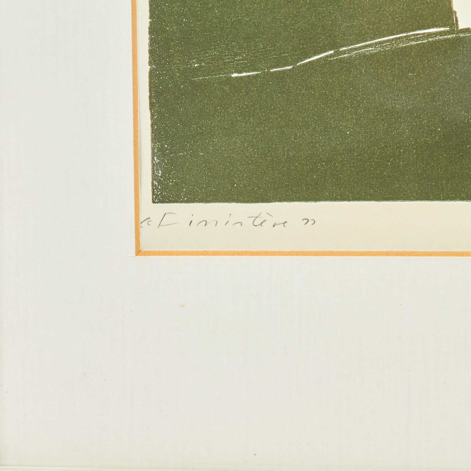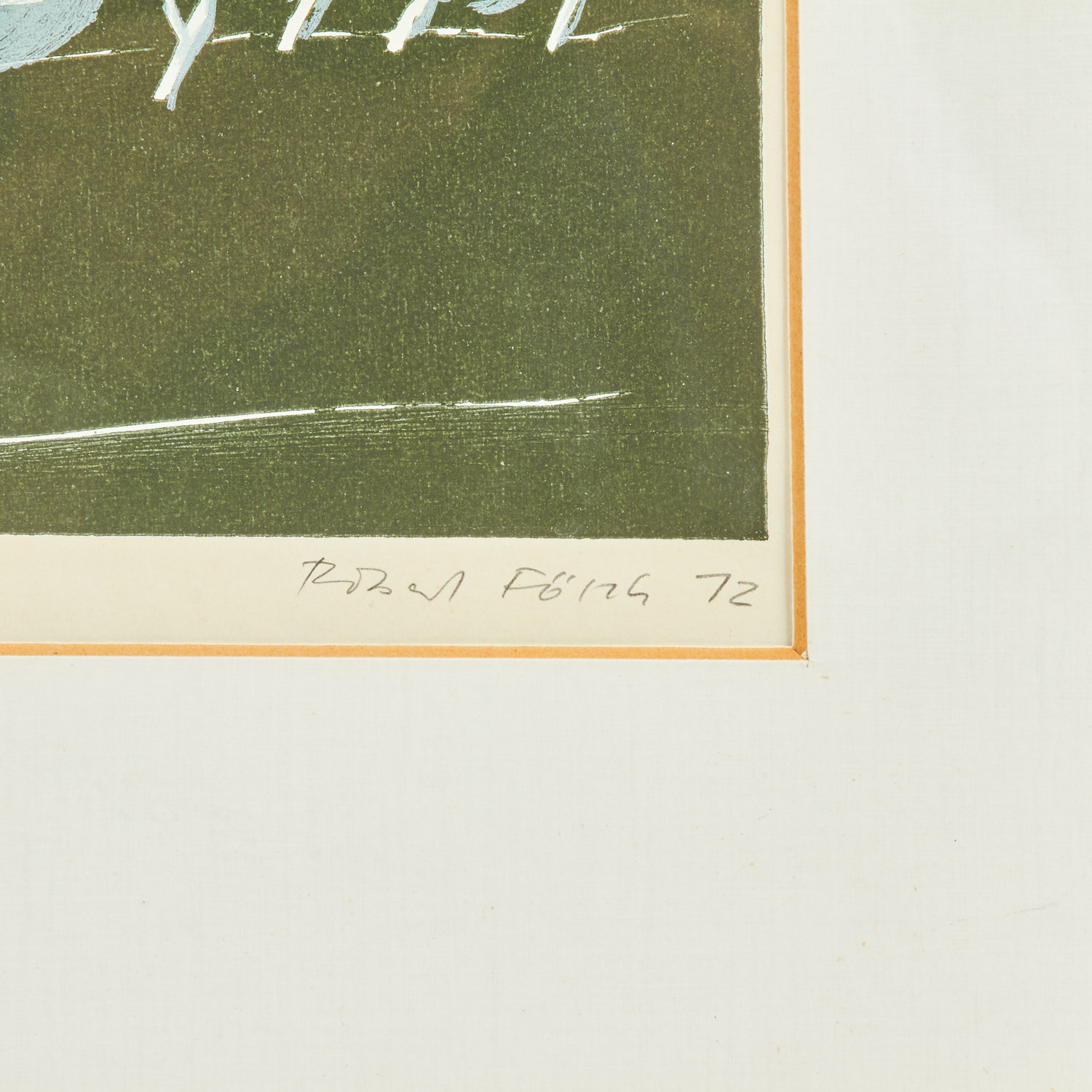 FÖRCH, ROBERT (born 1931), "Finistére", color woodcut/chamois paper, u.r. with blst. signed by hand a. dat. (19)72, titled lower left with sheet, HxW: plate dimensions approx. 40.5x58 cm, mat opening approx. 43x58.5 cm, outer frame dimensions approx. 57.5x72 cm. Min. browned. Framed behind glass in passepartout. Traces of age.