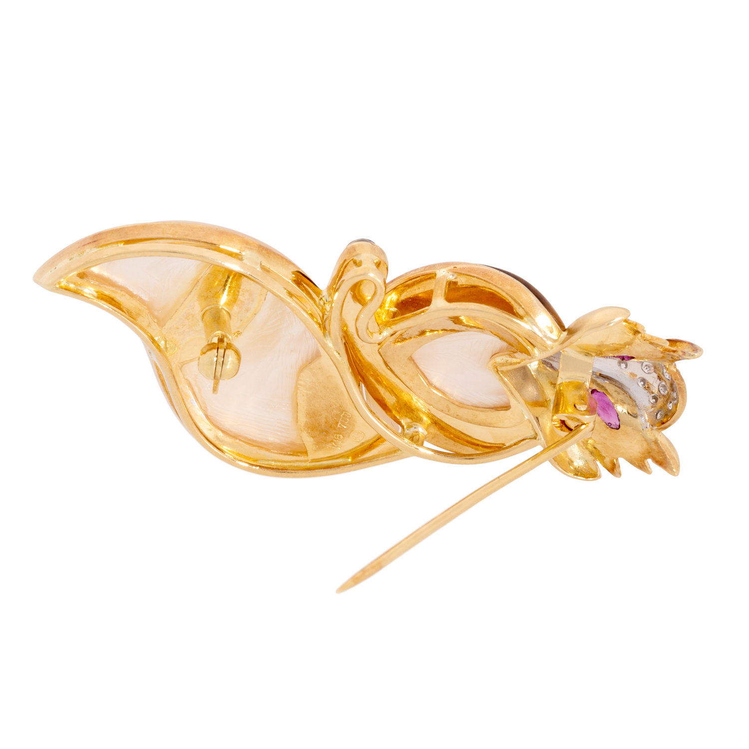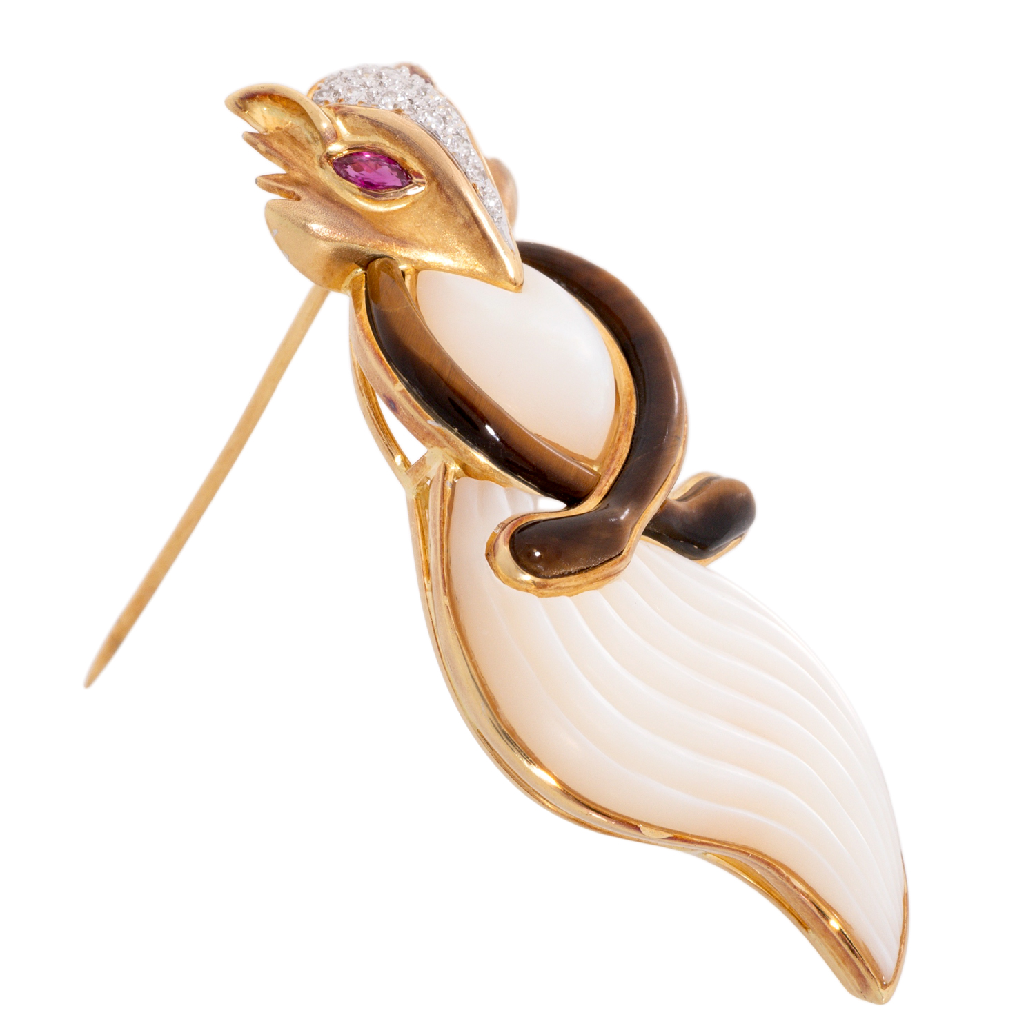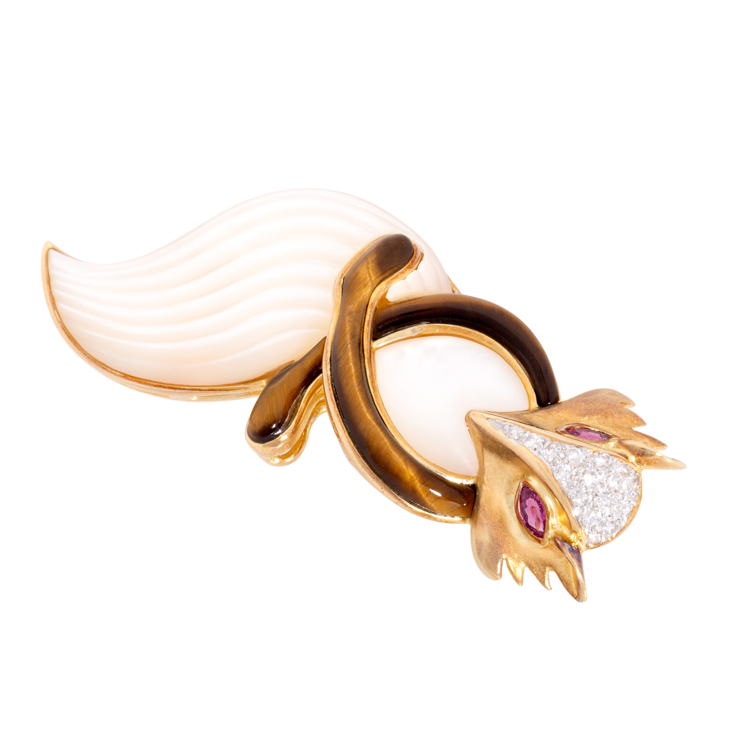 Brooch 'Fox', 2 navette cut rubies (as eyes), 17 brilliant cut diamonds (set in front), totalling ap. 0.17 ct, good colour and clarity, inlay out of tiger eye and mother of pearl, 18K yellow gold, 17.0 g, L x W: 56 x 25 mm, 2nd half of 20th century, minimal signs of wear, high quality goldsmith work.