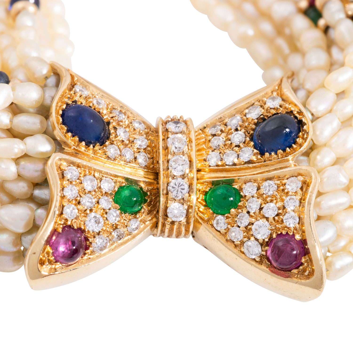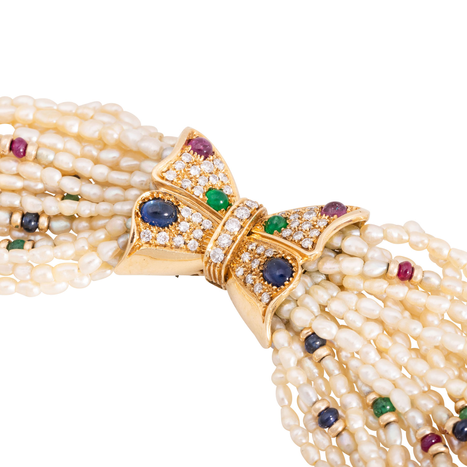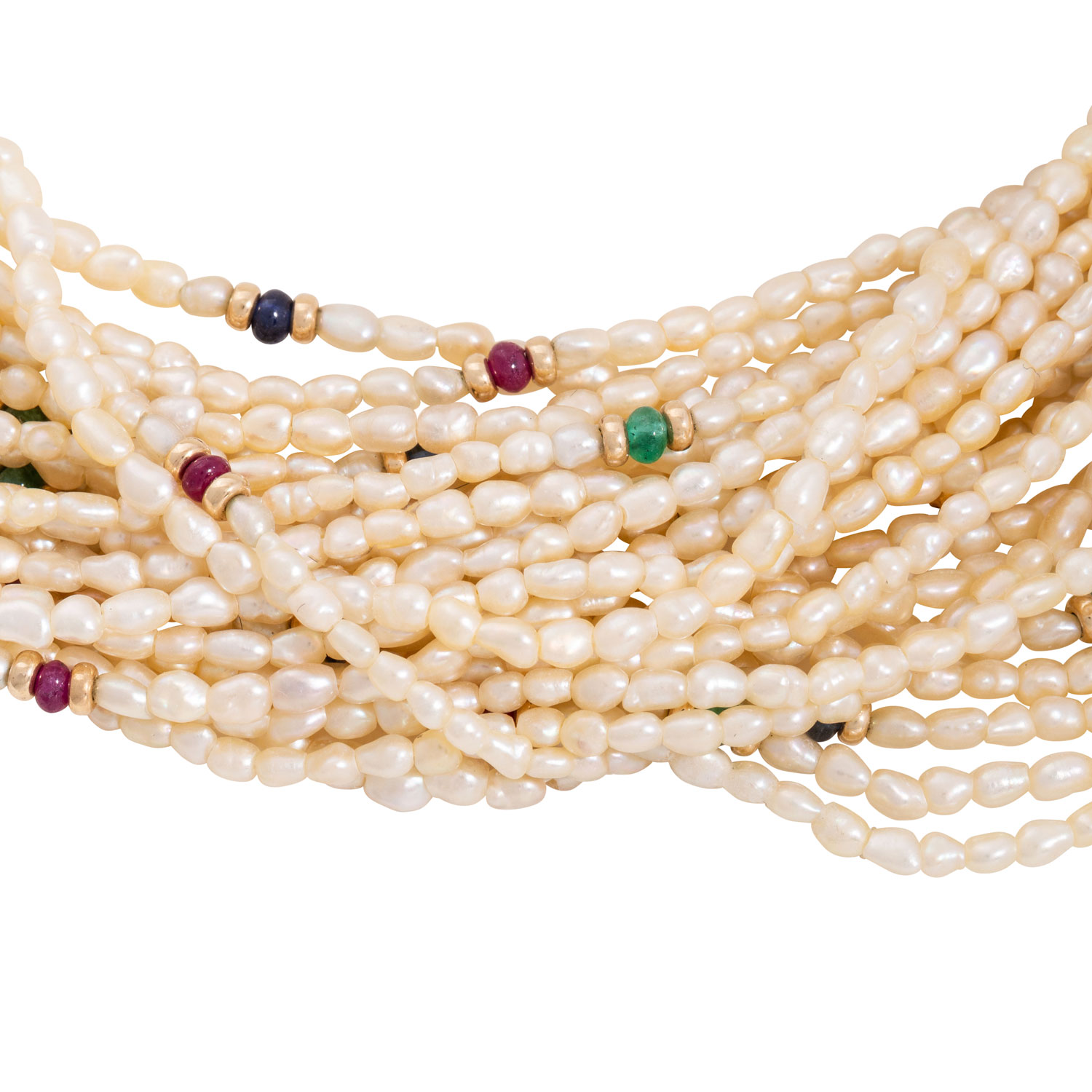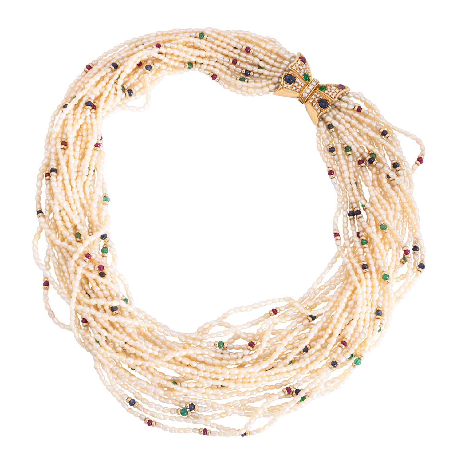 Necklace freshwaterpearls with clasp 'Butterfly', pavé setting with 47 brilliant cut diamonds, totalling ap. 0.55 ct, ap. FW F-G)/VS, 2 ruby, 2 emerals, 2 sapphire cabochons, 24 rows rice grain pearls, ap. 3 - 3.5 mm, interjacent 32 ruby, 31 emerals and 46 sapphire beads, D: 2 mm, and 158 gold parts, total wheigt 87,1 g, L overall 43.5 cm, late 20th century, minimal signs of wear.