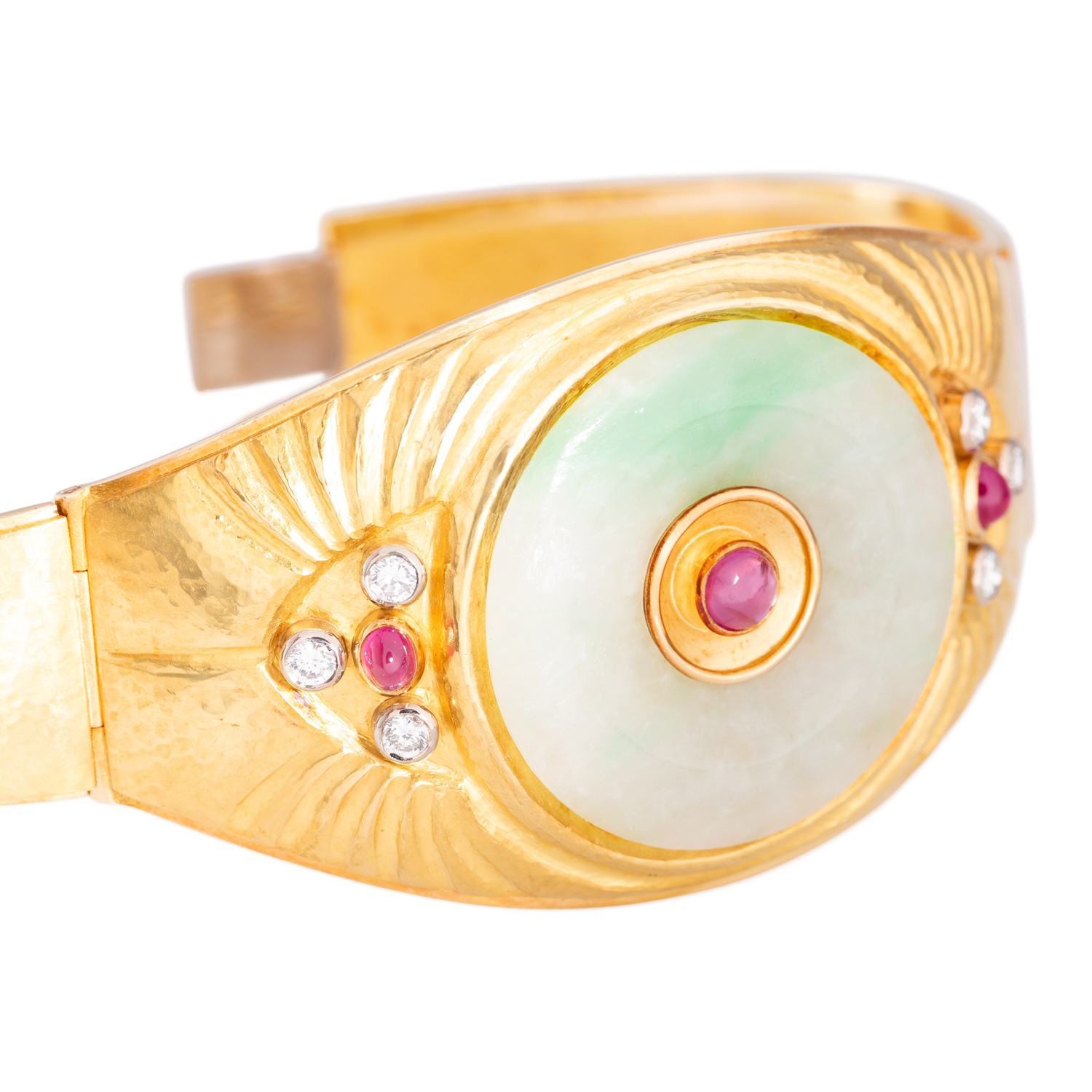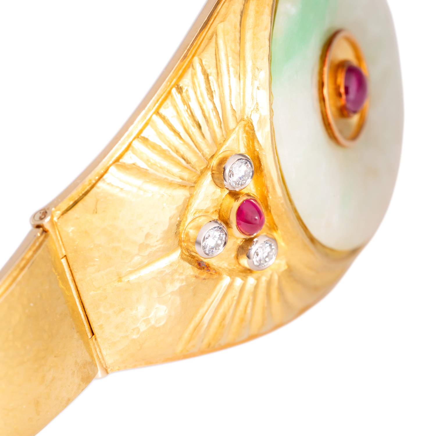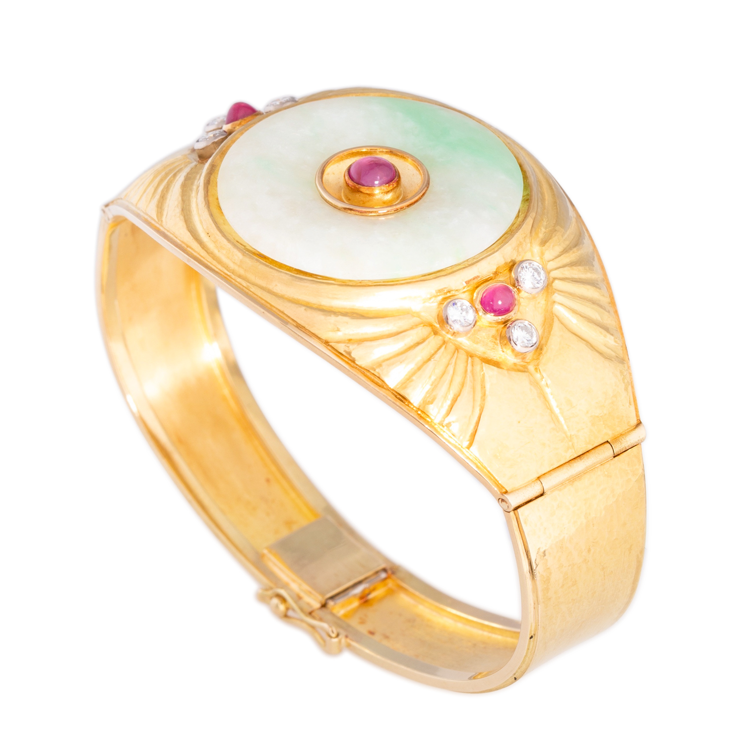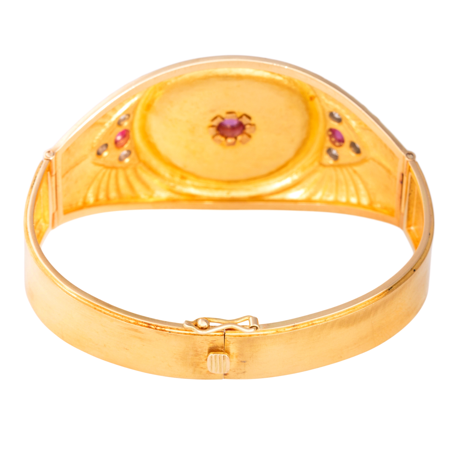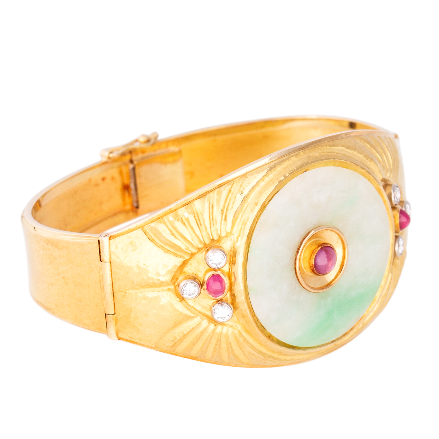 FRIES ARAUNER bangle with jadeite, ruby cabochons and small brilliant-cut diamonds totalling ca. 0.30 ct, very good colour a. clarity, 18K YG, 39.2 g, inner circumference ca. 16 cm, 20th/21st century, minor signs of wear, handcrafted.