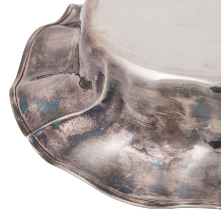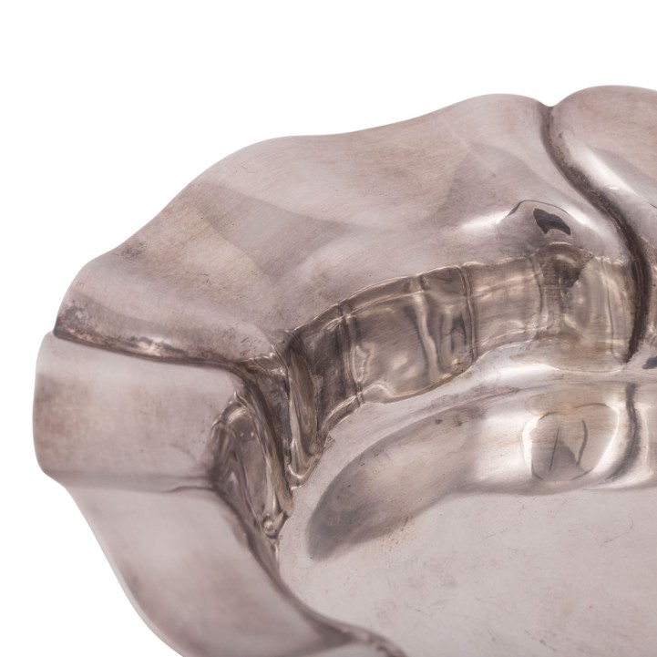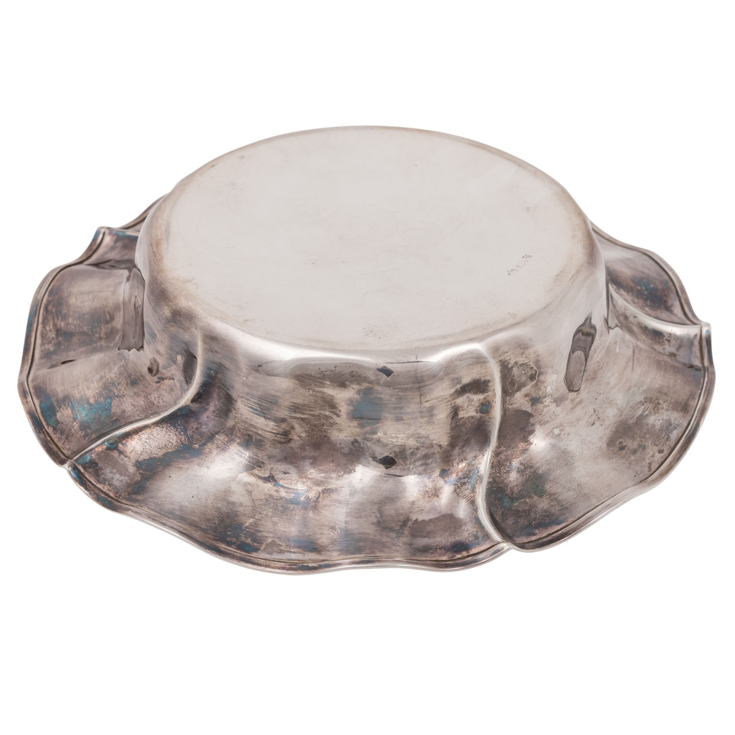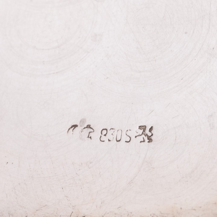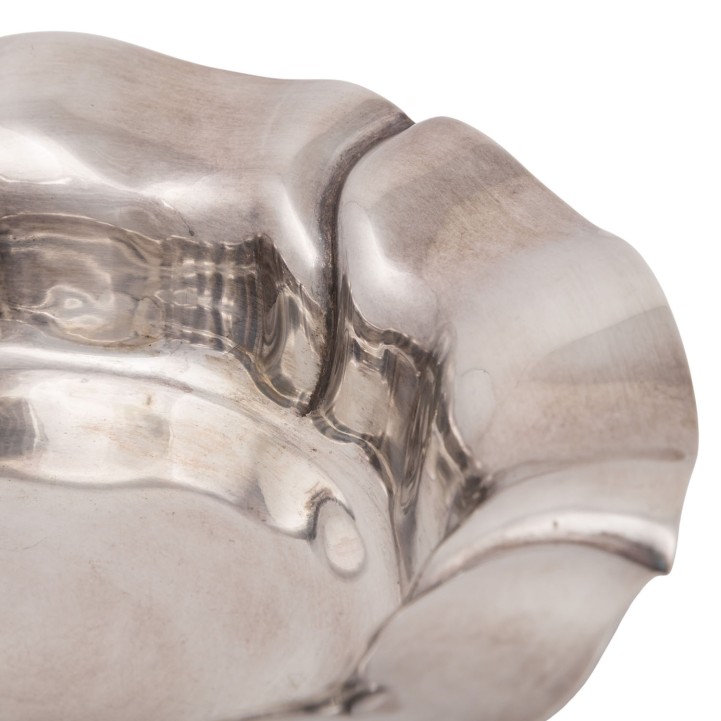 GEBRÜDER DEYHLE Small bowl, 830 silver, 20th century, round shape with sweeping, curved rim, diameter approx. 20 cm, marked with crescent moon, crown, 830, makers mark, weight approx. 171 g. Signs of age and use. Some scratch marks. Inscription on outer wall: “Christmas 1952.”