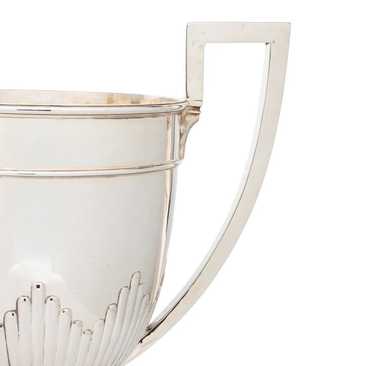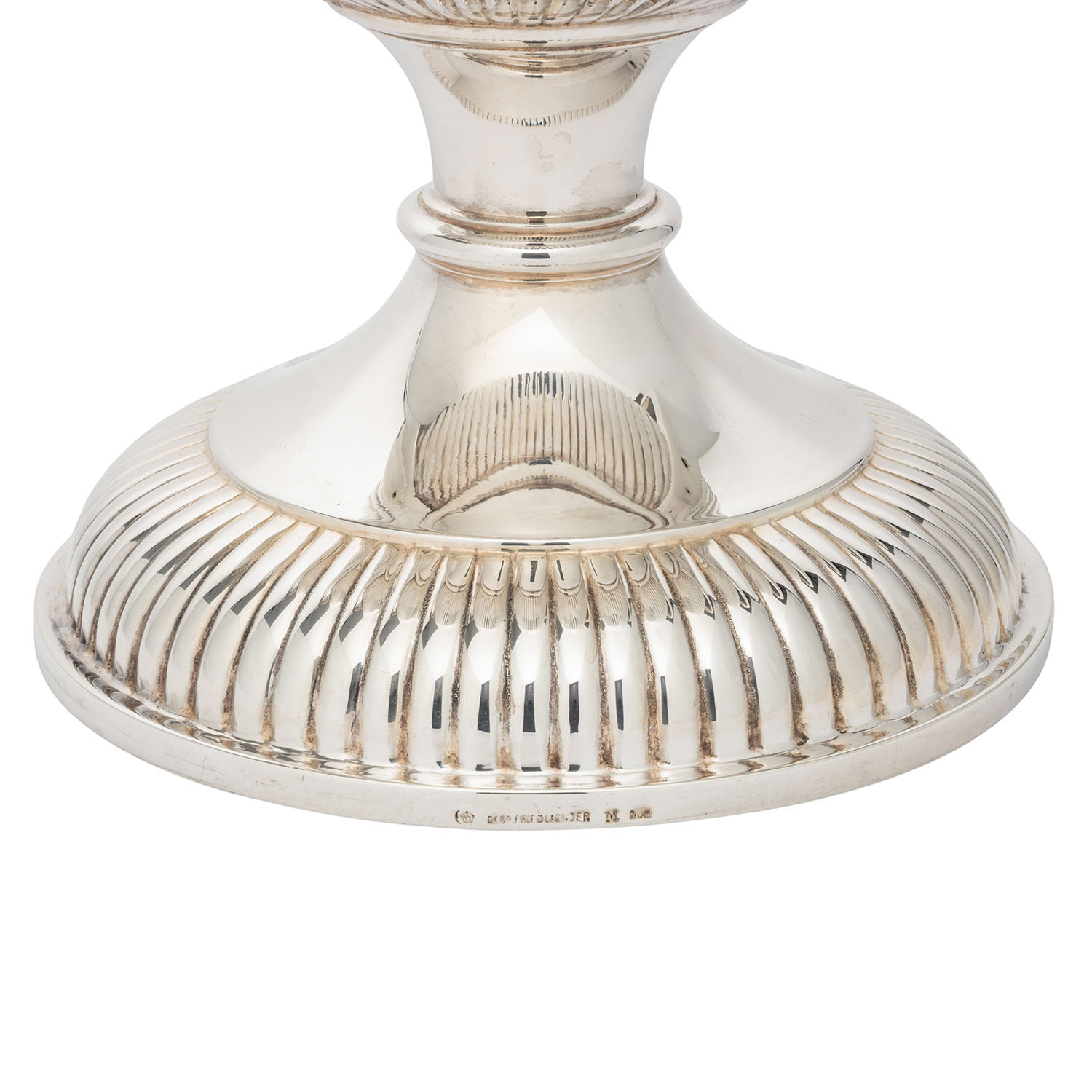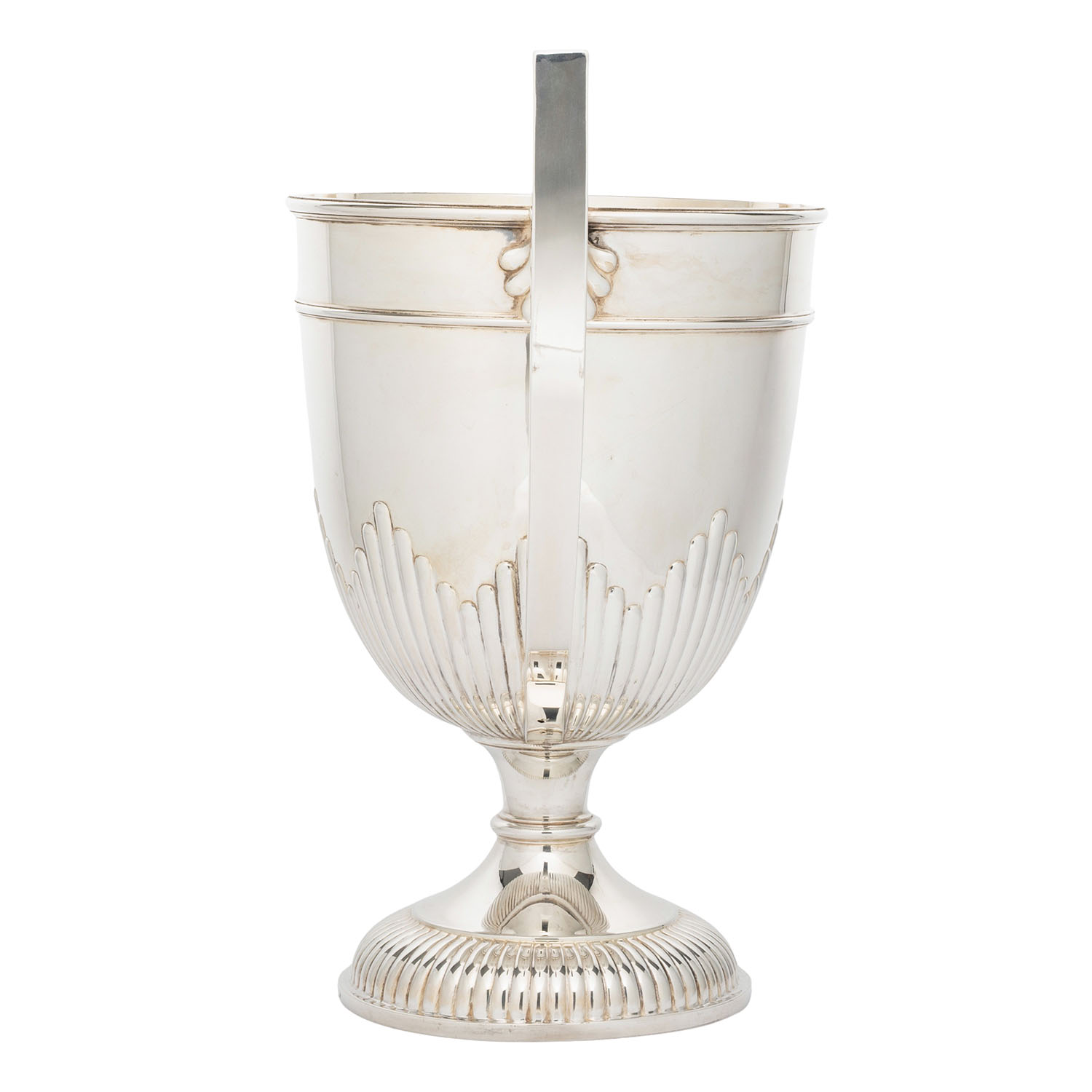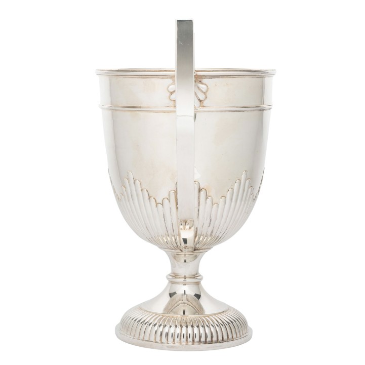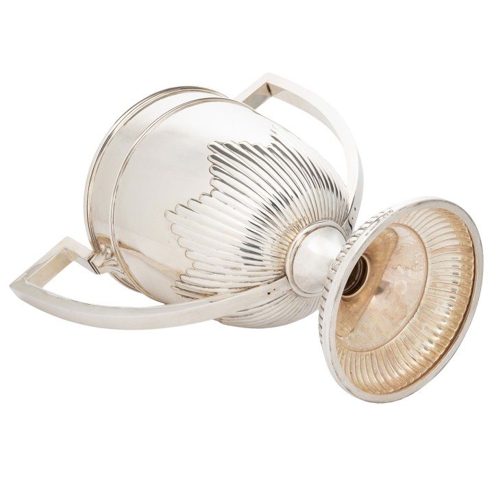 GEBRÜDER FRIEDLÄNDER (purveyor to the court), Berlin, large champagne cooler, 800 silver, around 1920/30. Large, cup-shaped champagne cooler with fluting and raised handles, hallmarked with a crescent moon, crown and GEBR. FRIEDLÄNDER, M and 800, height approx. 42 cm, weight approx. 2,297 g. Signs of age and use.