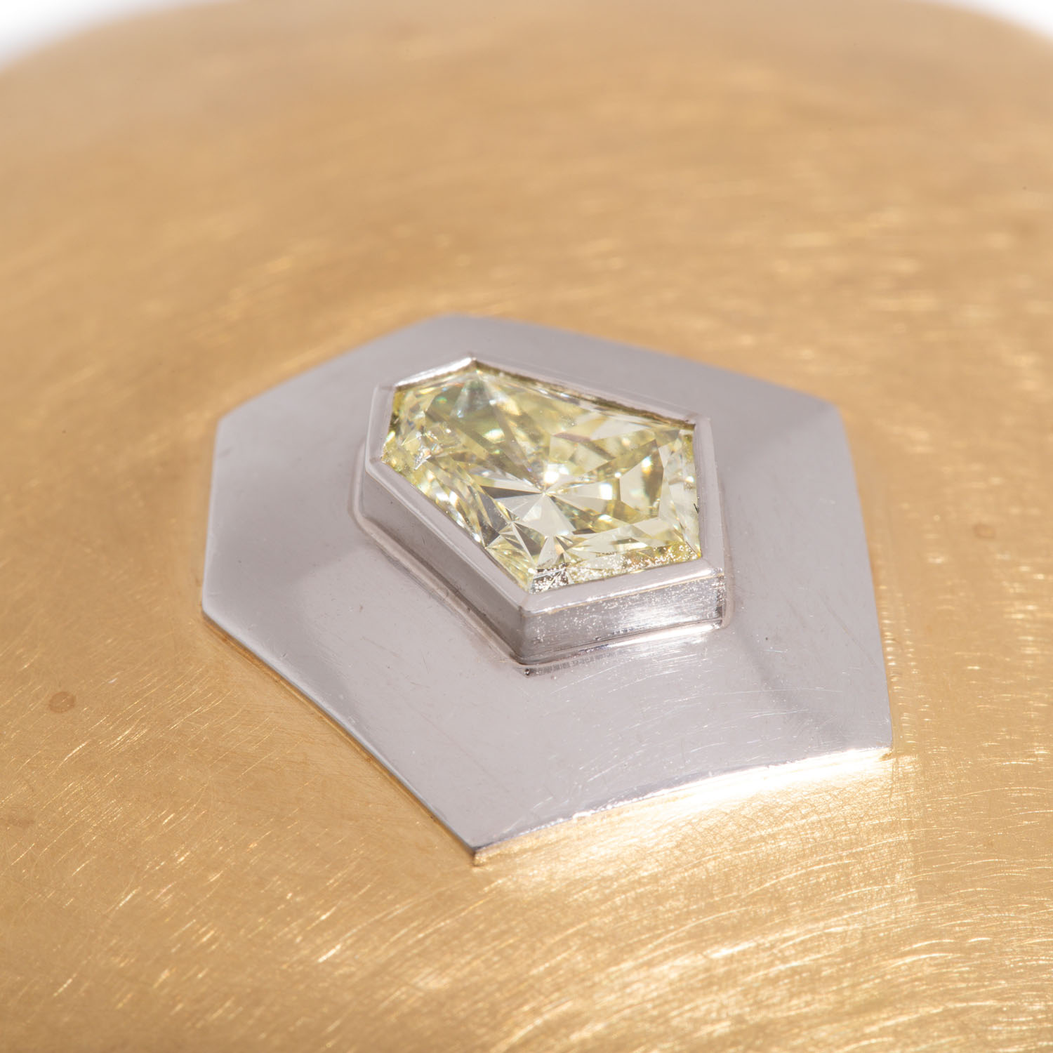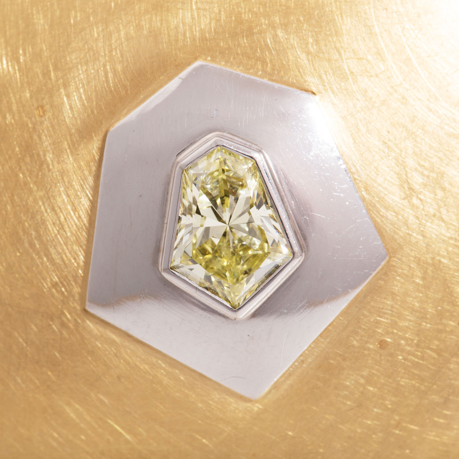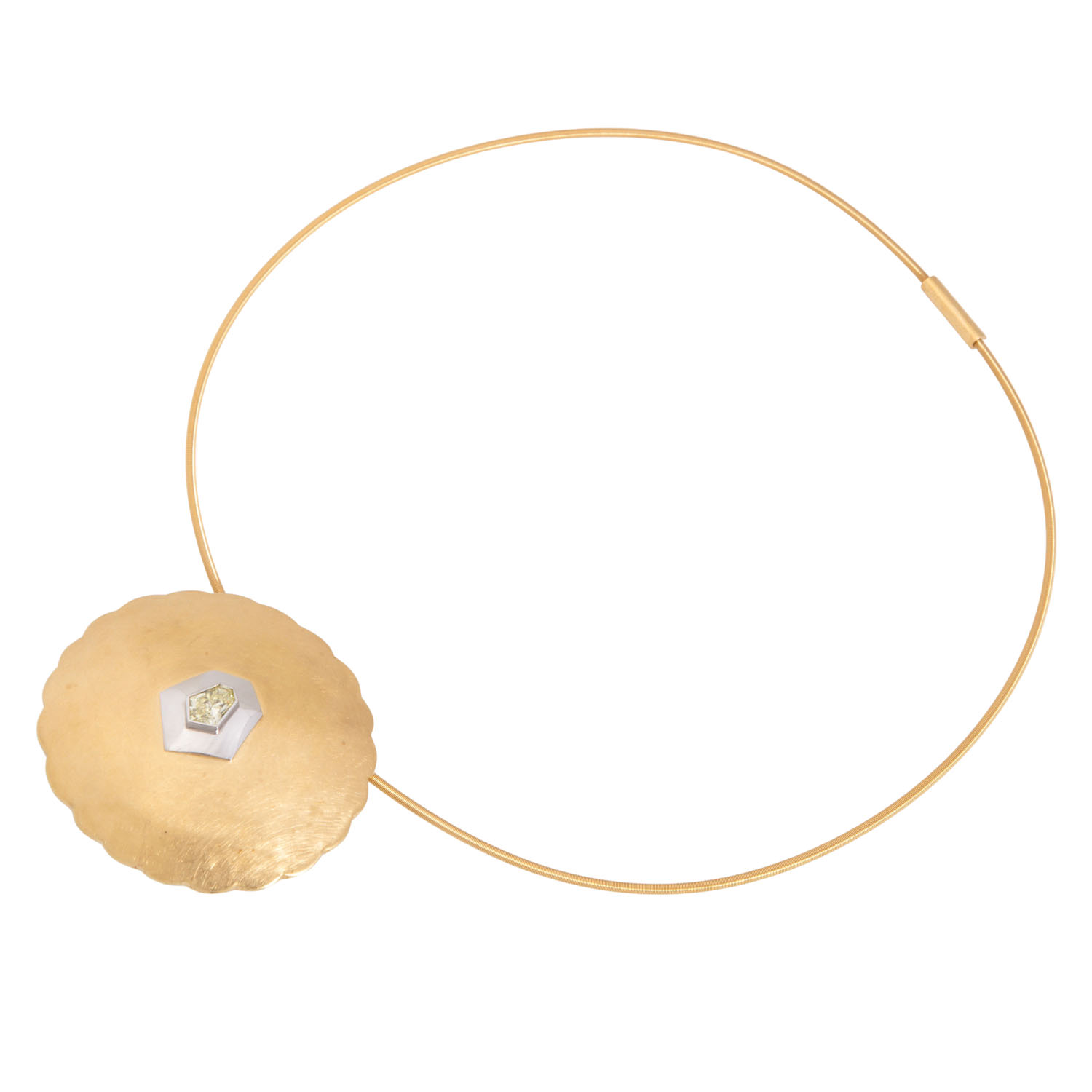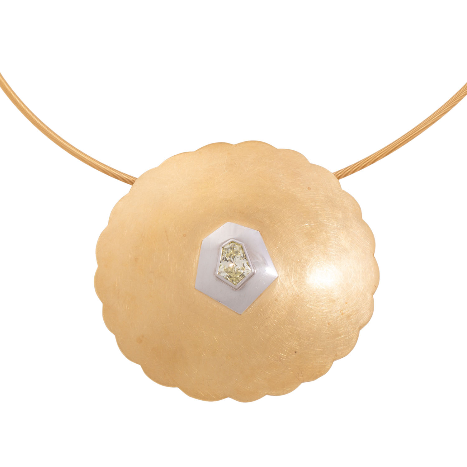 GEORG SPRENG unique pendant with hexagonal fantasy-cut diamond ca. 1 ct, NATURAL YELLOW/I1, 18K yellow gold and platinum, 5.7x5 cm, with NIESSING necklace L: 45 cm, 18K yellow gold, 36 g, 1993, good condition, with maker's sign, designed and handcrafted for DE BEERS competition 'Facets of Fantasy' 1993, model 'Flower Roundelay'.