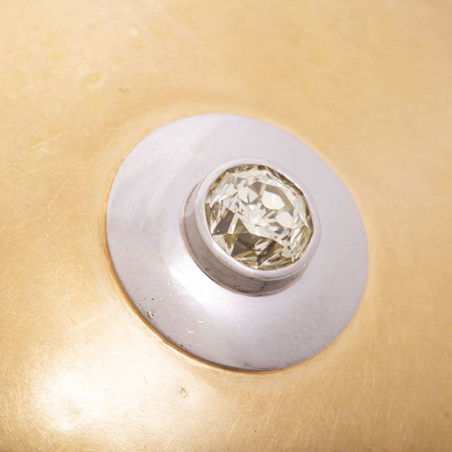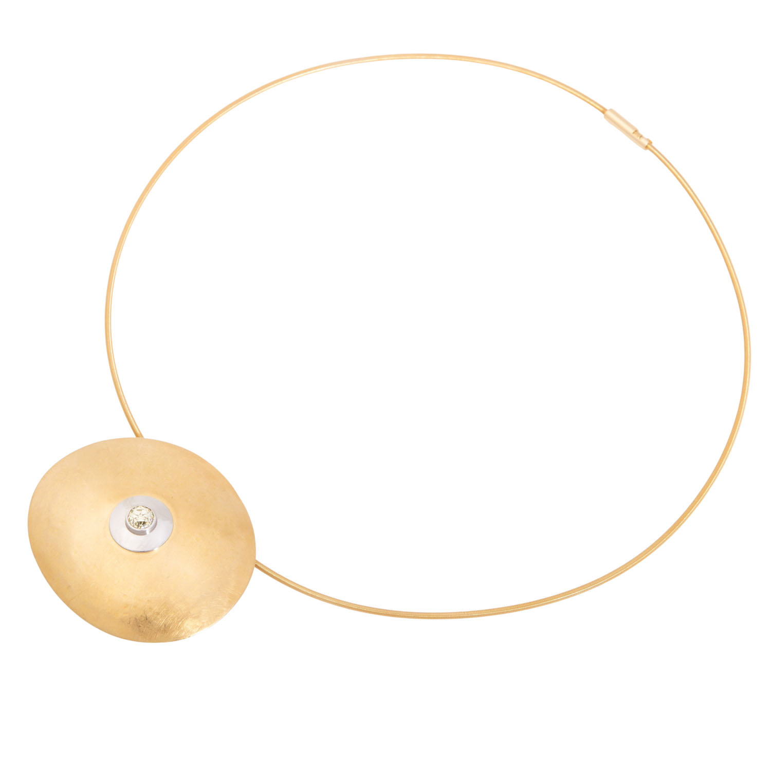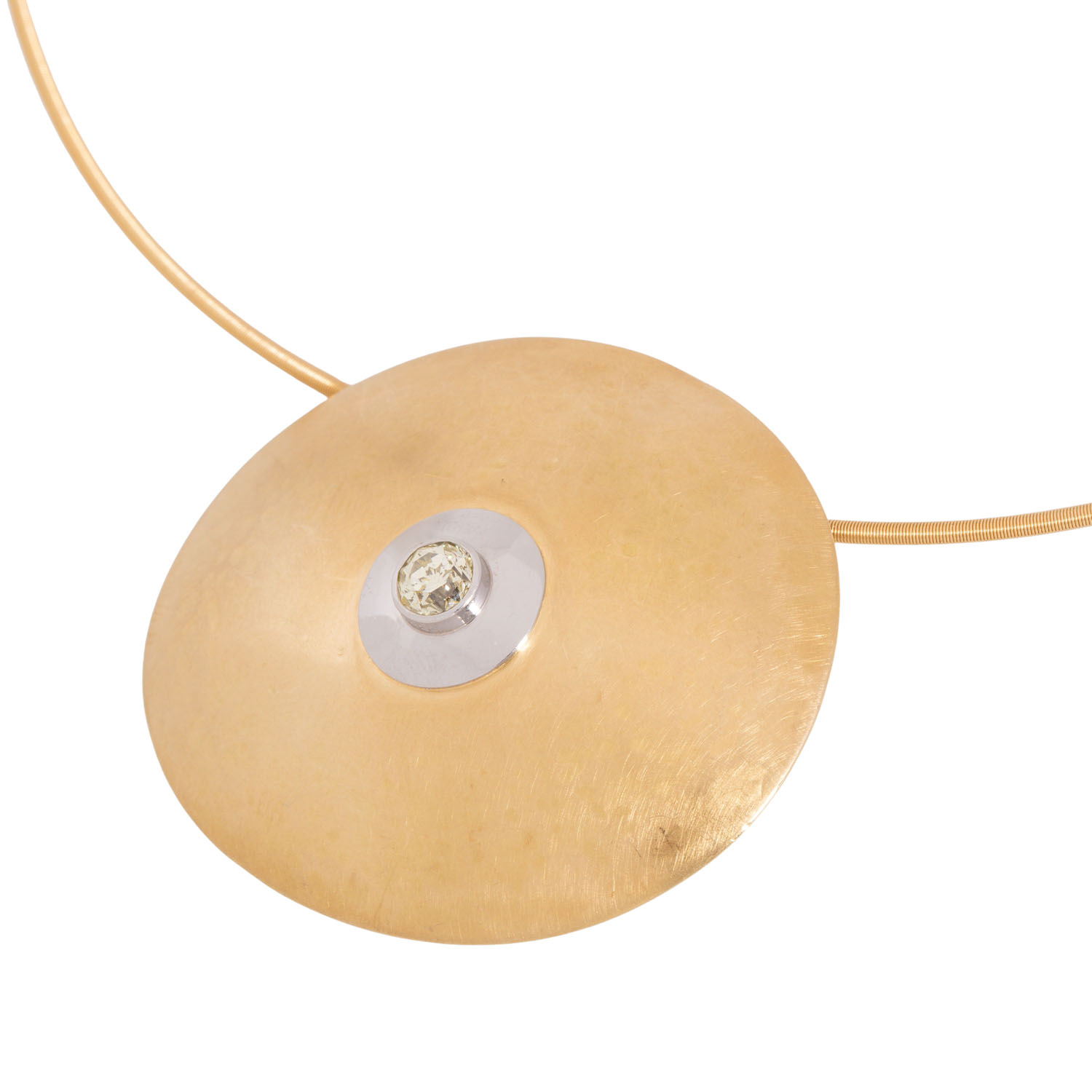GEORG SPRENG unique pendant with round fantasy-cut diamond 'Flowerstar' ca. 1 ct, YELLOW/VS, 18K yellow gold and platinum, 5.7x5 cm, with NIESSING necklace L: 50 cm, 18K yellow gold, 36.4 g, 1993, good condition, with maker's sign, designed and handcrafted for DE BEERS competition 'Facets of Fantasy' 1993, model 'Flower Roundelay'.