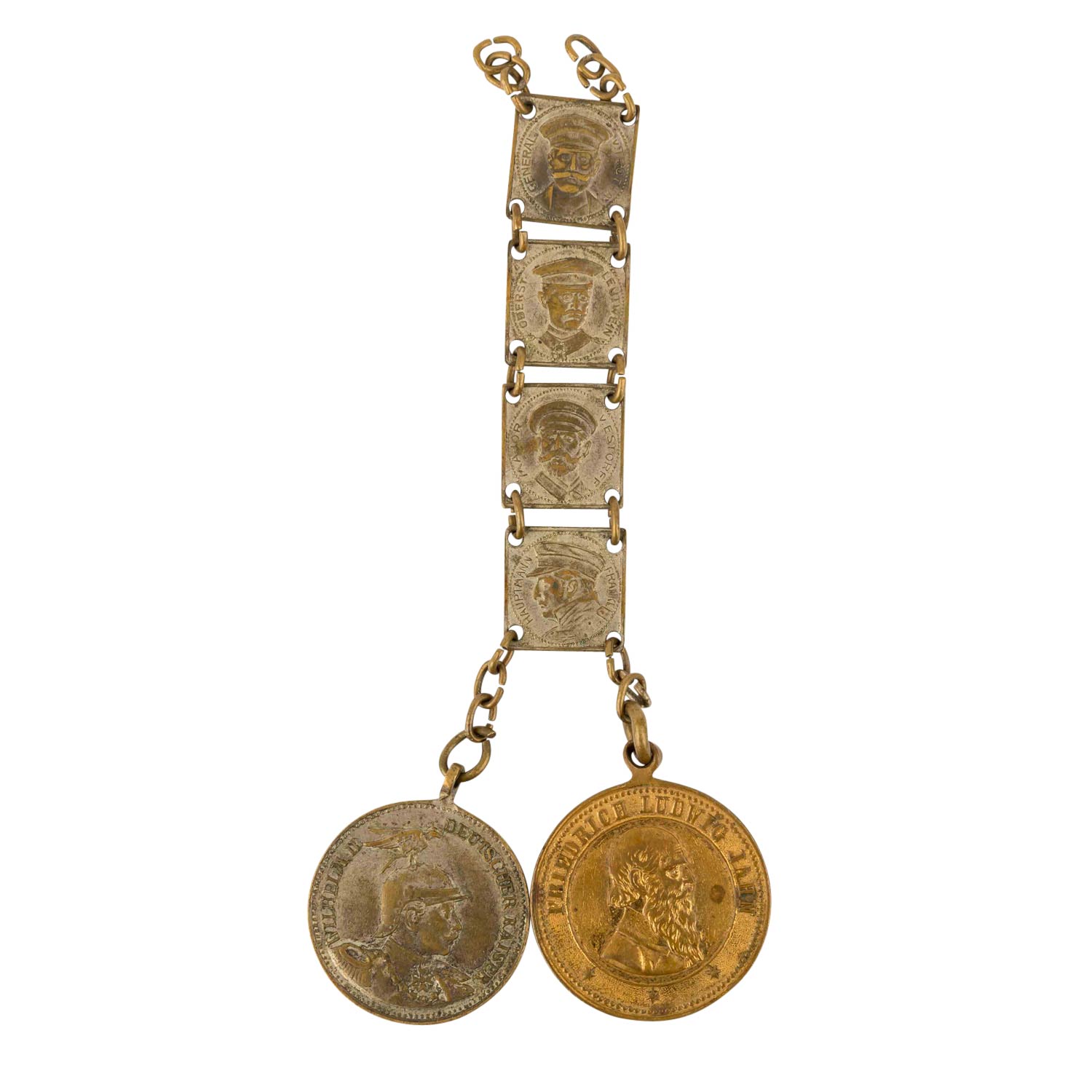 German Empire/Prussia - Commemorative medal for the uprisings in German Southwest Africa around 1915, attached to a four-part picture chain with scenes from the uprisings, on the reverse portraits of Prussian commanders. Also attached to this chain 1 x bronze medal of the German Gymnastics Federation with portrait of Friedrich Ludwig Jahn n.d. (around 1910). Signs of age and wear.