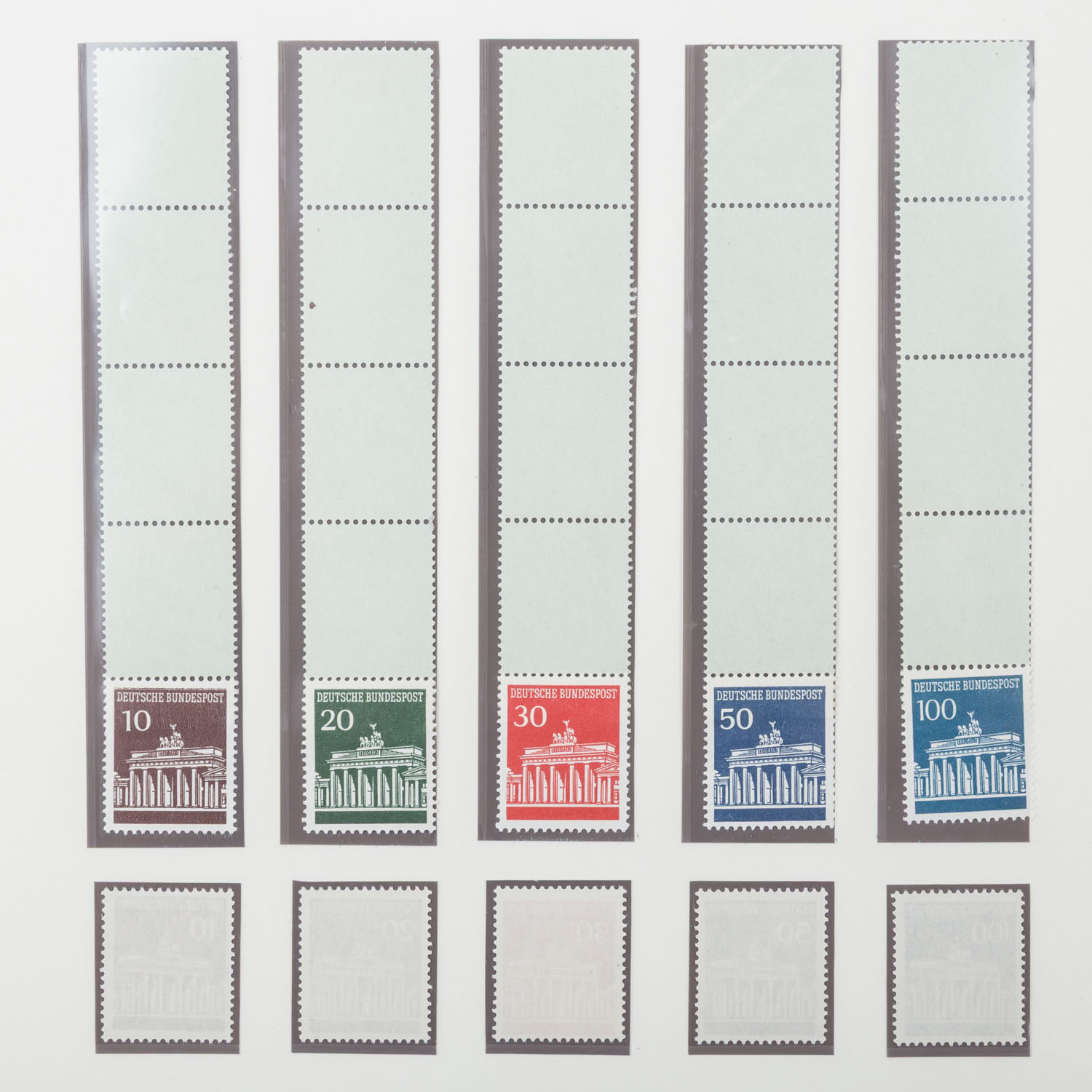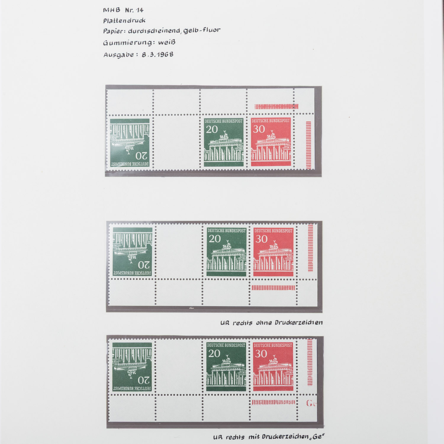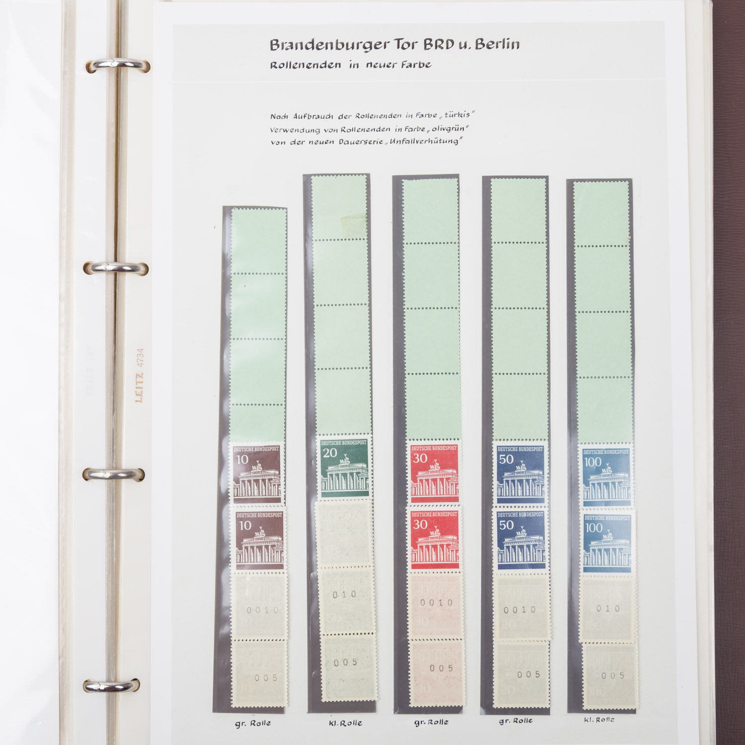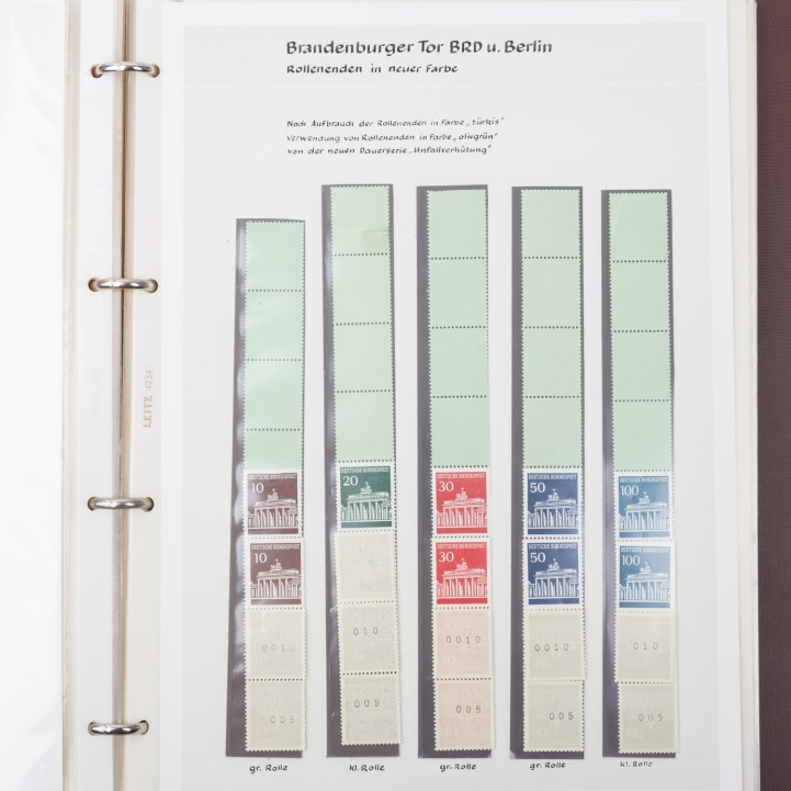 Germany 1930–74. Extensive collection “Brandenburg Gate” mounted on sheets in 6 albums for exhibition purposes. Focus on Brandenburg Gate issues from the federal government and Berlin with all variants, such as stamp booklets, roll stamps, end strips, DZ, imperials, FDC, postal stationery, private postal stationery, first flights, letters of necessity, etc., as well as other issues on the same theme.