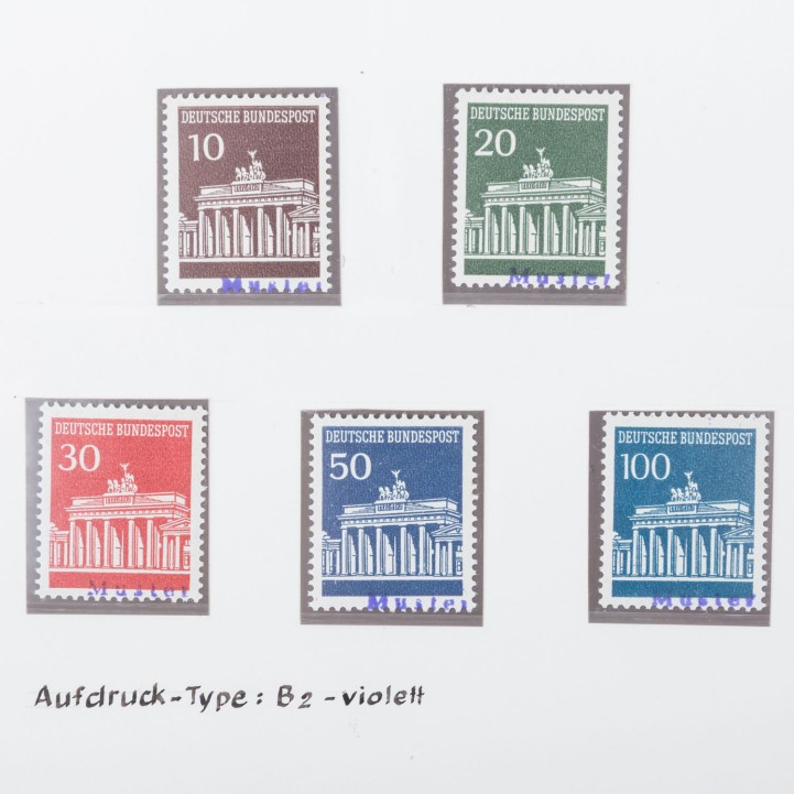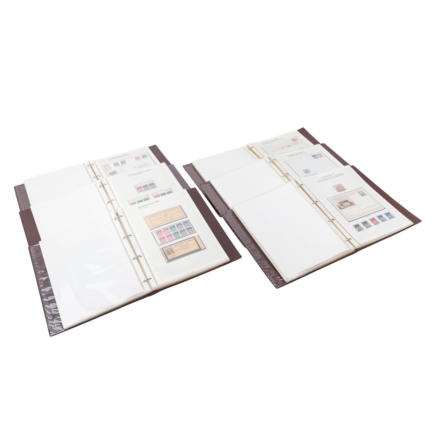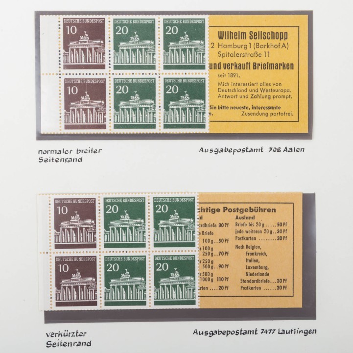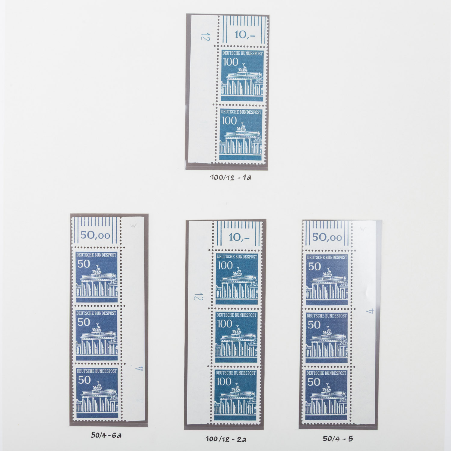 Germany 1930–74. Extensive collection “Brandenburg Gate” mounted on sheets in 6 albums for exhibition purposes. Focus on Brandenburg Gate issues from the federal government and Berlin with all variants, such as stamp booklets, roll stamps, end strips, DZ, imperials, FDC, postal stationery, private postal stationery, first flights, letters of necessity, etc., as well as other issues on the same theme.