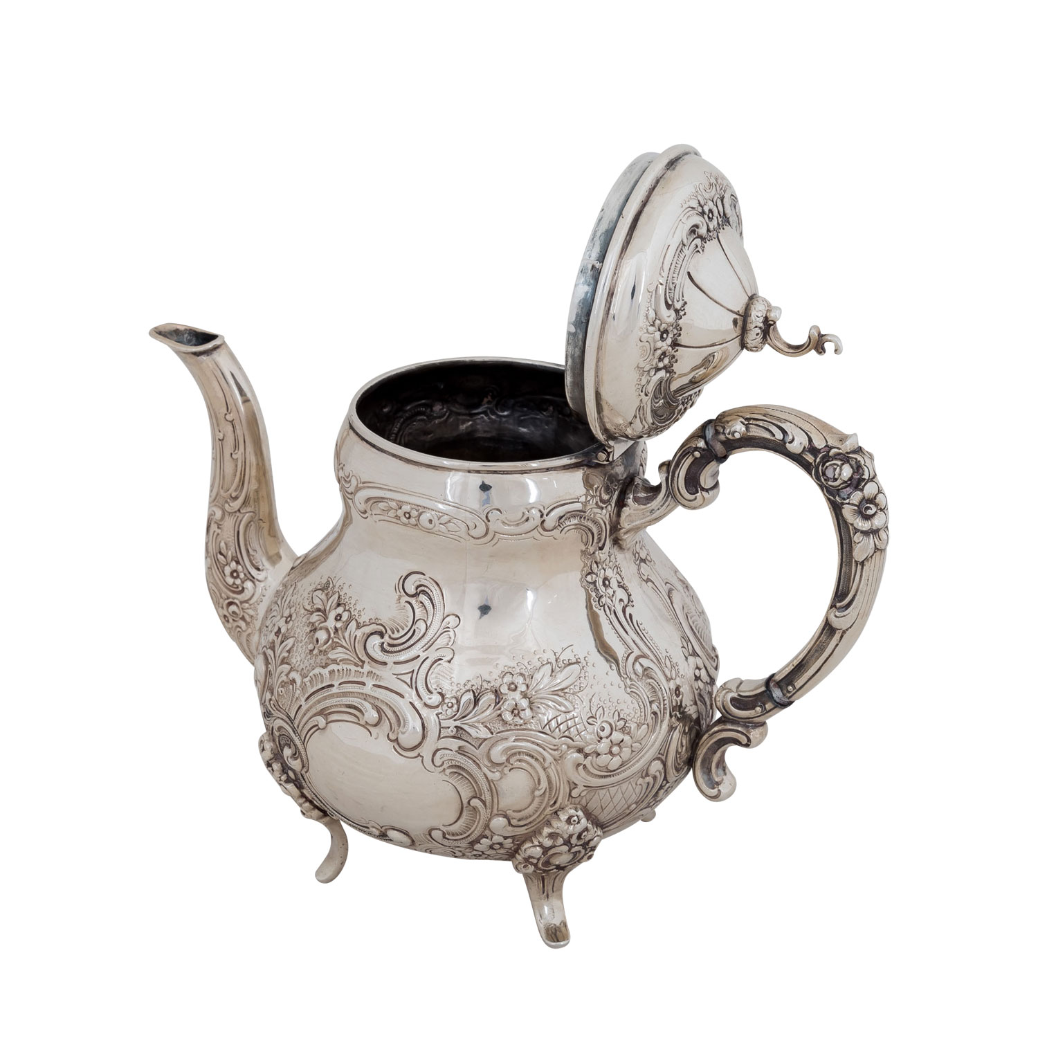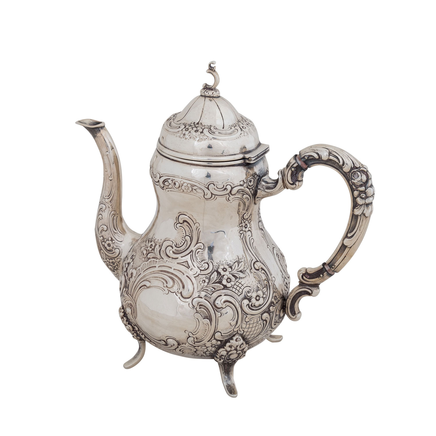 GERMANY teapot and coffee pot on tray, 800 silver, 20th century. With rich rocaille and floral decoration, jugs with hinged lids, oval tray with glass inlay (l. approx. 48.5cm), teapot is standing crooked because of dented edges, insulation rings are missing, signs of age and use.