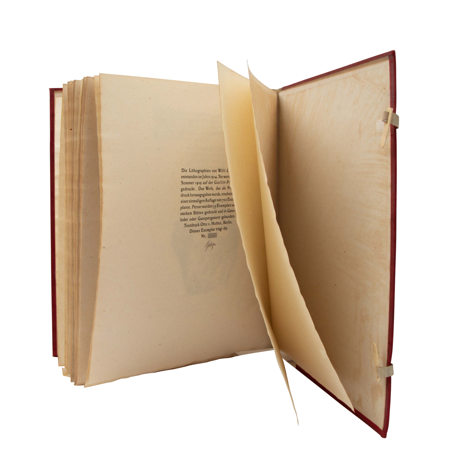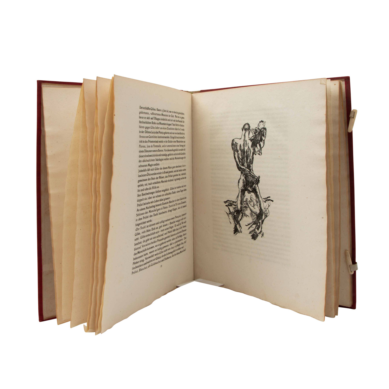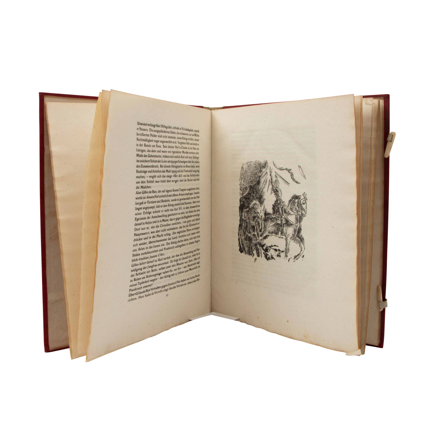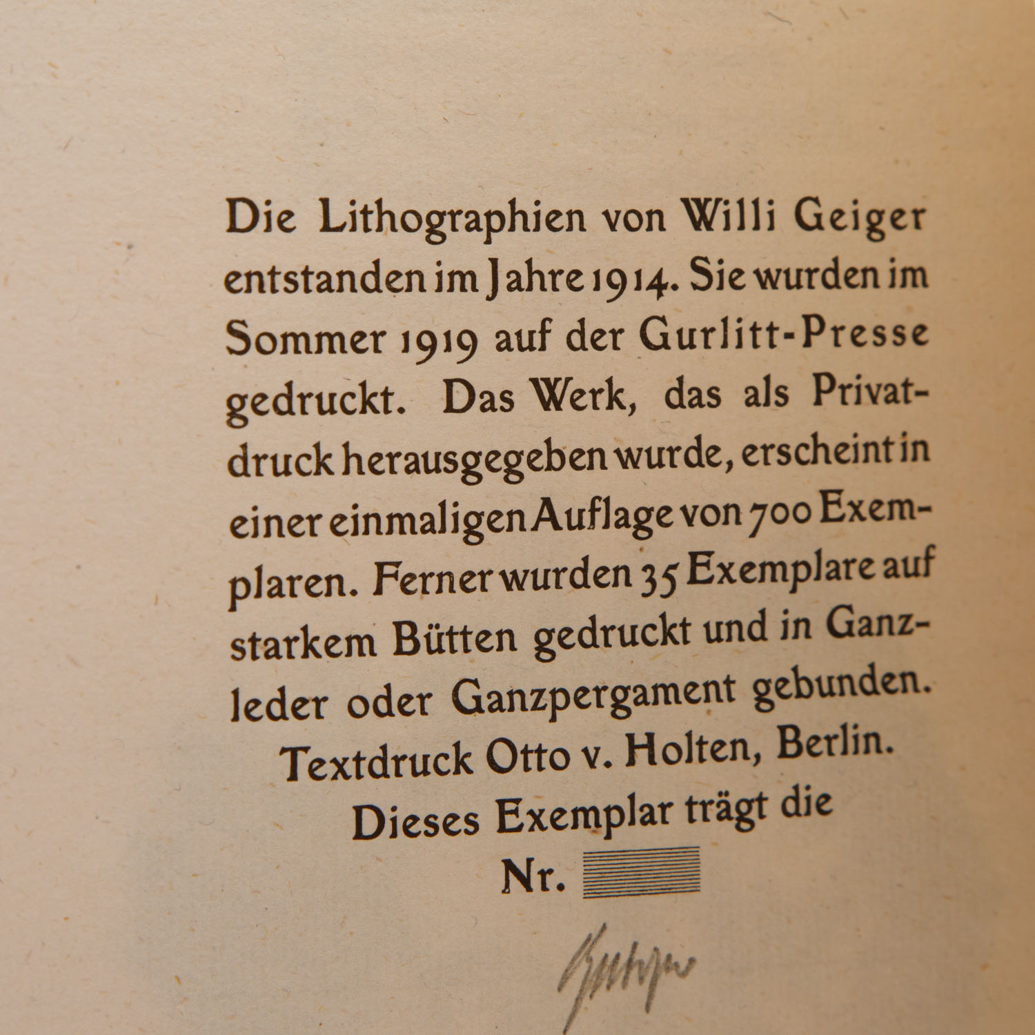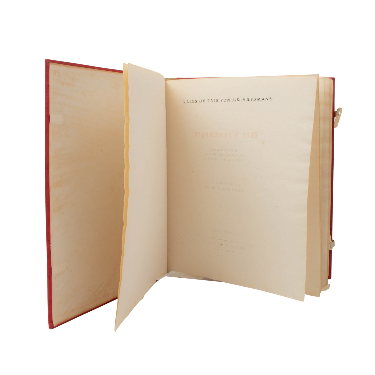 GILLES DE RAIS by J.-K. Huysmans, with original lithographs by WILLI GEIGER, 1919, first series, volume IX from the series Der Venuswagen, Berlin: Fritz Gurlitt Verlag, one-off edition of 700 copies (no number), signed by hand in pencil 'Geiger'. Tanned, part. stained, cover slightly damaged. Counted, completely preserved.