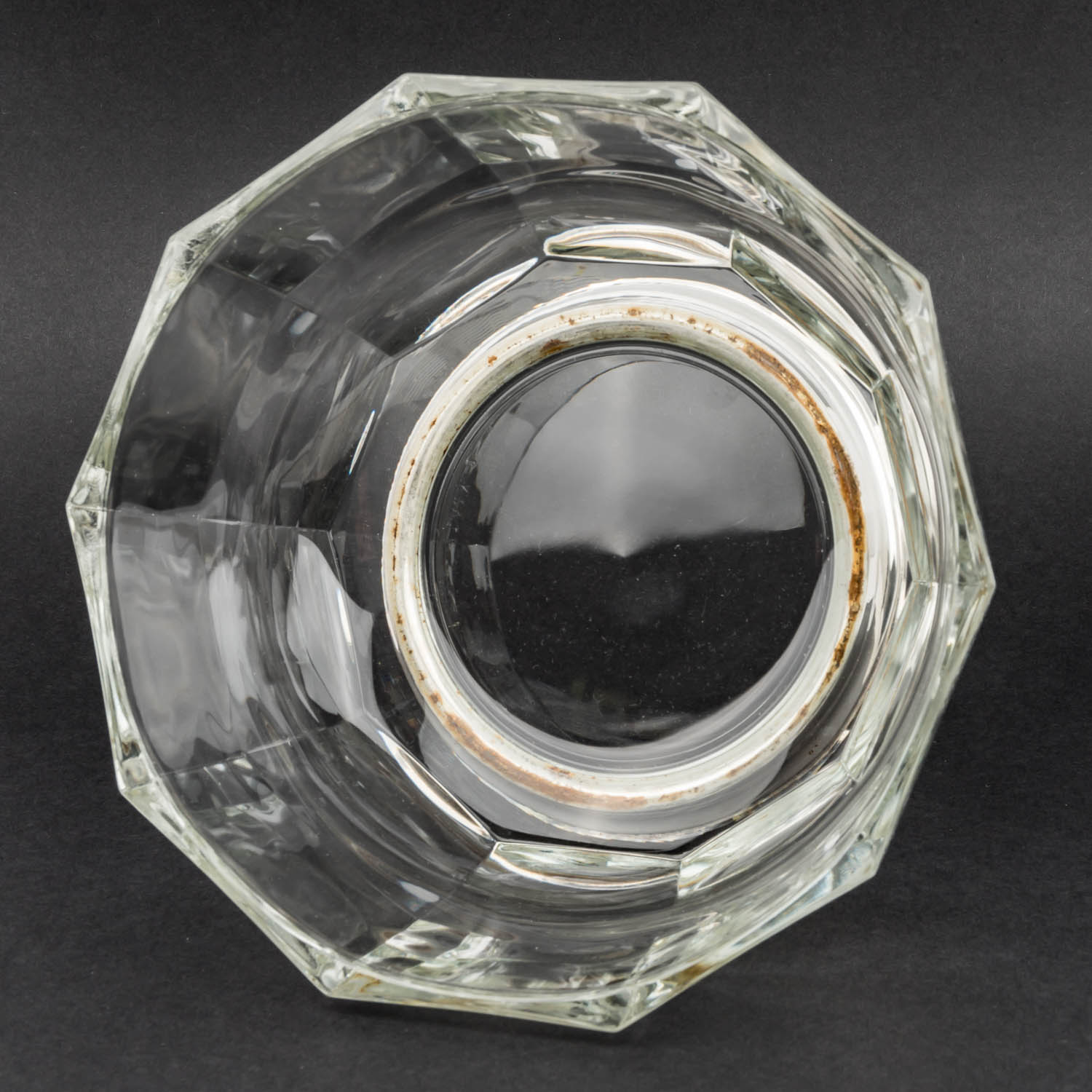 round, colourless glass, HxD: 11/23 cm. Some corrosion has formed between the metal and glass.