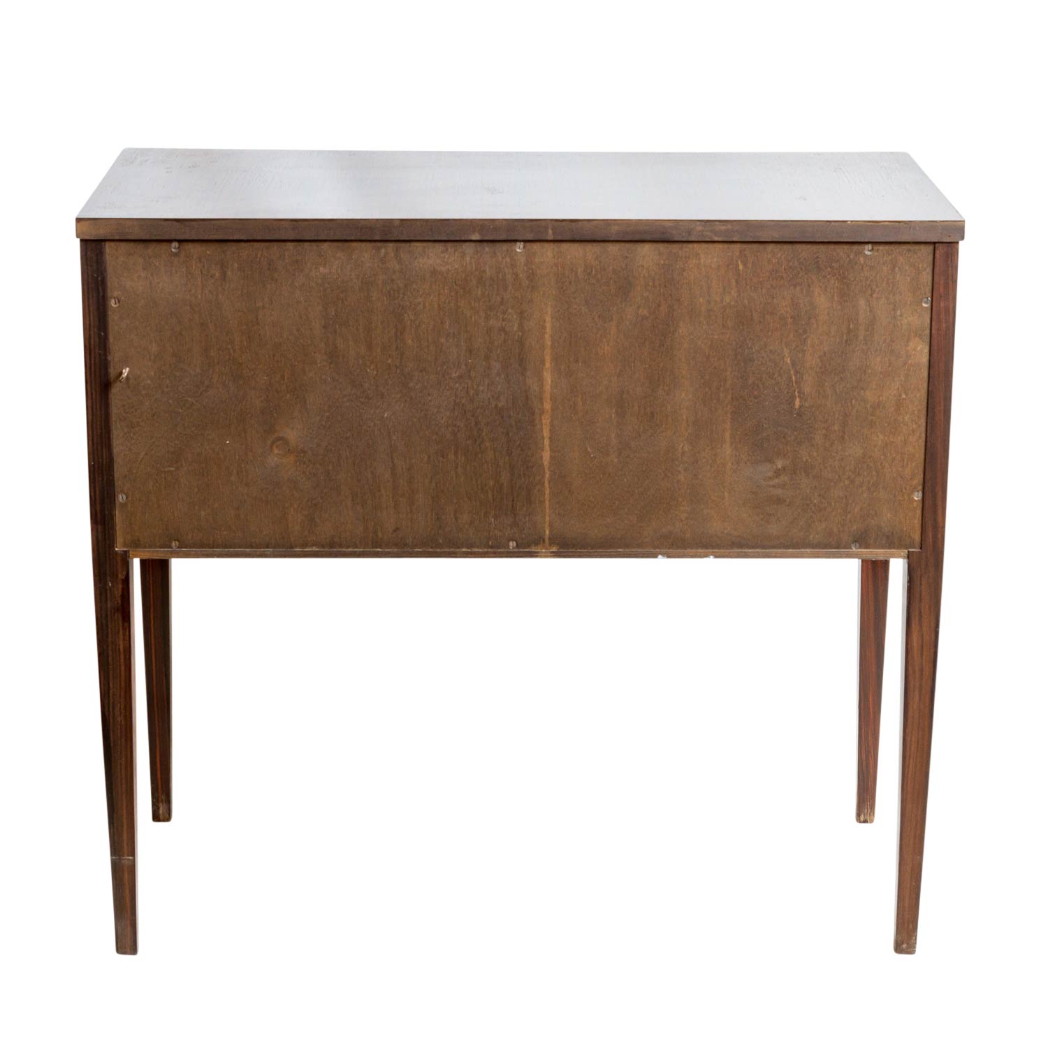 60s./70s. Years, straight corpus on conical feet, three drawers, HxWxD: 68/75/35 cm. Well-kept general condition with minor signs of age and use.