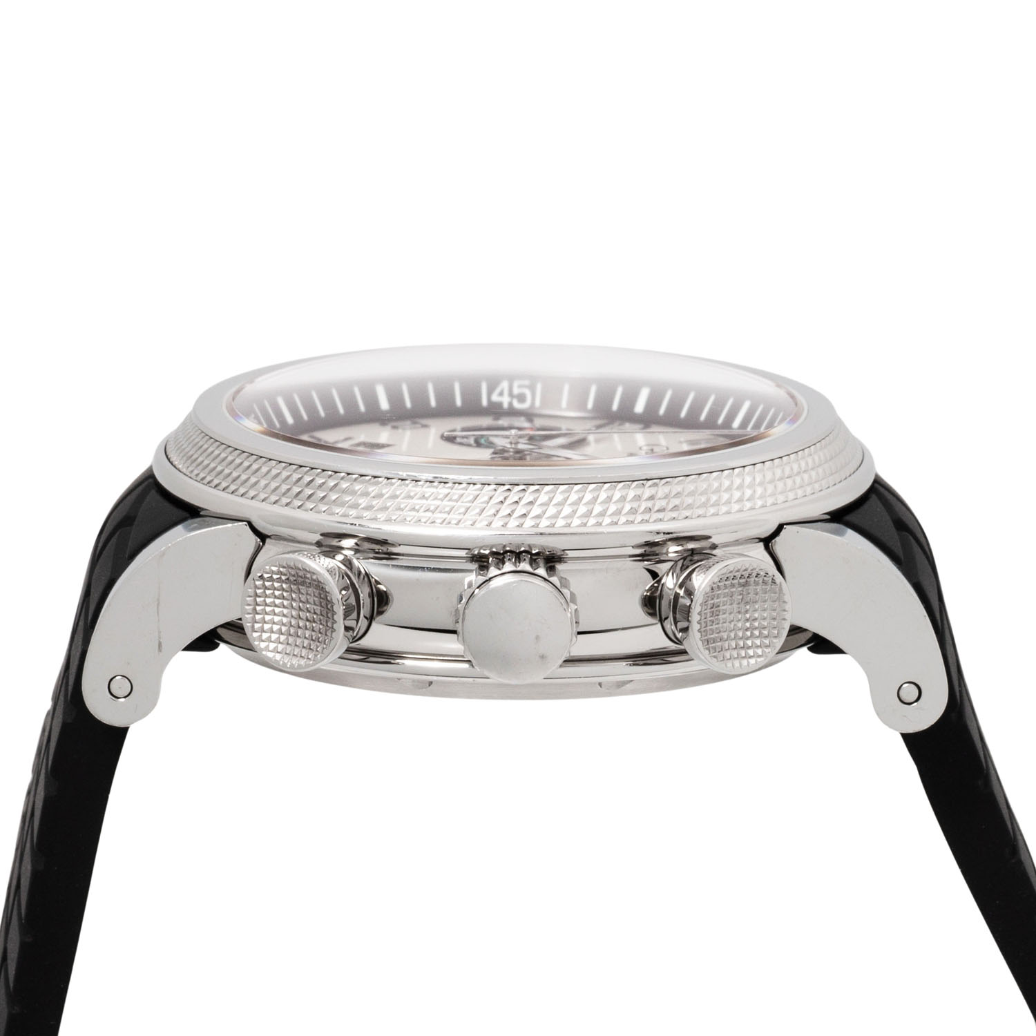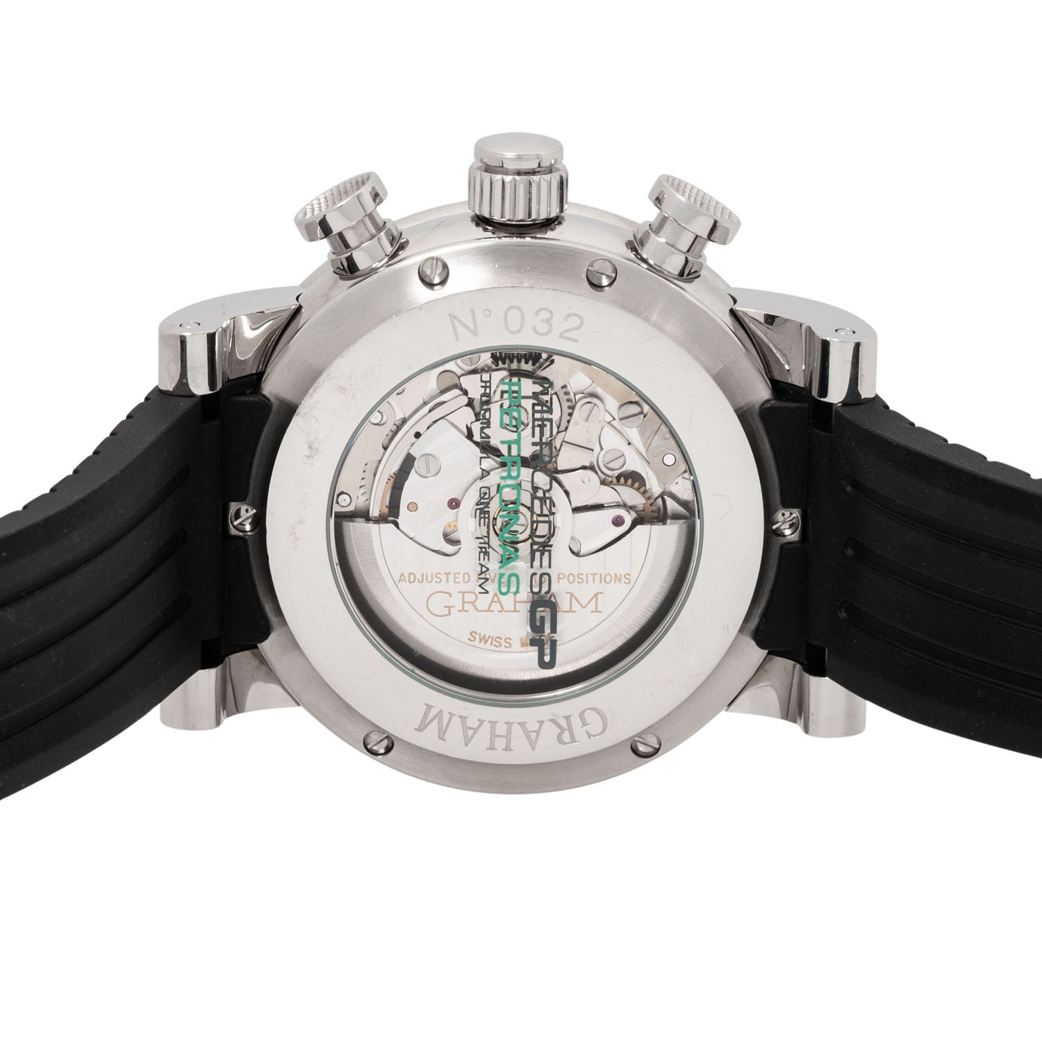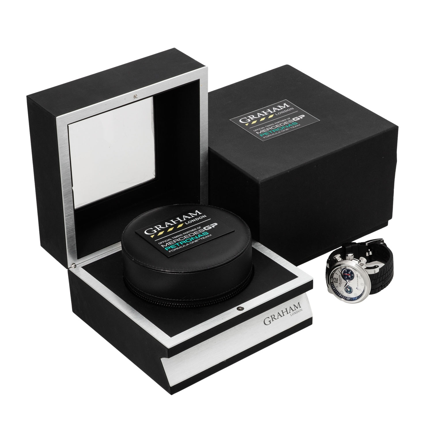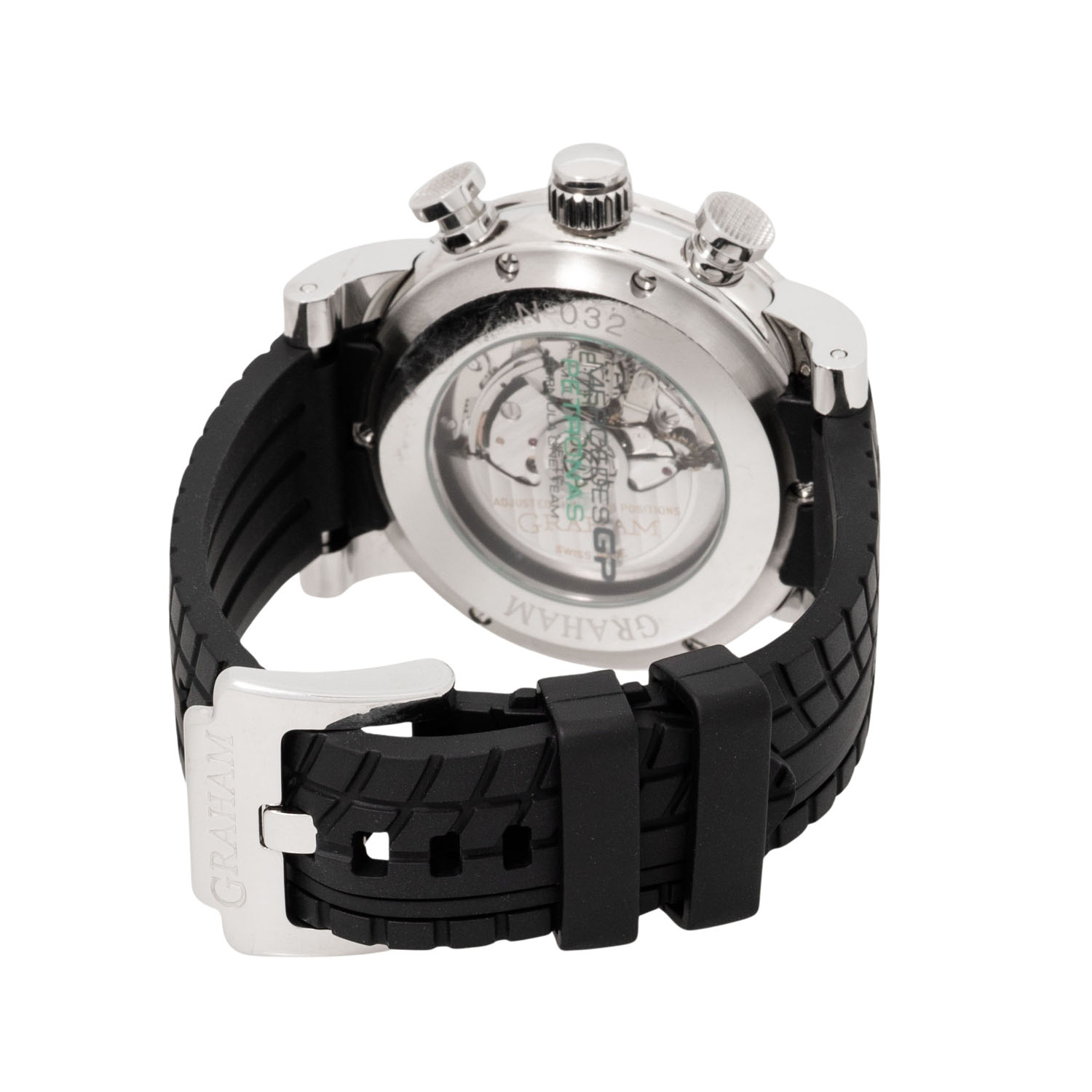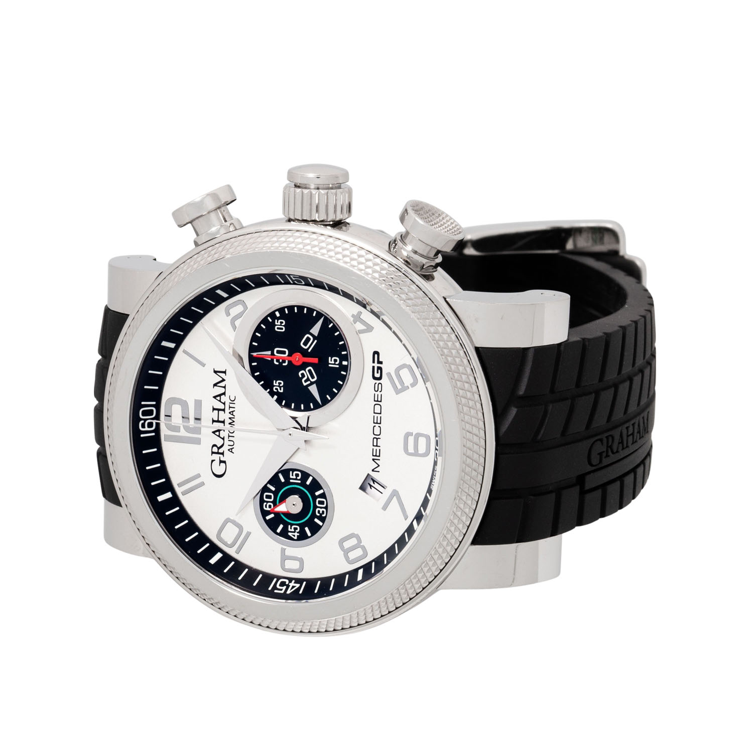 GRAHAM Mercedes GP 'Petronas' Ref 2MEAS.S01A Men's Chronograph. Stainless steel. Glass back with imprint “Mercedes GP Petronas Formula One Team”. Automatic movement cal. ETA 7750 with very good performance (+7s/d. 314°). Silver-colored dial with MERCEDES GP lettering, applied Arabic numerals, 2 sub dials, small second and date display at 7 o'clock. Clous de Paris bezel. Graham rubber strap with tire tread pattern and pin buckle. Good condition with signs of wear. Original box enclosed. Diameter approx. 47 mm (measured without crown).
