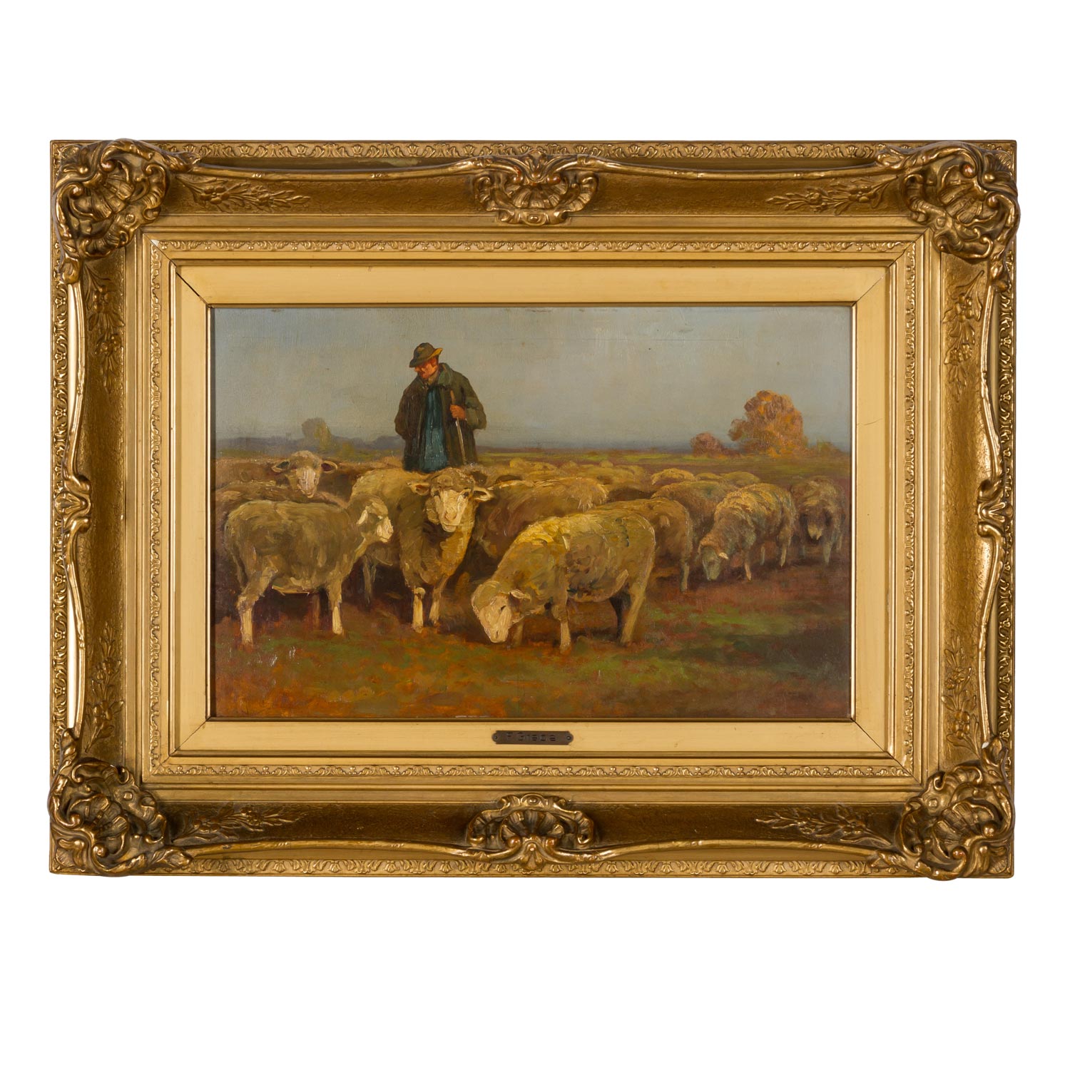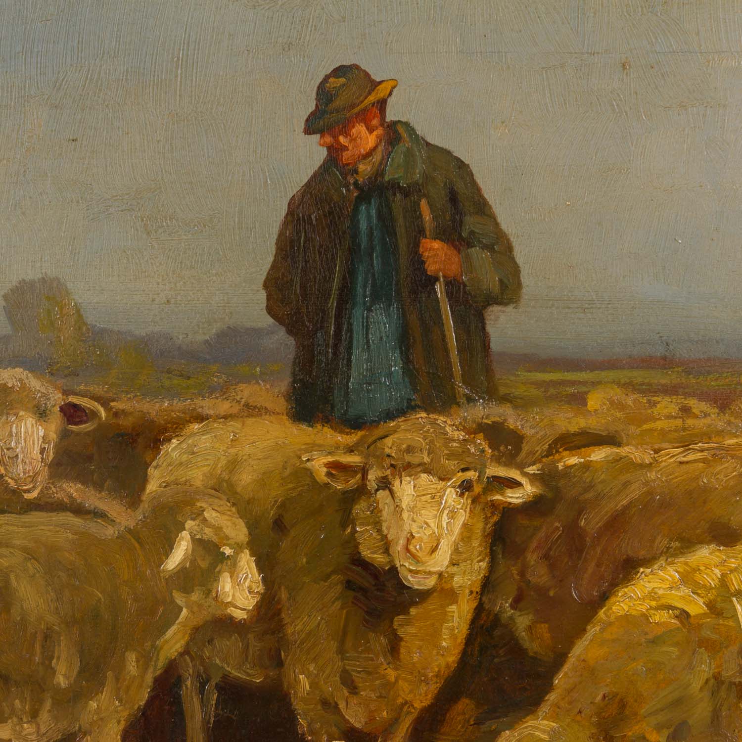 GREBE, Friedrich, ATTRIBUIERT (F. G.: 1850x1925), 'Schäfer mit seiner Herde in Heidelandschaft', oil/wood, HxW: approx. 34x52 cm (58x75 cm with frame). Traces of age, rubbing and colour loss to the edges (from frame impression), drying crack in the upper area, few stains. With frame (partially damaged). PLAKETTE with artist's inscription 'F. GREBE' on the frame.