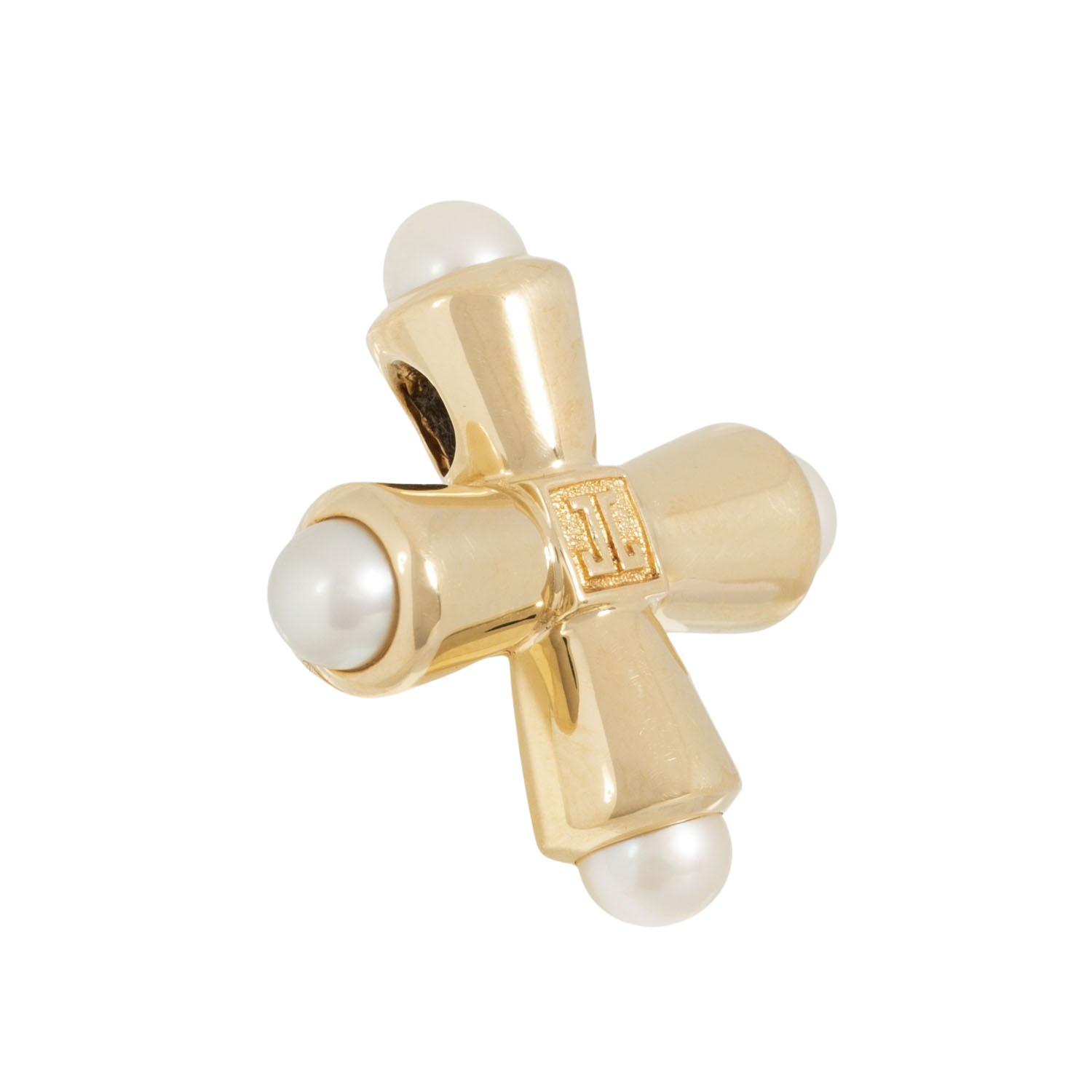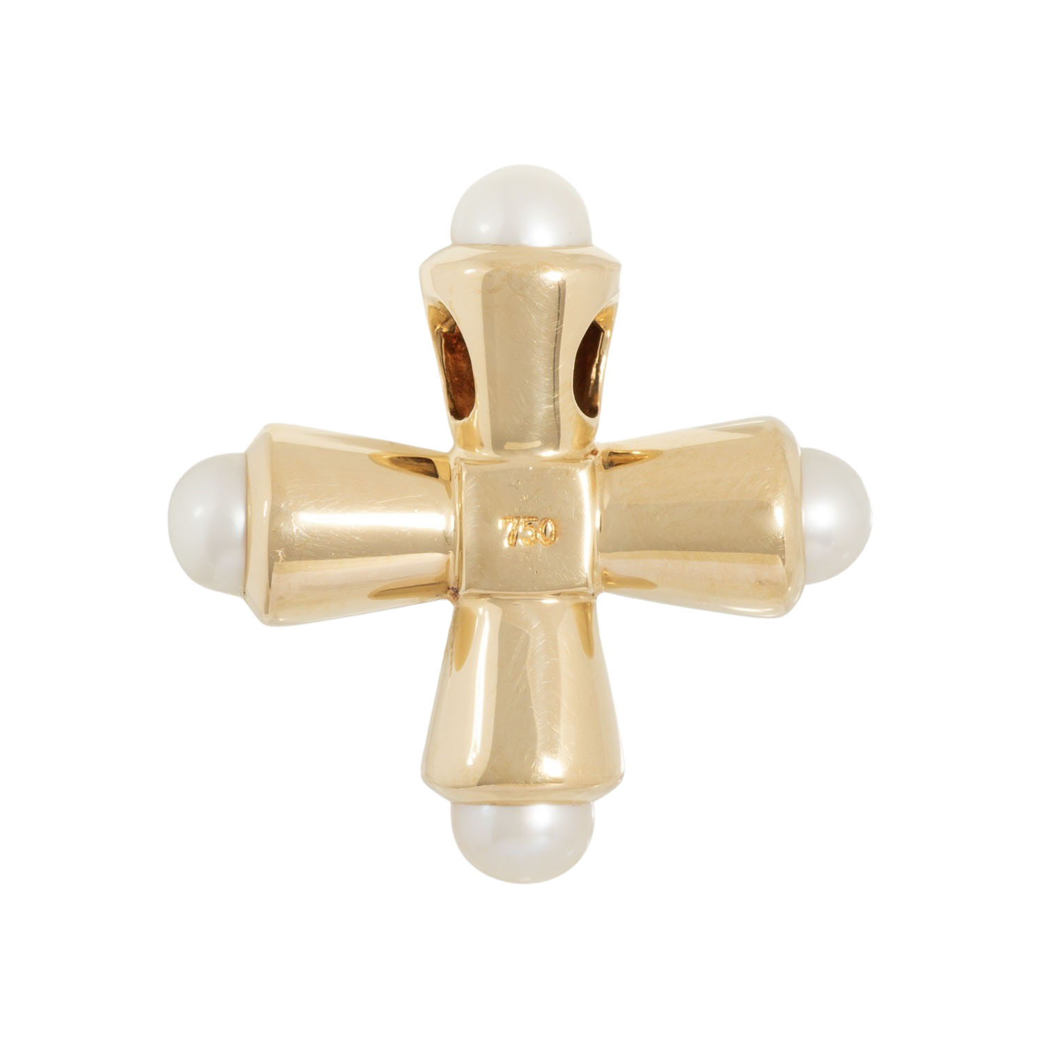 Pendant 'Greek Cross' with 4 white cultured pearls, D: ap. 5 mm, good lustre, 18K yellow gold, 8.0 g, L x W: 26,7 x 26,2 mm, late 20th century, minimal signs of wear.