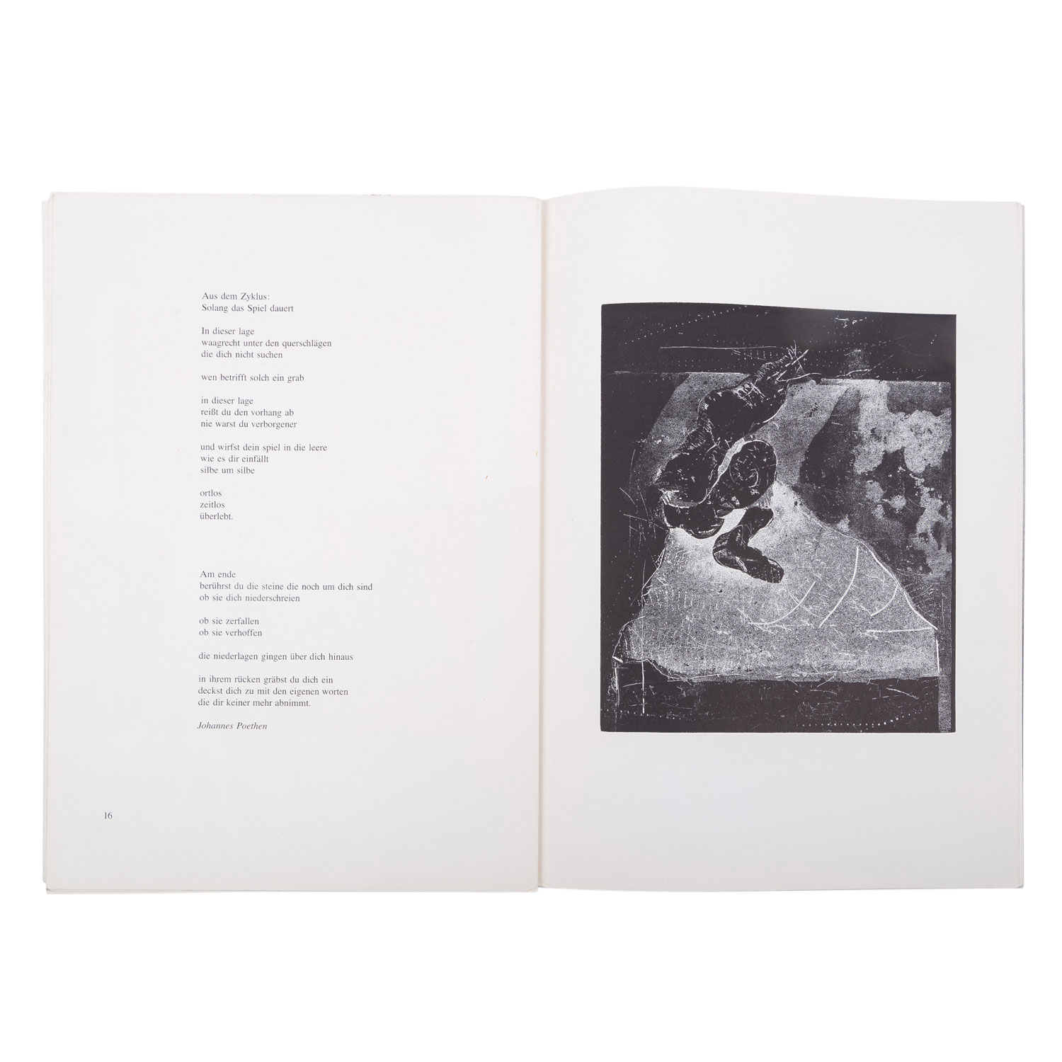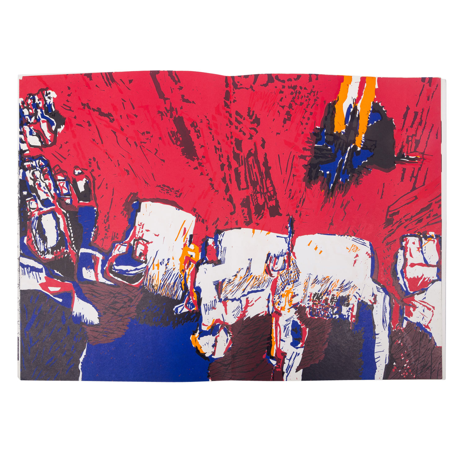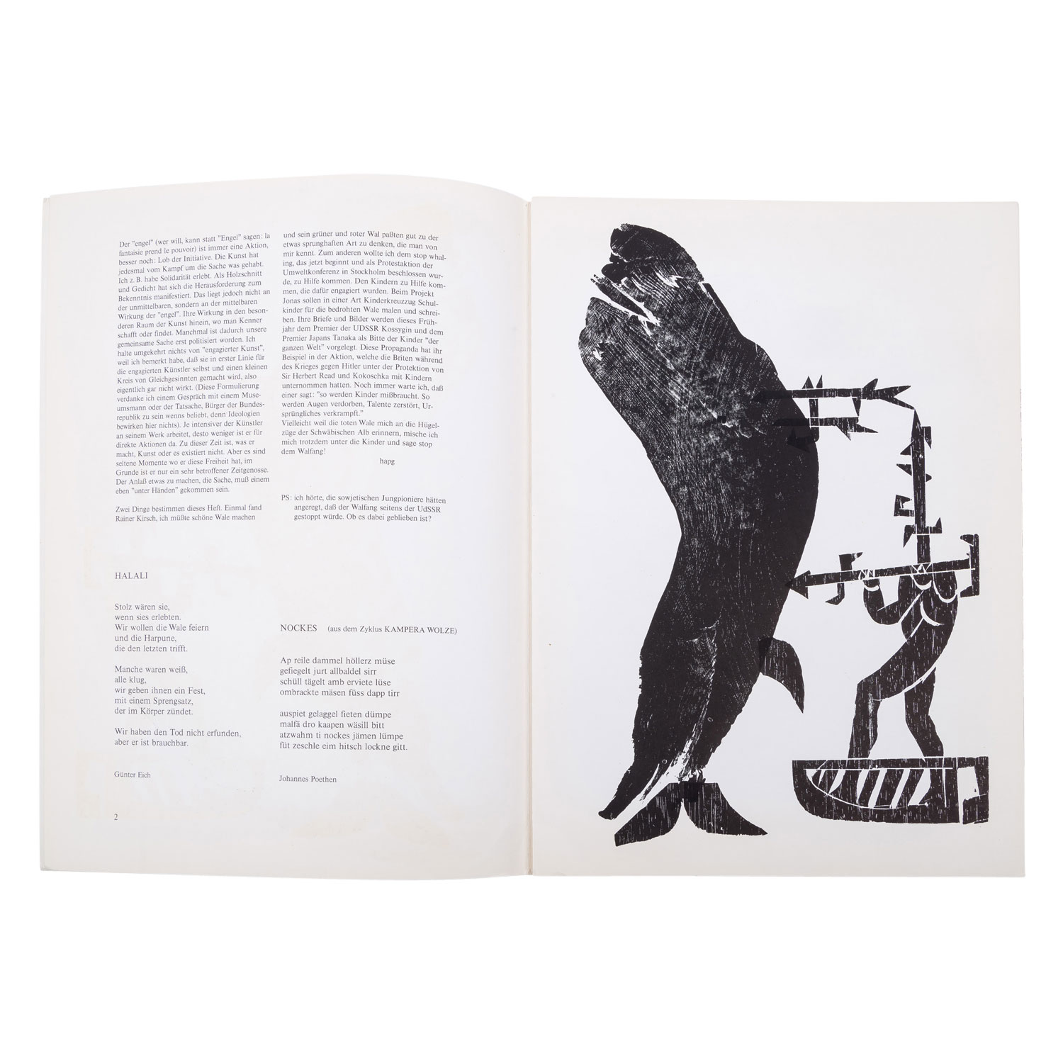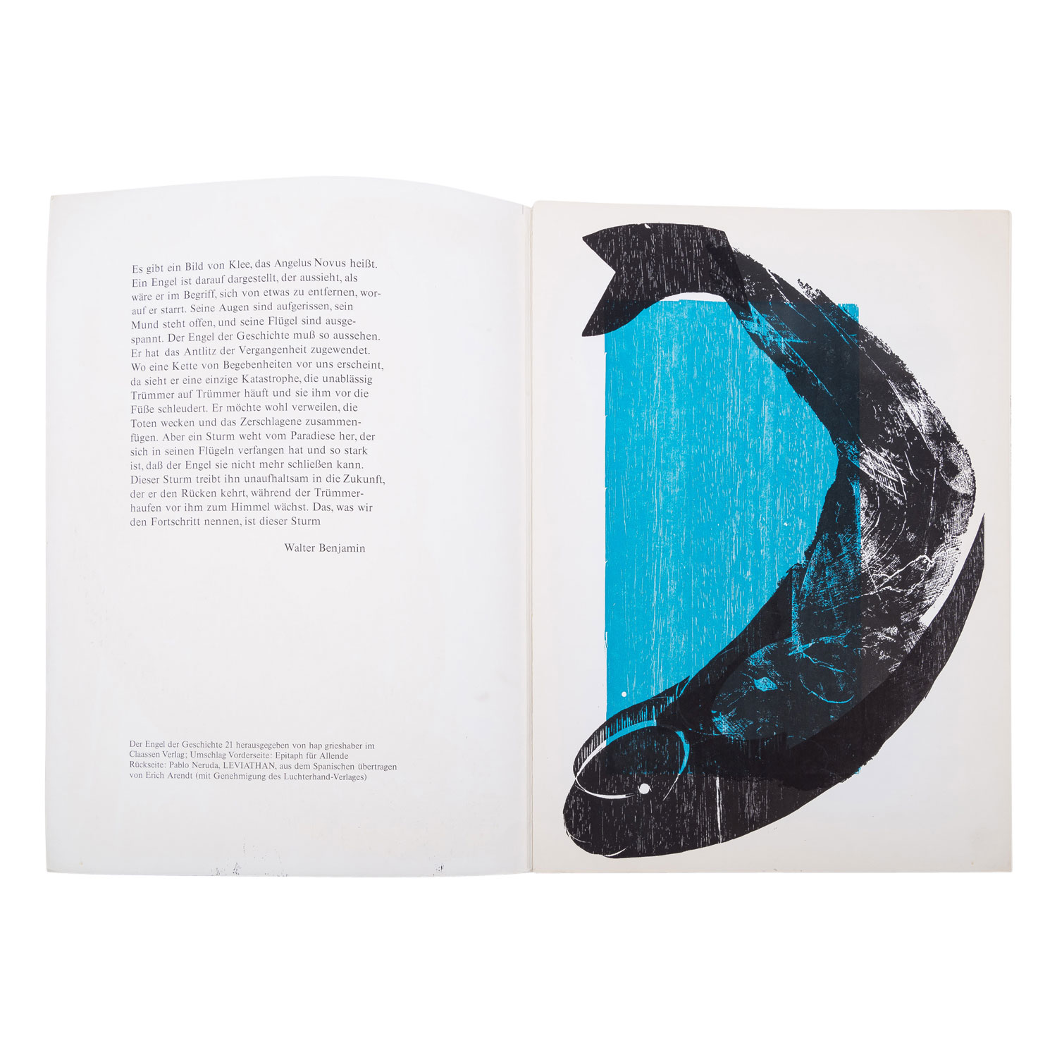GRIESHABER, HAP (Helmut Andreas Paul, 1909-1981), 3 booklets 'Engel der Geschichte', 1.) Engel der Geschichte XII, 1969, published for Grieshaber on 15 February 1969 by Margot Fürst and Roland Hänßel, Edition: 1000 copies, contains 8 lithographs and woodcuts; 2.) Engel der Geschichte 19/20, Claassen Verlag Düsseldorf, contains 9 woodcuts by Grieshaber; 3.) Engel der Geschichte21: Stop dem Walfang!, Claassen Verlag, contains 6 woodcuts by Grieshaber; HxW: booklet dimensions up to approx. 43x31 cm. Signs of age and wear, partly slightly browned and creased, edges bumped.