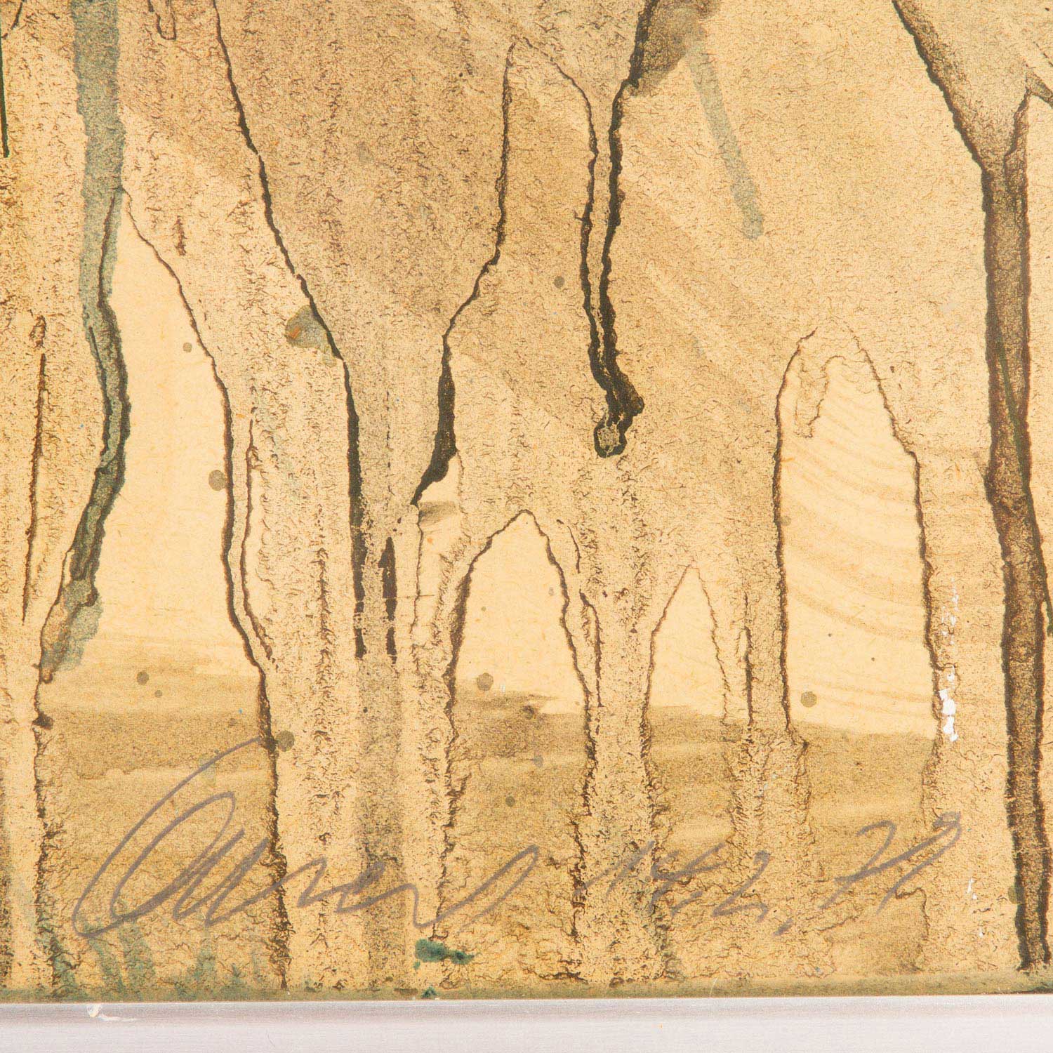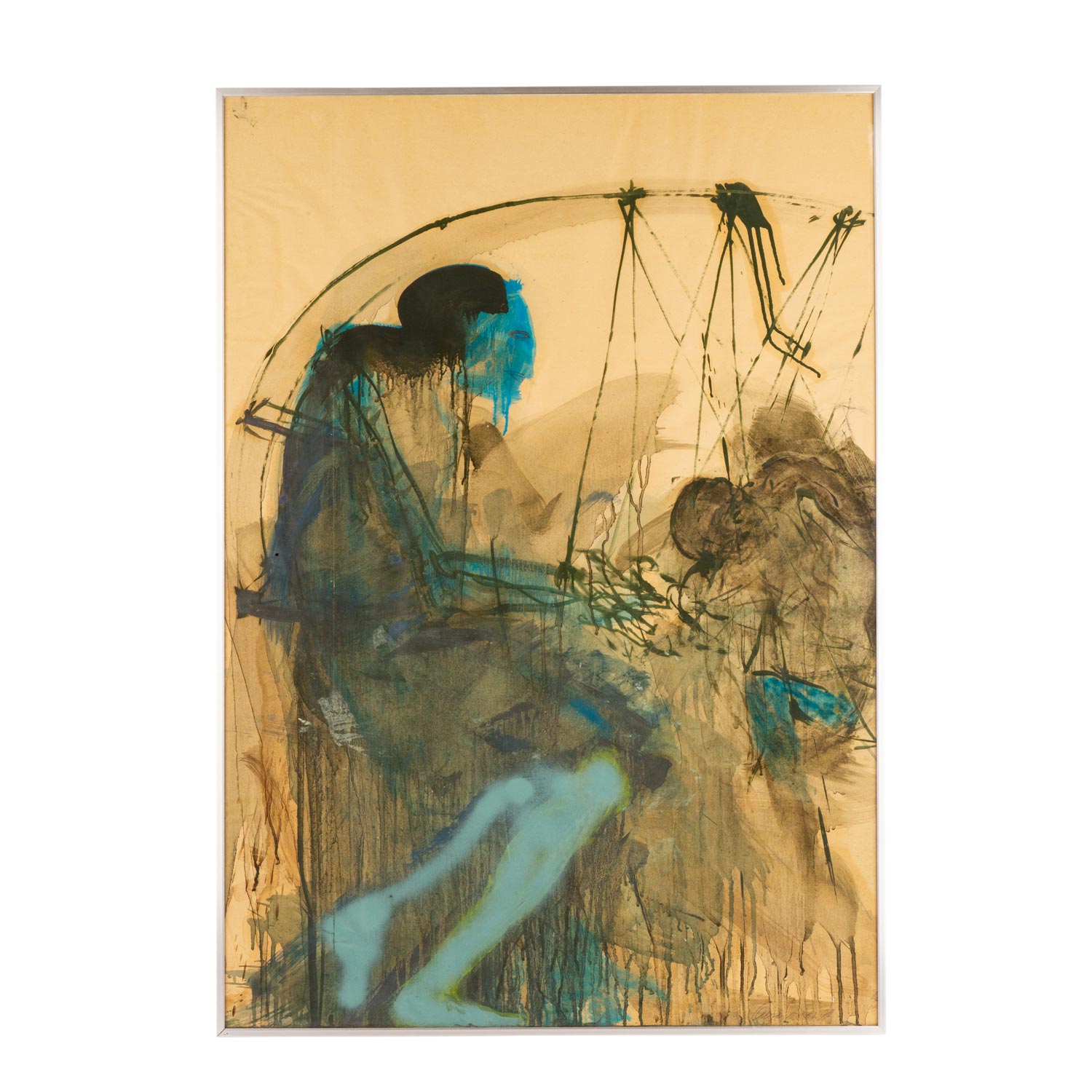 GRUNERT, ANDREAS (born 1947), "Figuren", abstract composition, sign. a. dat. '14.2.(19)79', mixed media/chamois colored paper, HxW: 102x71 cm. Wavy a. browned, creases. Framed under glass. PROVENANCE: The painting was consigned by REZZO SCHLAUCH, former Secretary of State of the Federal Government, for the benefit auction. It hung in Schlauch's law office in Stuttgart for many years.