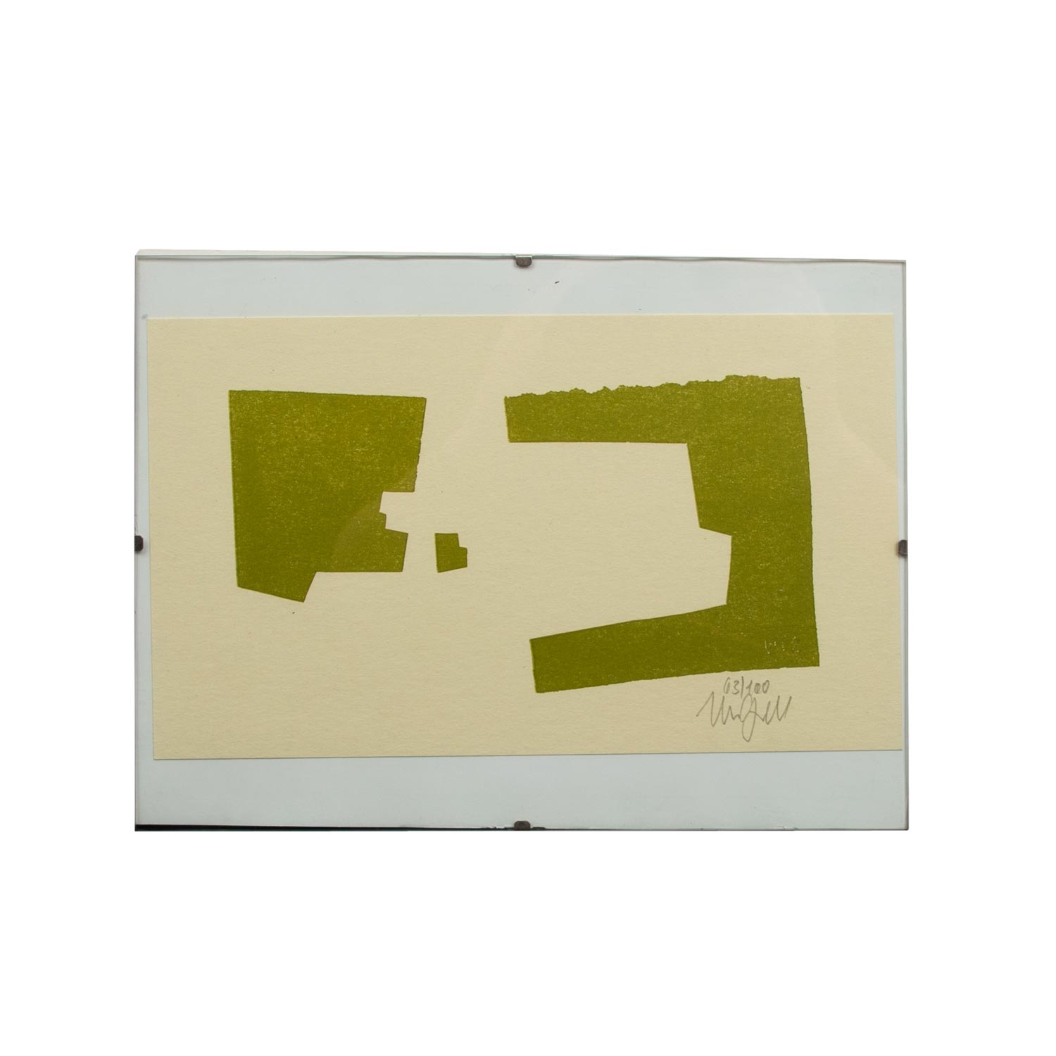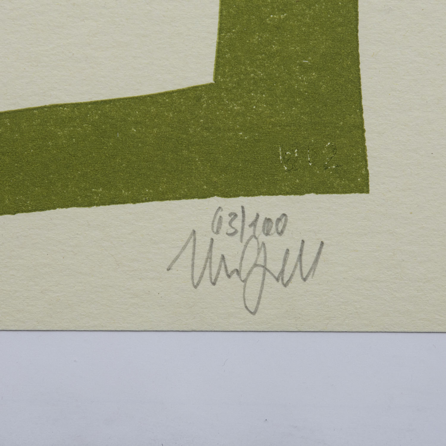 GSELL, ULI (b. 1967), 'Informal Composition', color linocut/paper, with pencil by hand num. 63/100 and signed, this was the greeting card for the year 2013 (verso text and handwritten dedication), HxW: plate approx. 10x18 cm, sheet approx. 13.5x23 cm, outer dimensions of frame approx. 18x24 cm. With glazed clamping frame. Slight signs of age.