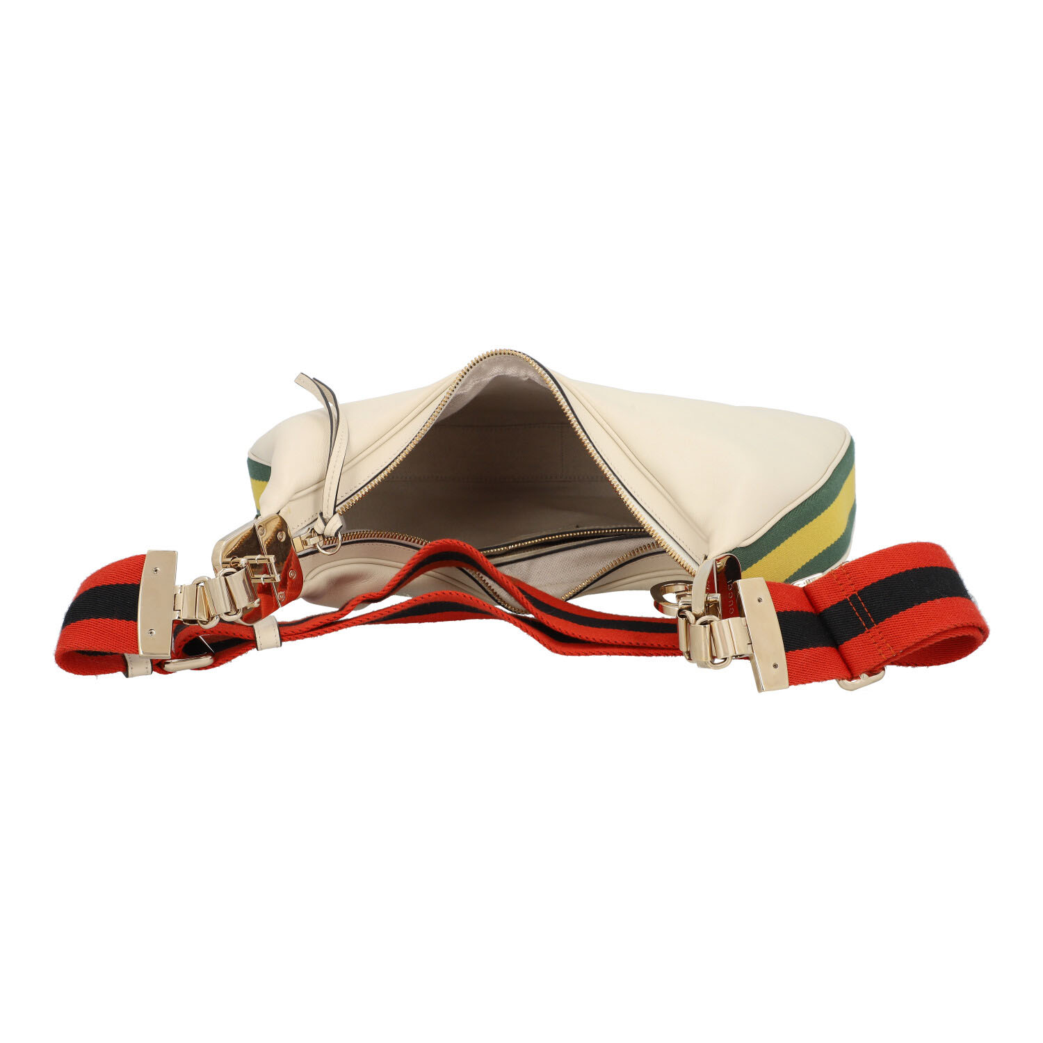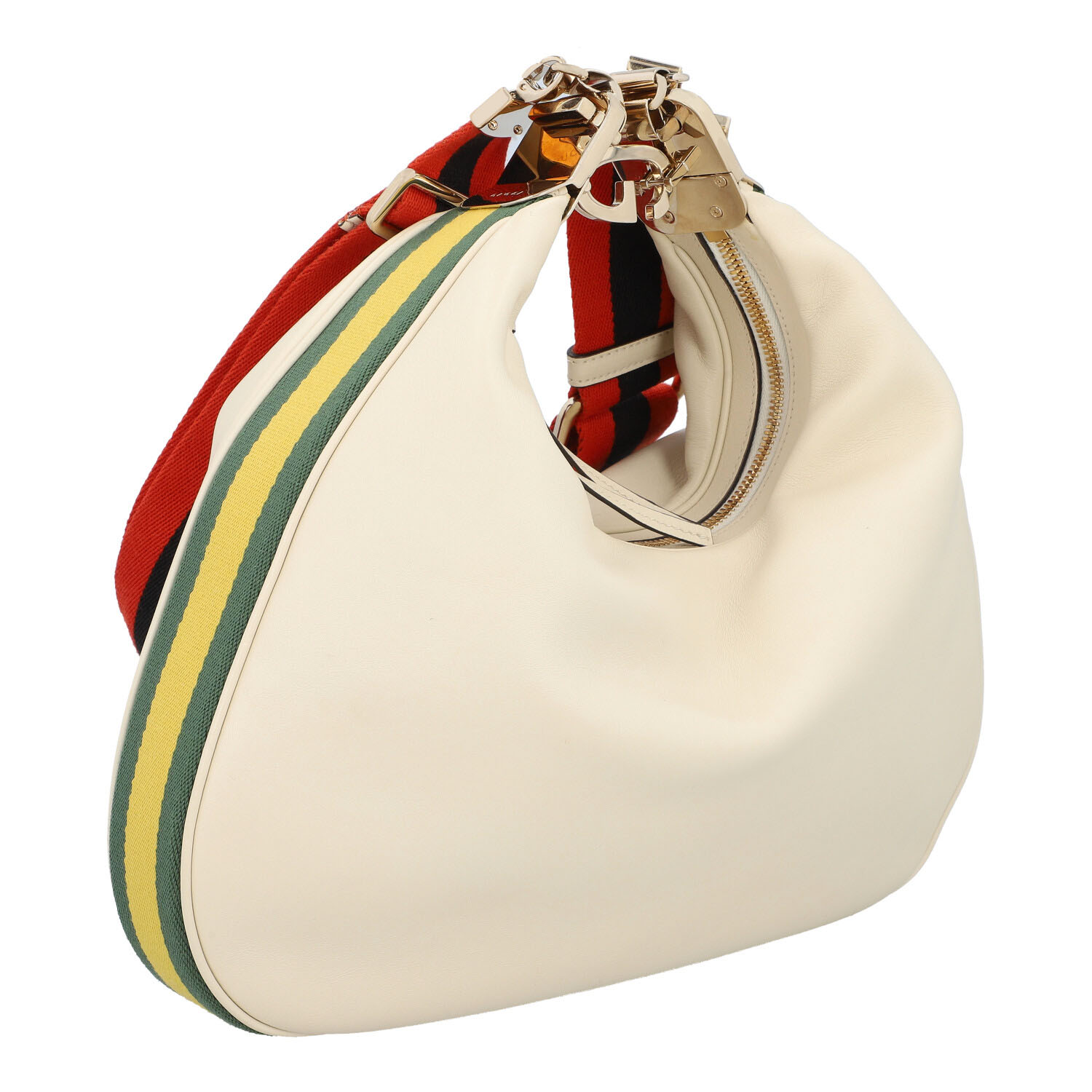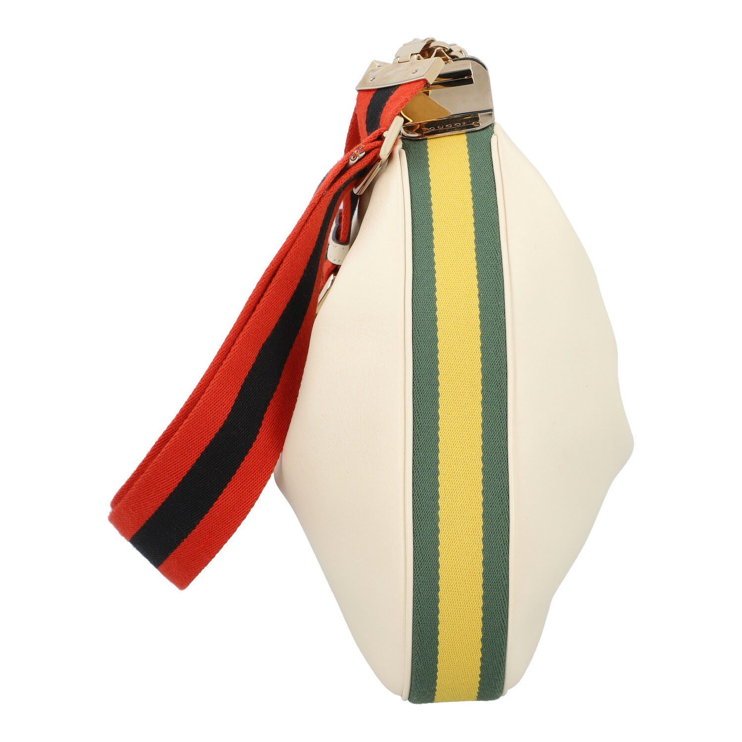 GUCCI shoulder bag 'ATTACHE LARGE'. Actual. NP.: € 2,750. Hobo bag made of leather in cream and white with gold-coloured hardware and textile details in a striped design in green/yellow and black/red. Decorative clasp design. Extra shoulder strap attached. Slight signs of wear. 34x5x20cm.