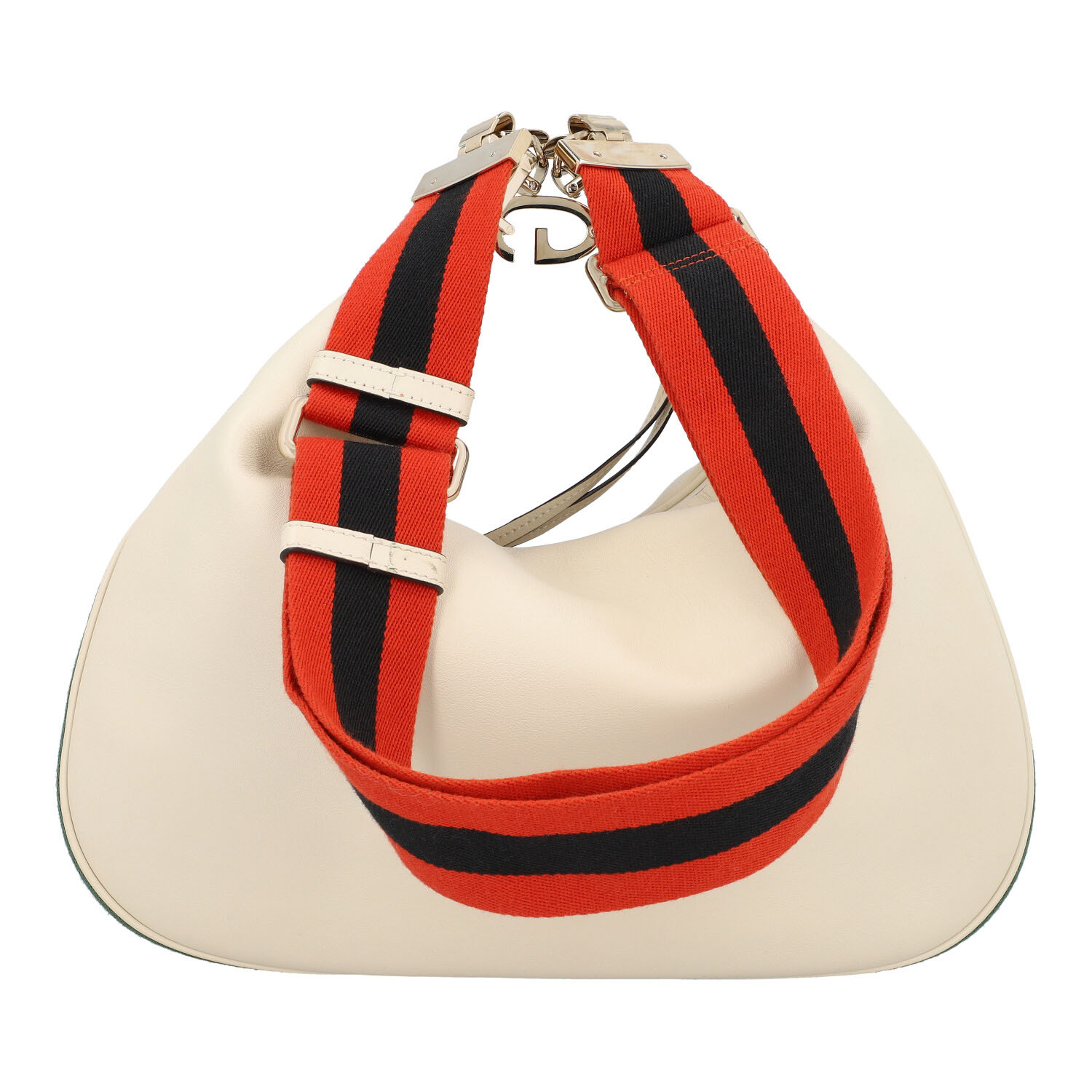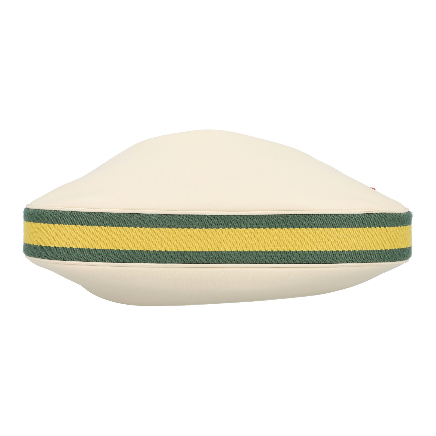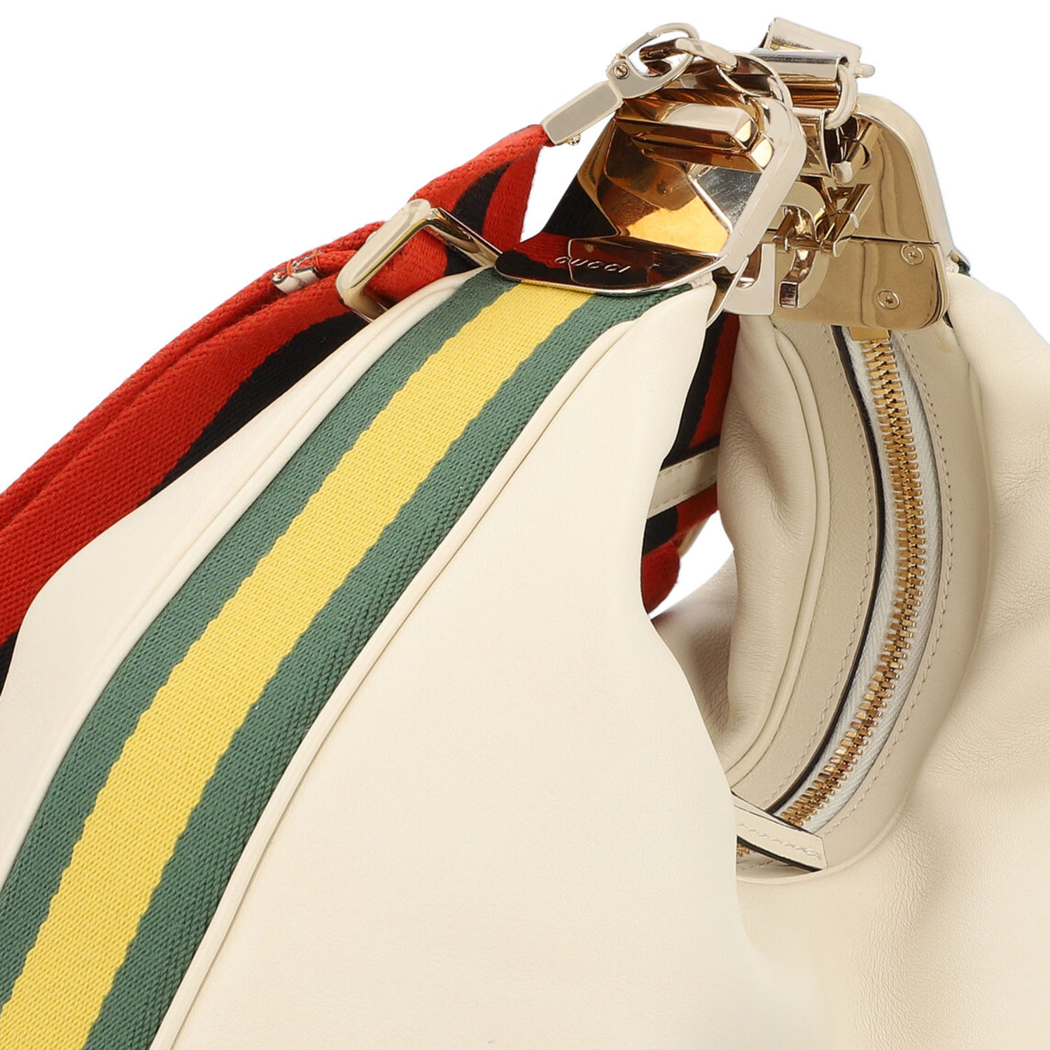 GUCCI shoulder bag 'ATTACHE LARGE'. Actual. NP.: € 2,750. Hobo bag made of leather in cream and white with gold-coloured hardware and textile details in a striped design in green/yellow and black/red. Decorative clasp design. Extra shoulder strap attached. Slight signs of wear. 34x5x20cm.