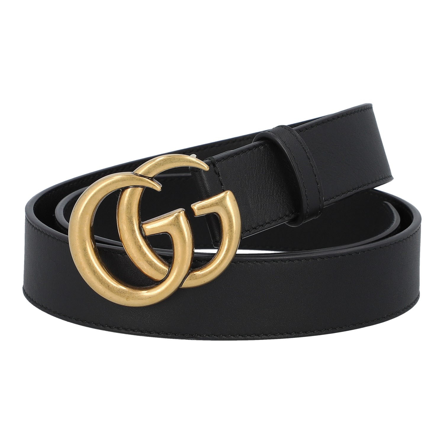GUCCI belt 'SCHMALER GG MARMONT', l.: 80 cm, retail price: 430,-€. Black leather with antique gold-coloured double G clasp. Dust bag included. Signs of wear present. Width: 3 cm.