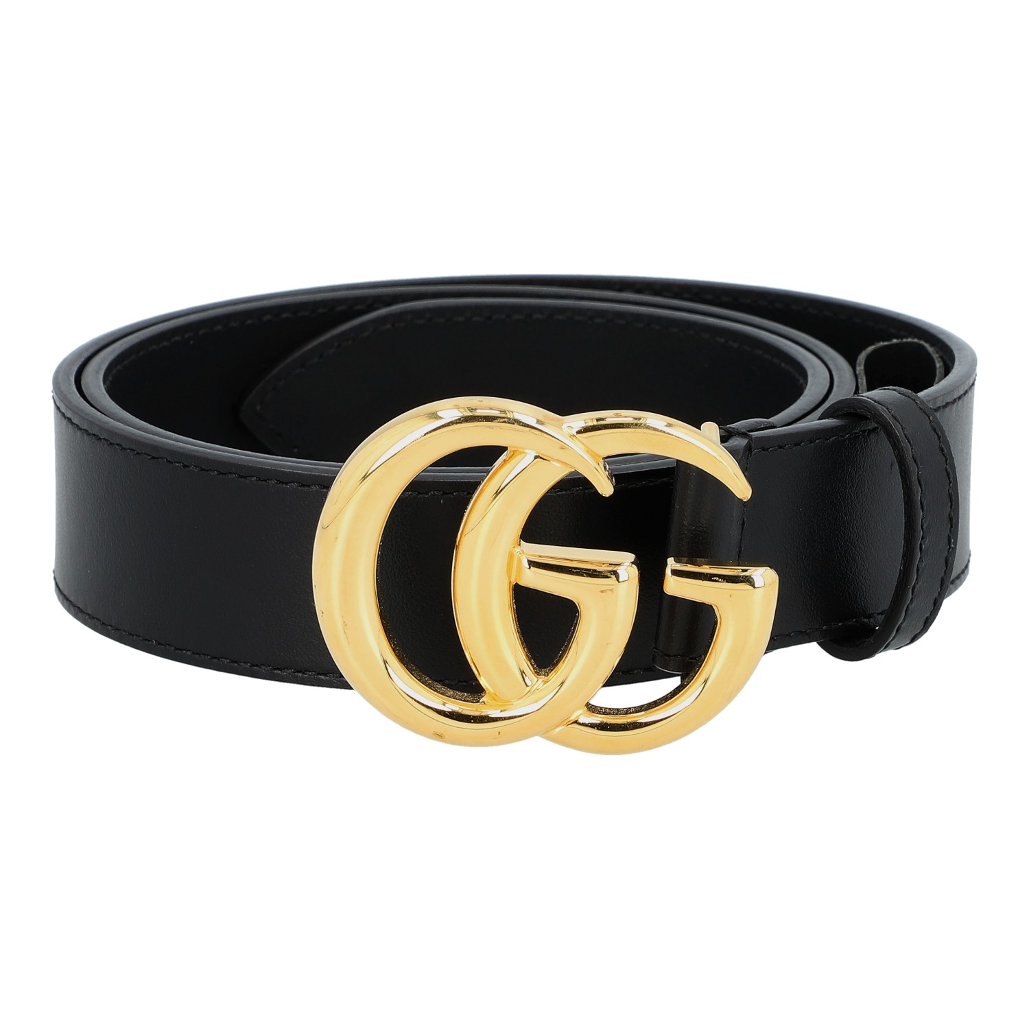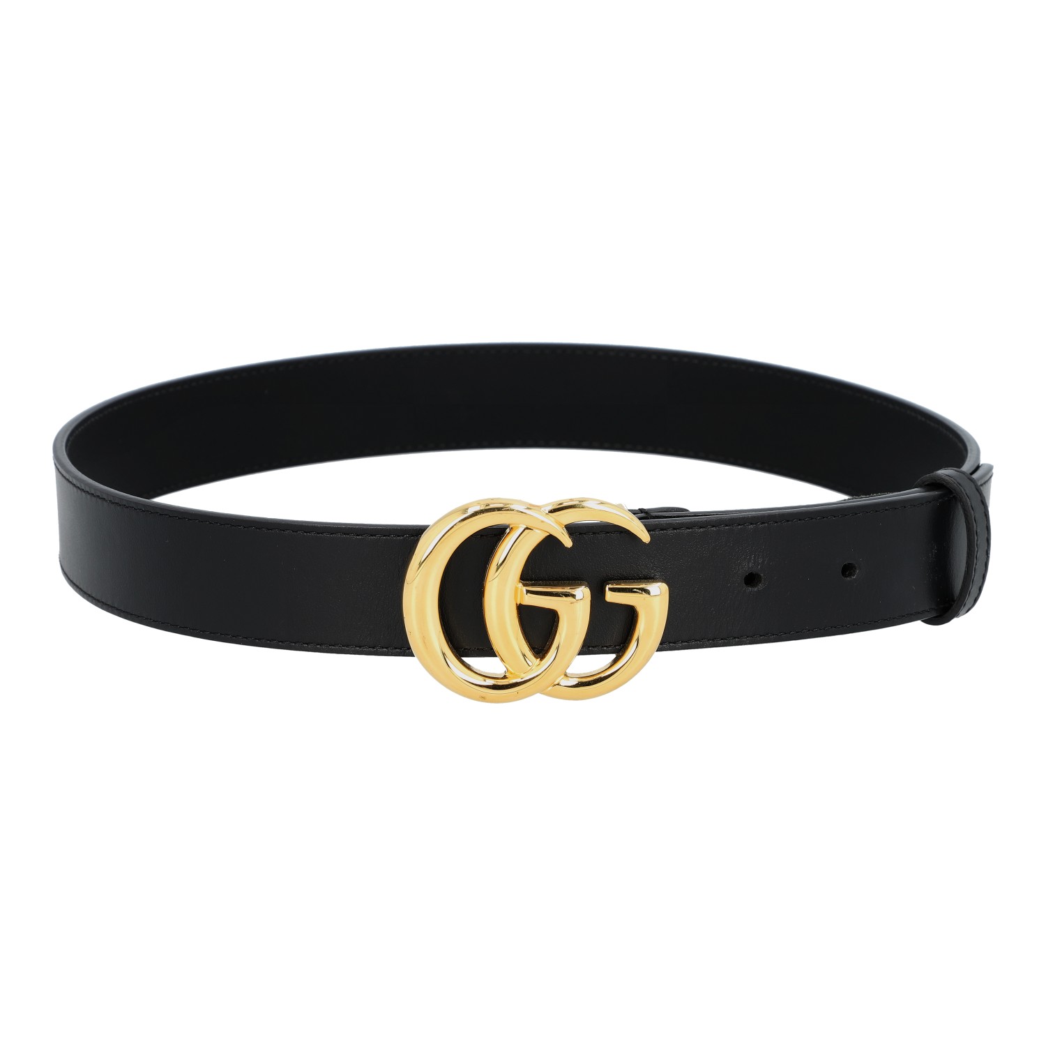 GUCCI belt, lenght 75cm. Black leather strap with gold-coloured GG logo clasp. Width approx. 3 cm. Very good condition.