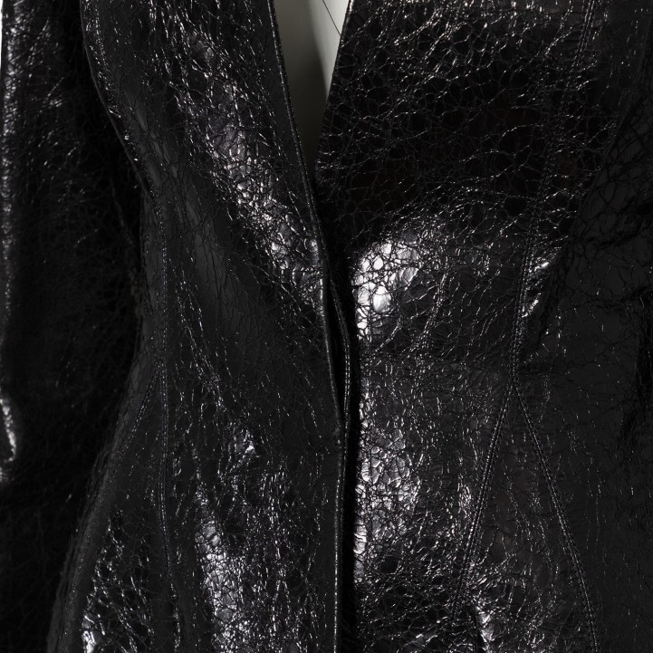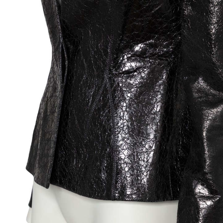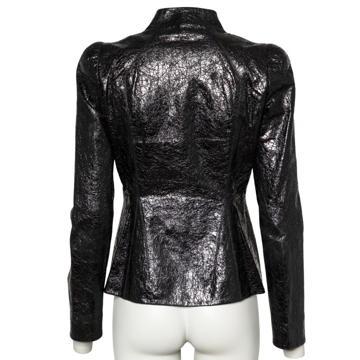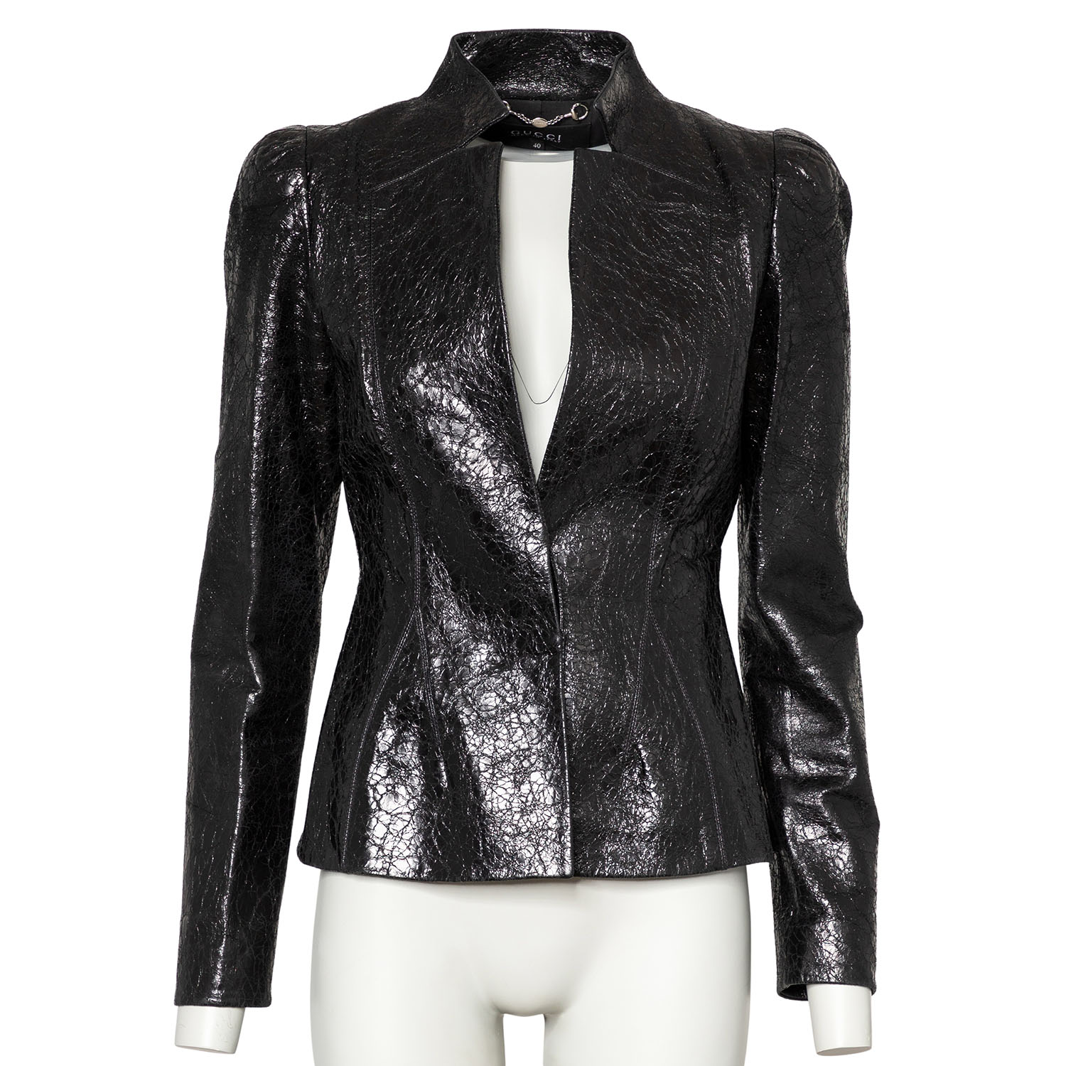 GUCCI leather jacket, size 36. Crushed leather in black, simple design with concealed button closure and distinctive stand-up collar. In good condition.