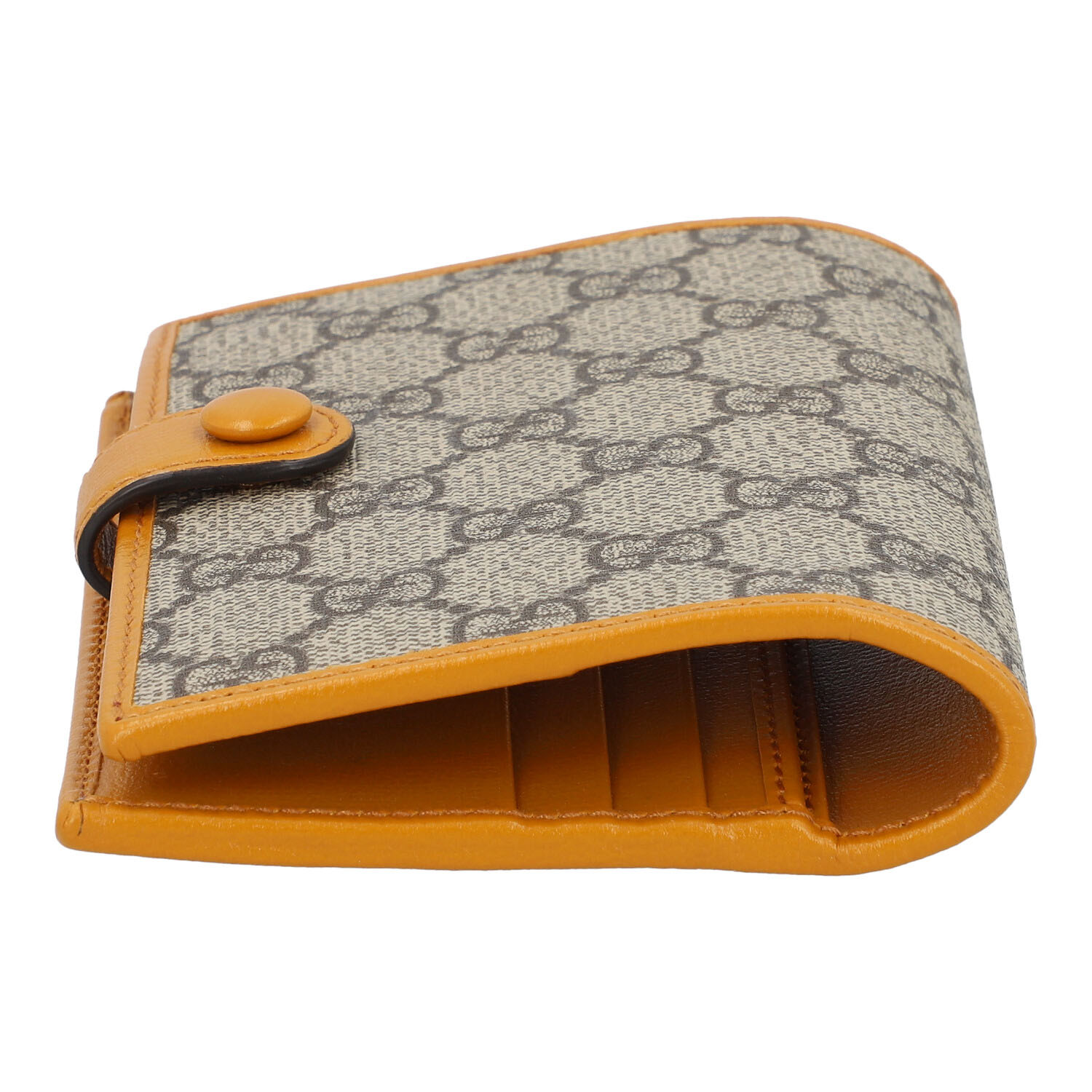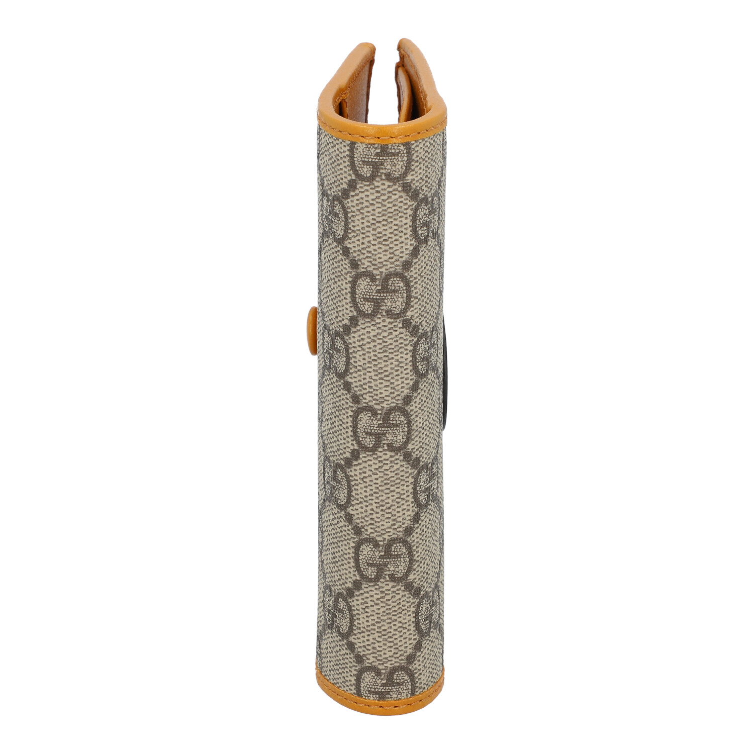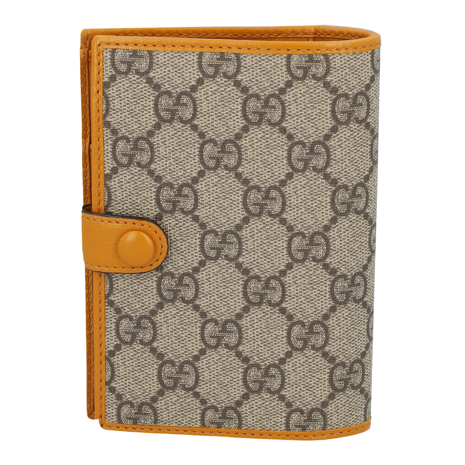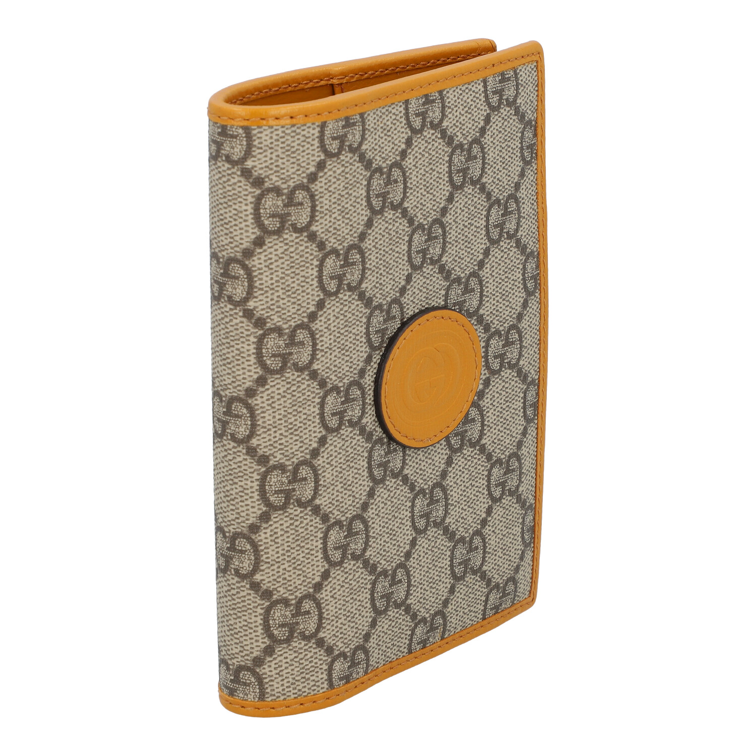 GUCCI passport case. GG Supreme canvas series with leather details in ochre. Main compartment with flap and press stud fastening. With five card slots. Box enclosed. In very good condition.