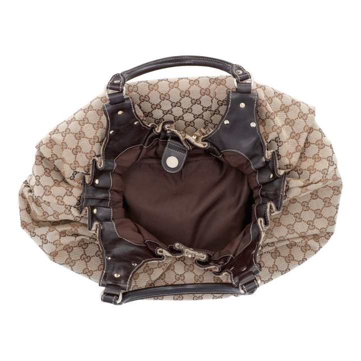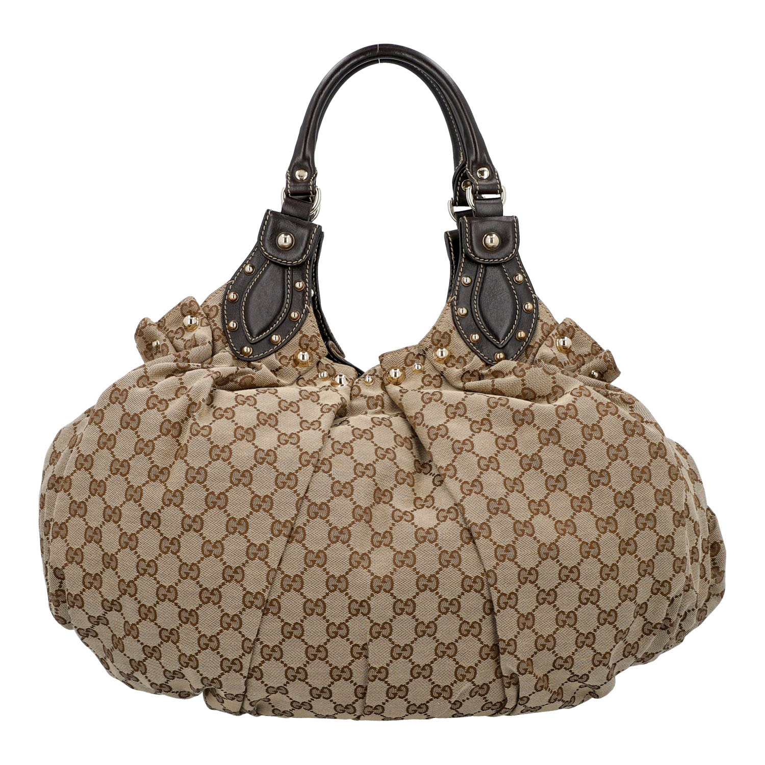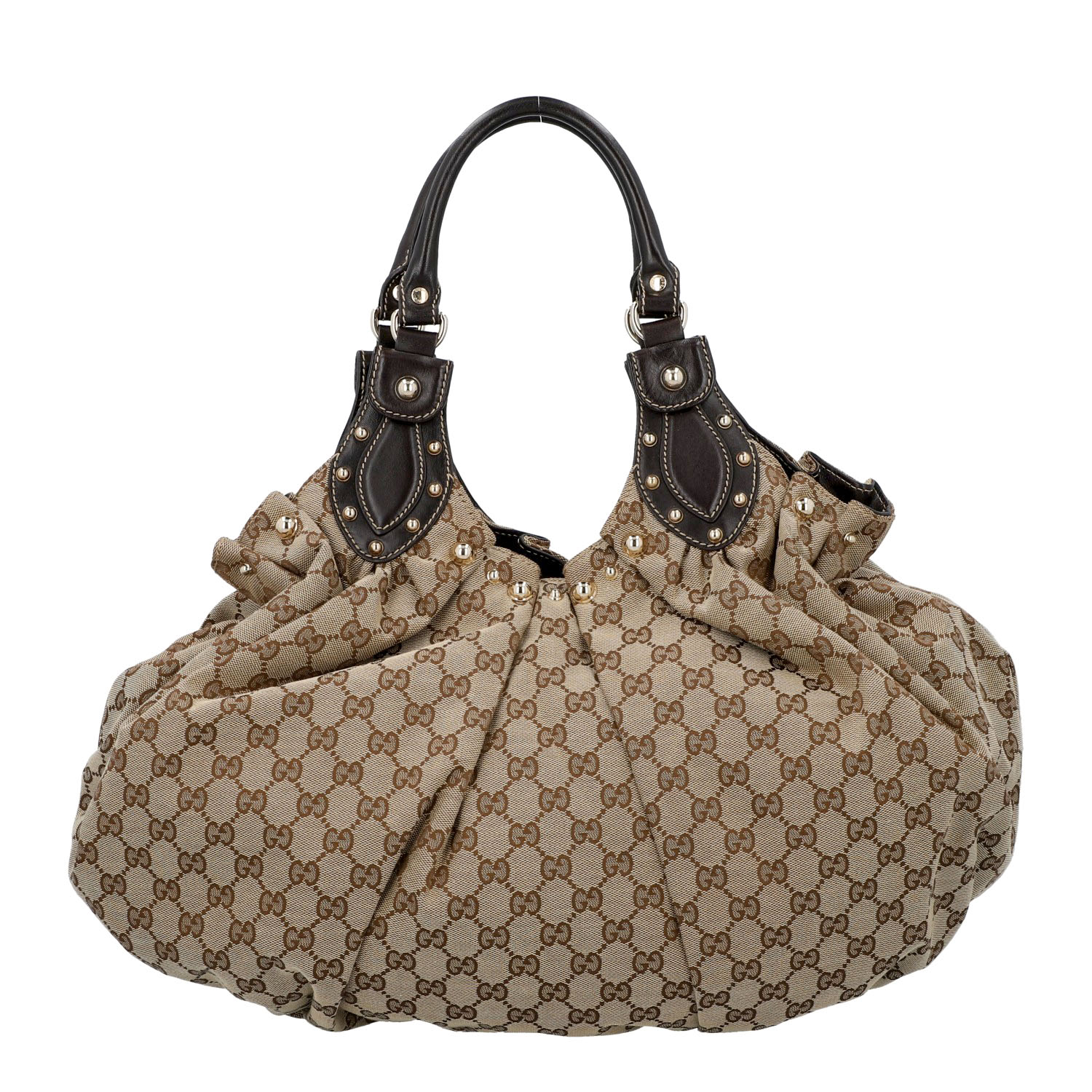 GUCCI shopper. Made from textile with GG Supreme canvas, dark brown leather details and hardware, and round studs in gold. Main compartment with magnetic closure, textile lining, and small interior pocket. 45x10x30cm.