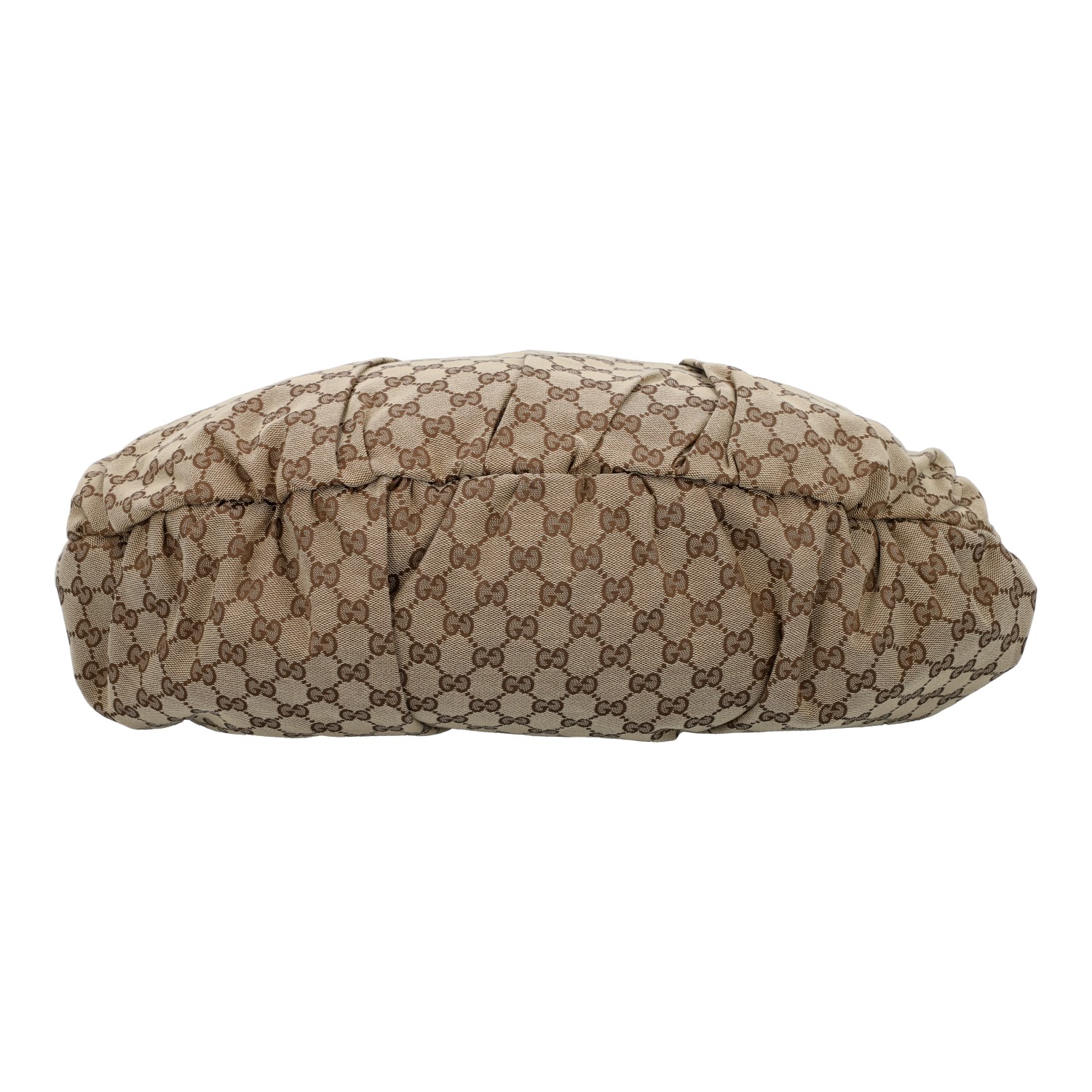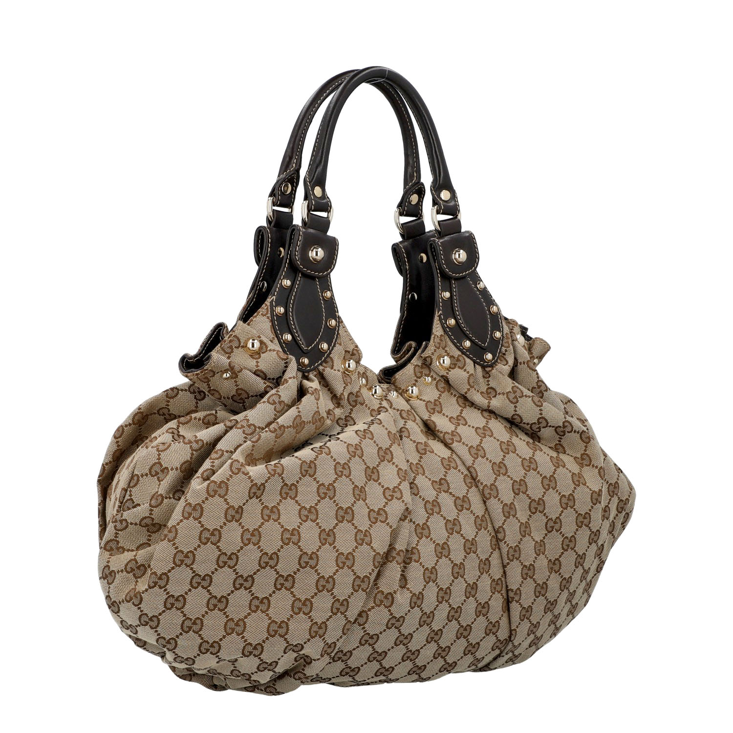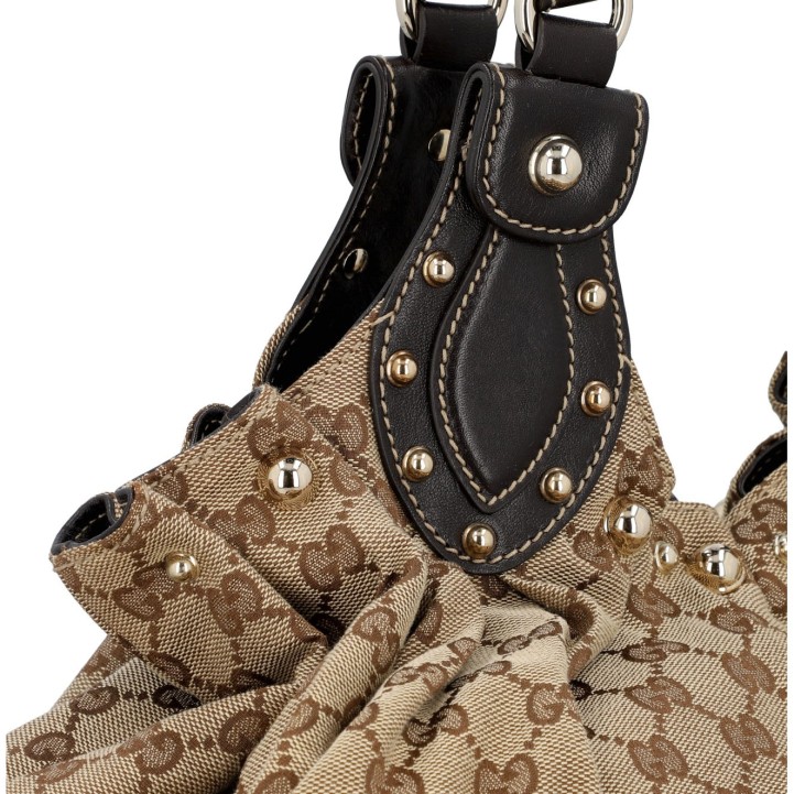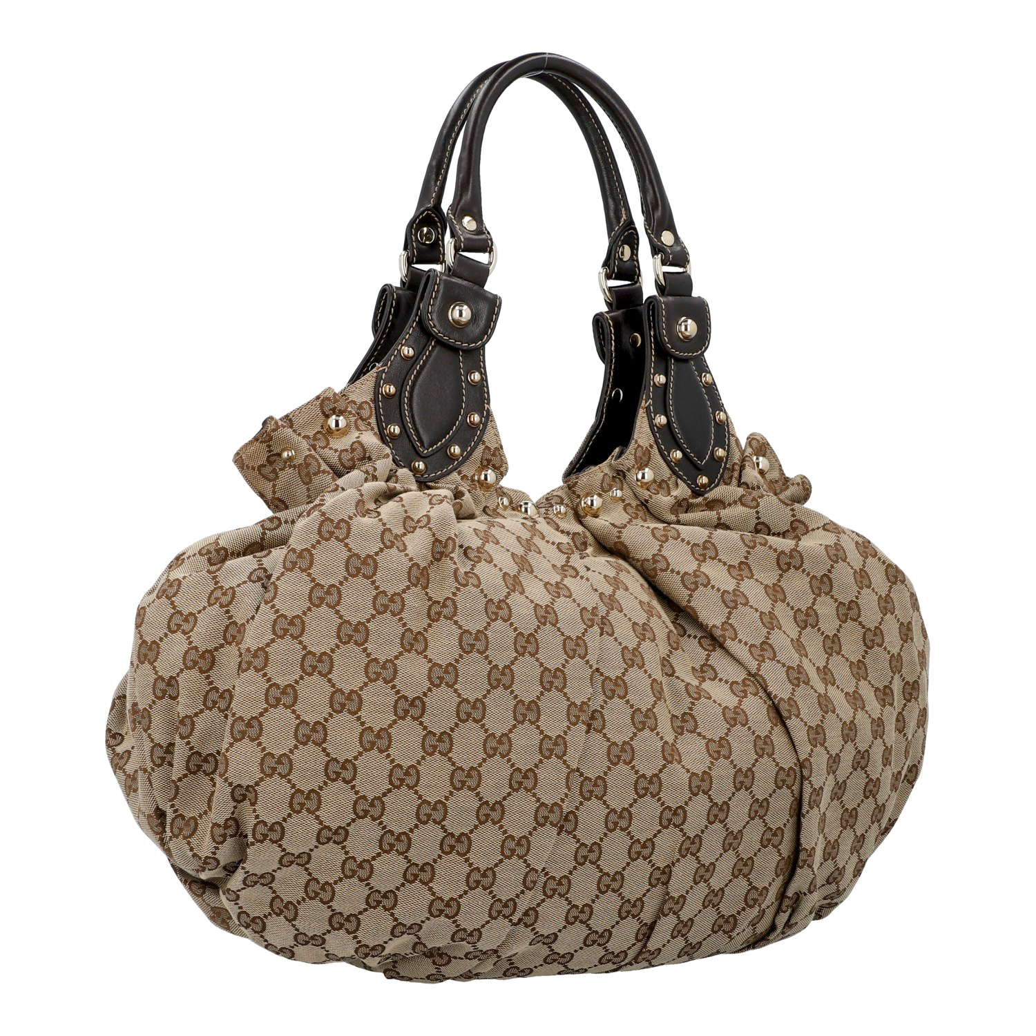 GUCCI shopper. Made from textile with GG Supreme canvas, dark brown leather details and hardware, and round studs in gold. Main compartment with magnetic closure, textile lining, and small interior pocket. 45x10x30cm.