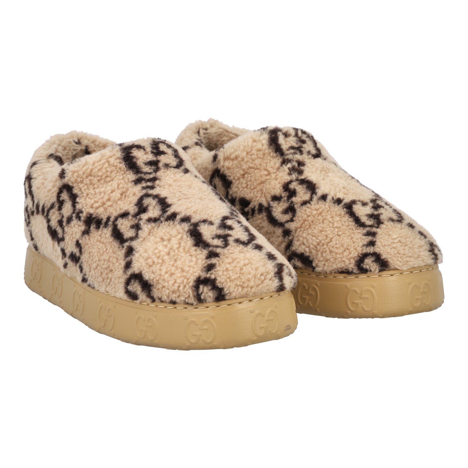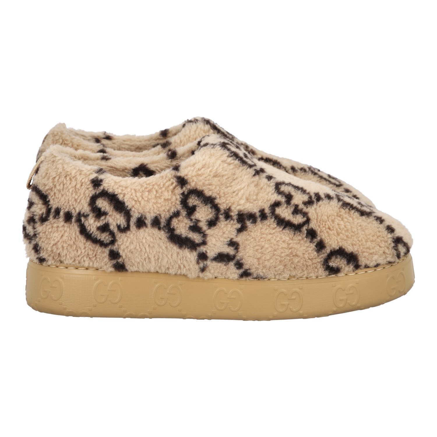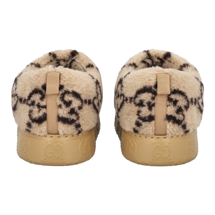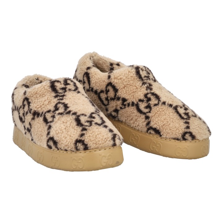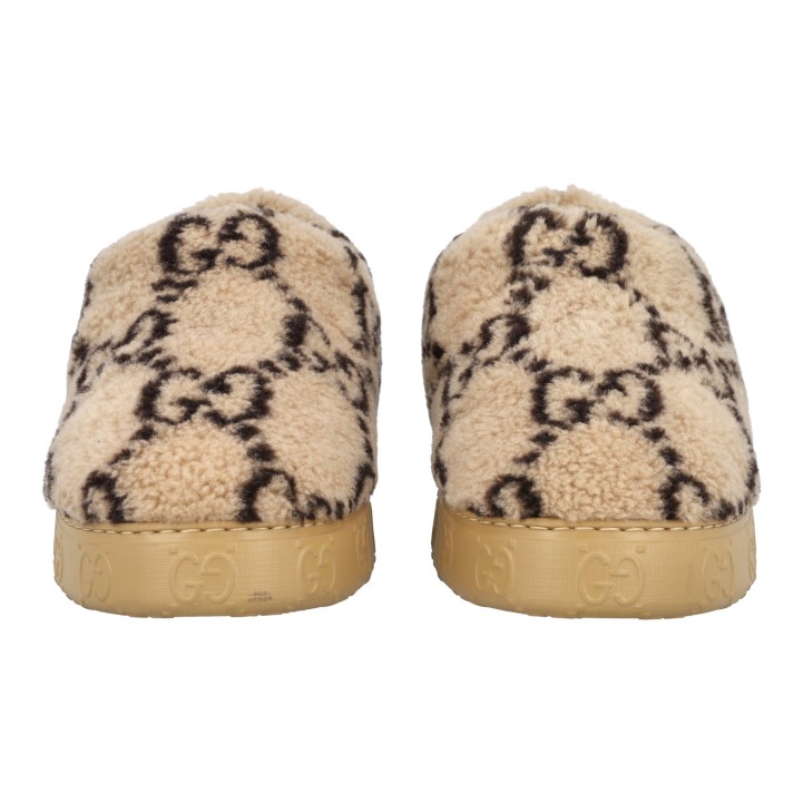 GUCCI slipper, size 9 (43). Interlocking Double G on beige plush. Rubberized outsole with GG logo. Box and dust bag included. Good condition.