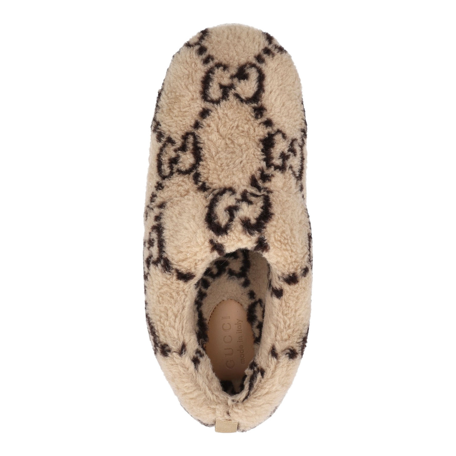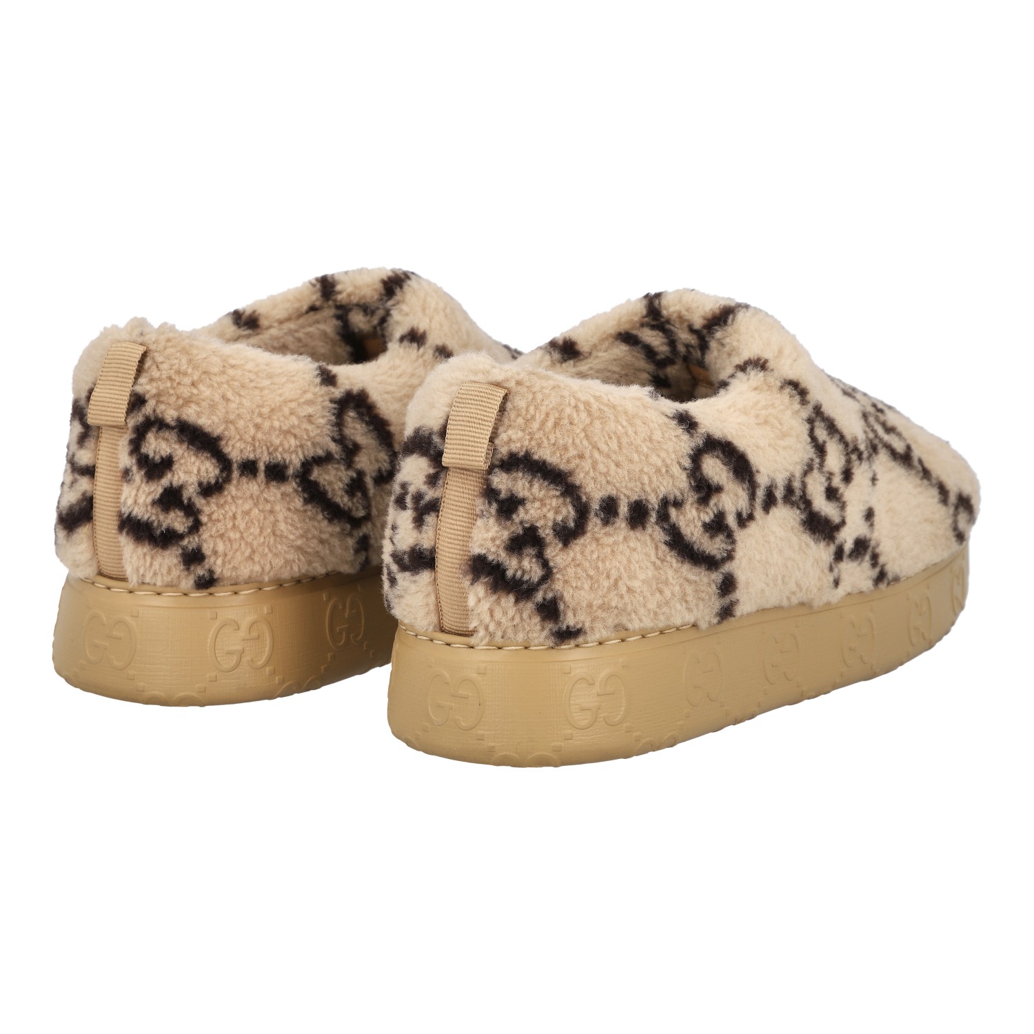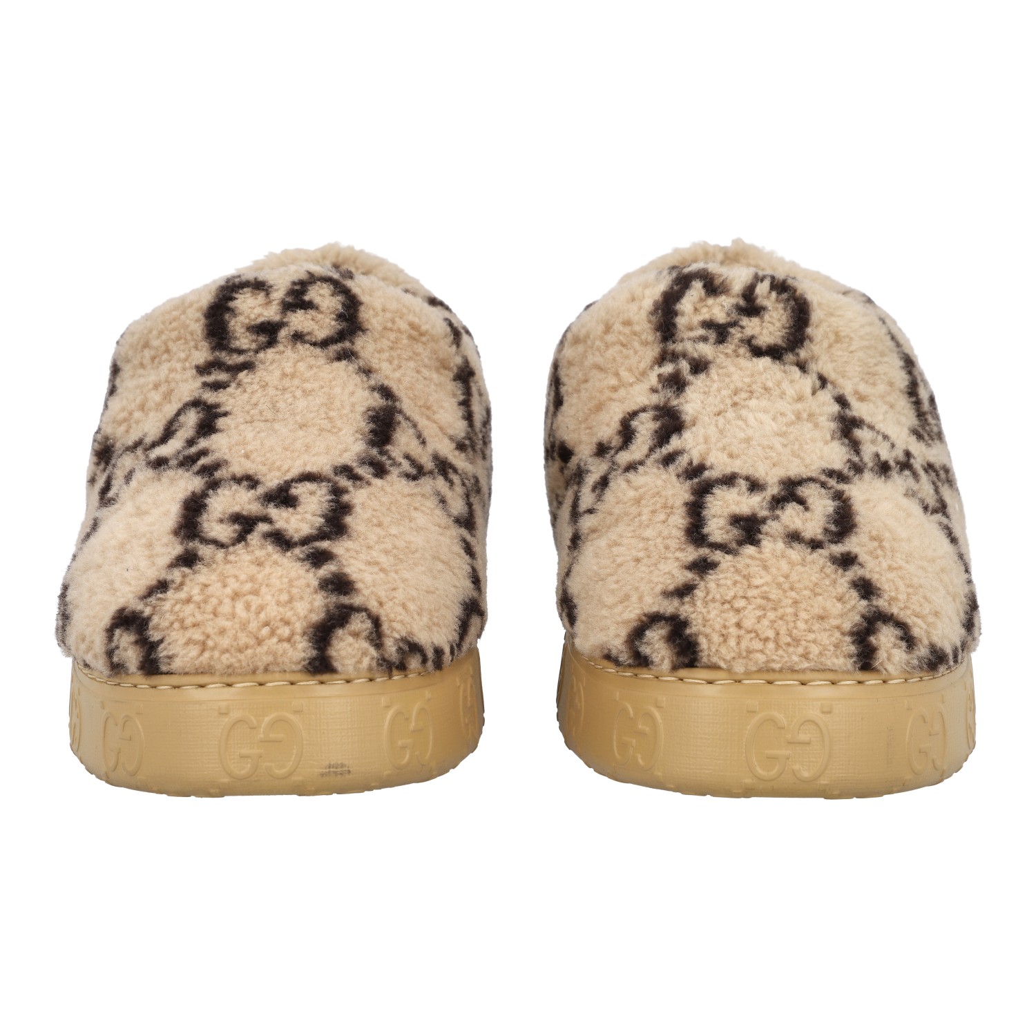 GUCCI slipper, size 9 (43). Interlocking Double G on beige plush. Rubberized outsole with GG logo. Box and dust bag included. Good condition.