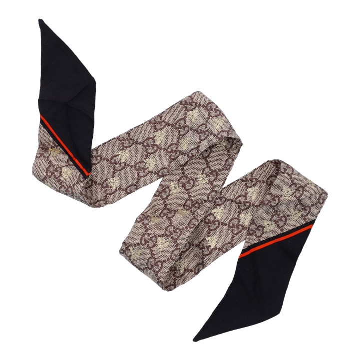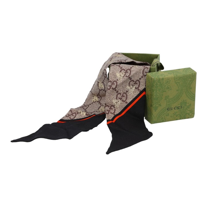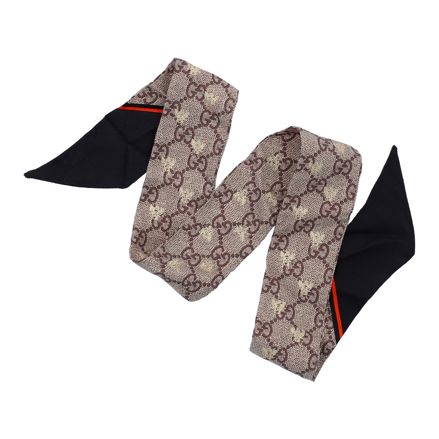 GUCCI Twilly. 100% silk in brown with classic GG Supreme logo pattern and gold-colored bee decoration. Black ends with striped detail. Good condition. Length approx. 80 cm.