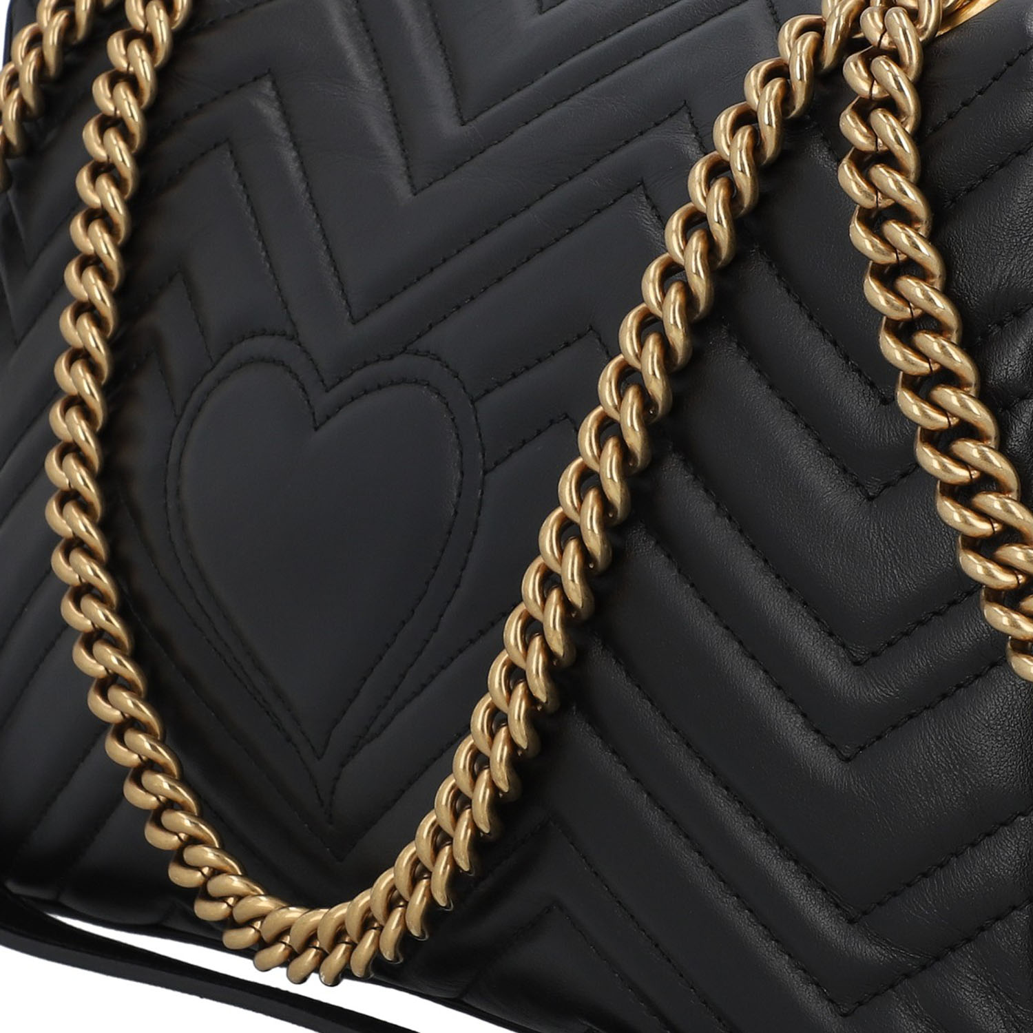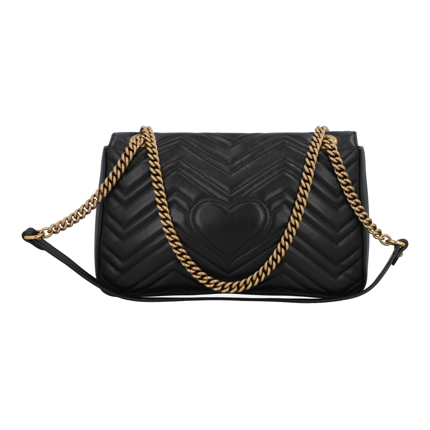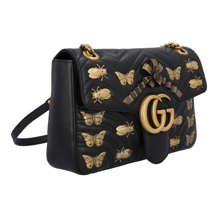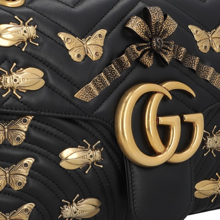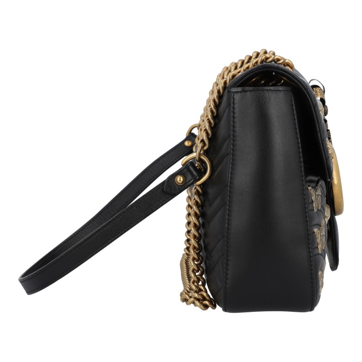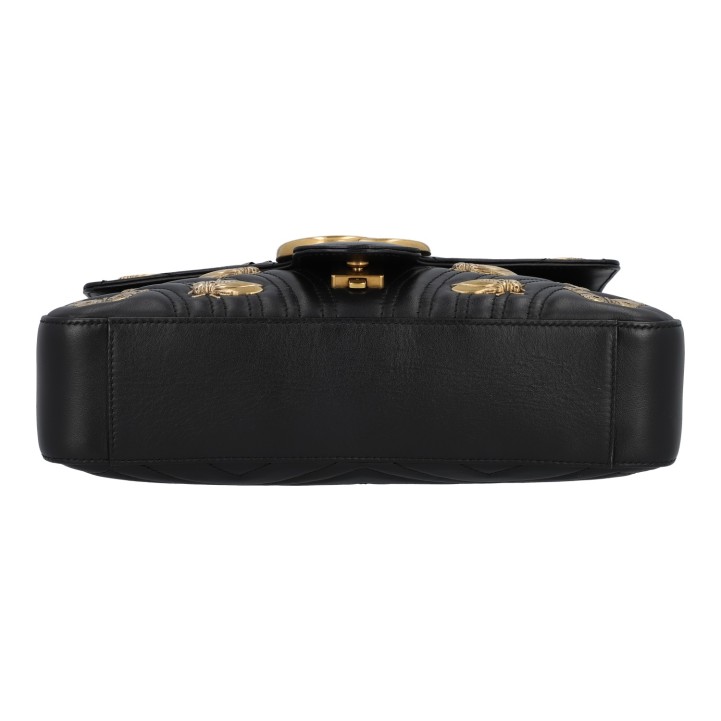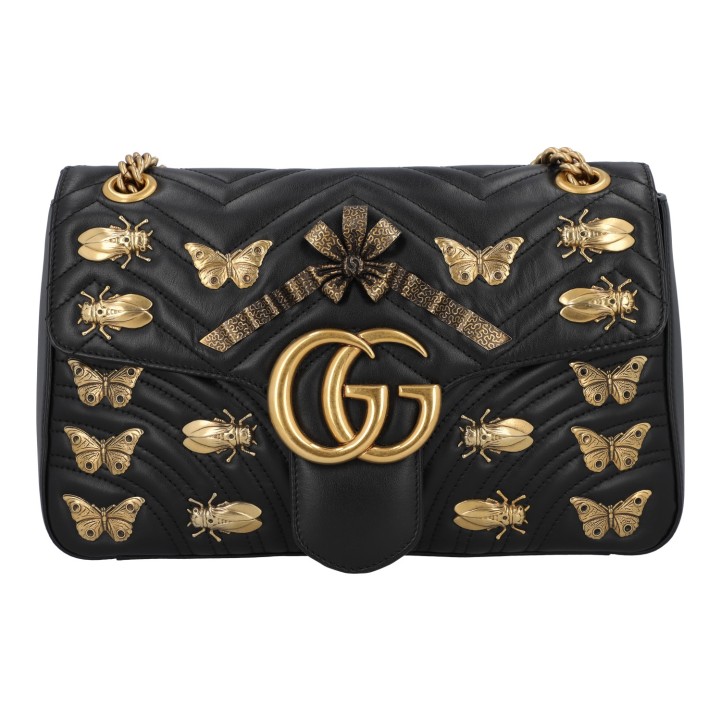 GUCCI shoulder bag 'GG MARMONT'. Black matelassé chevron leather with antique gold finish hardware. Limited edition with decorative appliqués. Very good condition.