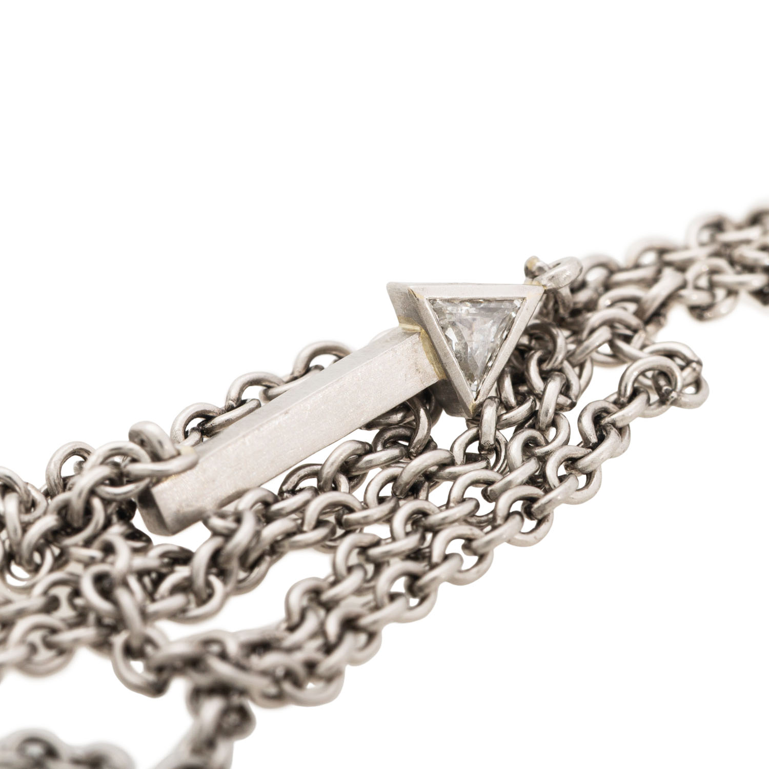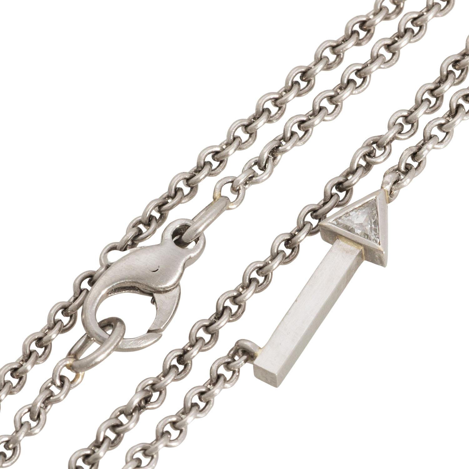 GÜNTER KRAUSS 'Arrow' necklace with trilliant-cut diamond, approx. 0.10 ct, RW (F-G)/VS, PLATINUM, 7.1 g, anchor chain: L: approx. 34.5 cm, W: approx. 1.8 mm, with carabine and eyelet, pendant: satin finished, L: approx. 14.8 mm, W: approx. 1.7 - 4.8 mm, 21st century, minimal signs of wear, with hallmark 'KRAUSS'.