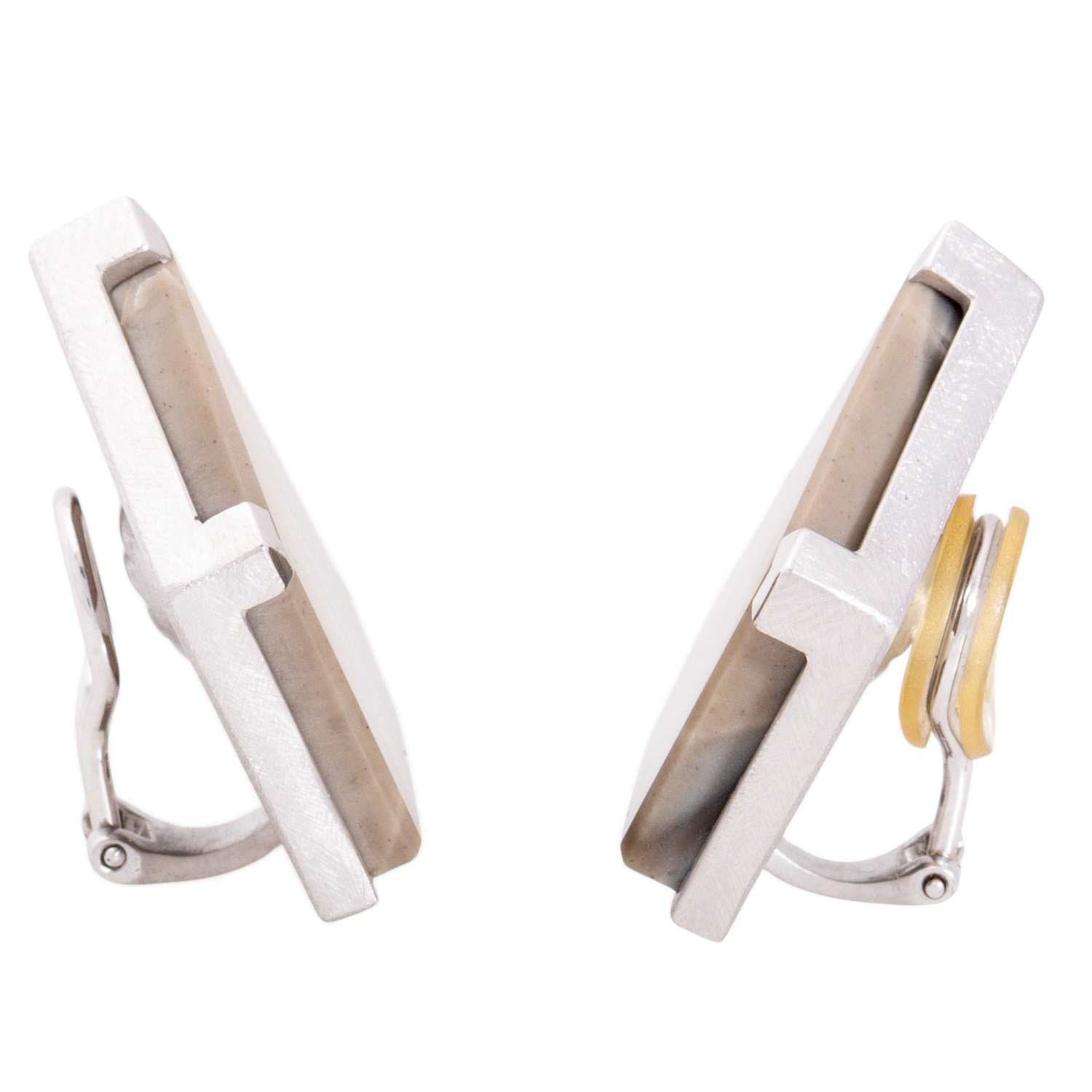 GÜNTER KRAUSS earclips with polygonal stone plates, prob. quartzes, set and mounted on 18K white gold, 31.3 g, 3x2.4 cm, 20th/21st century, good condition, marked 'GK', very solid craftsmanship.