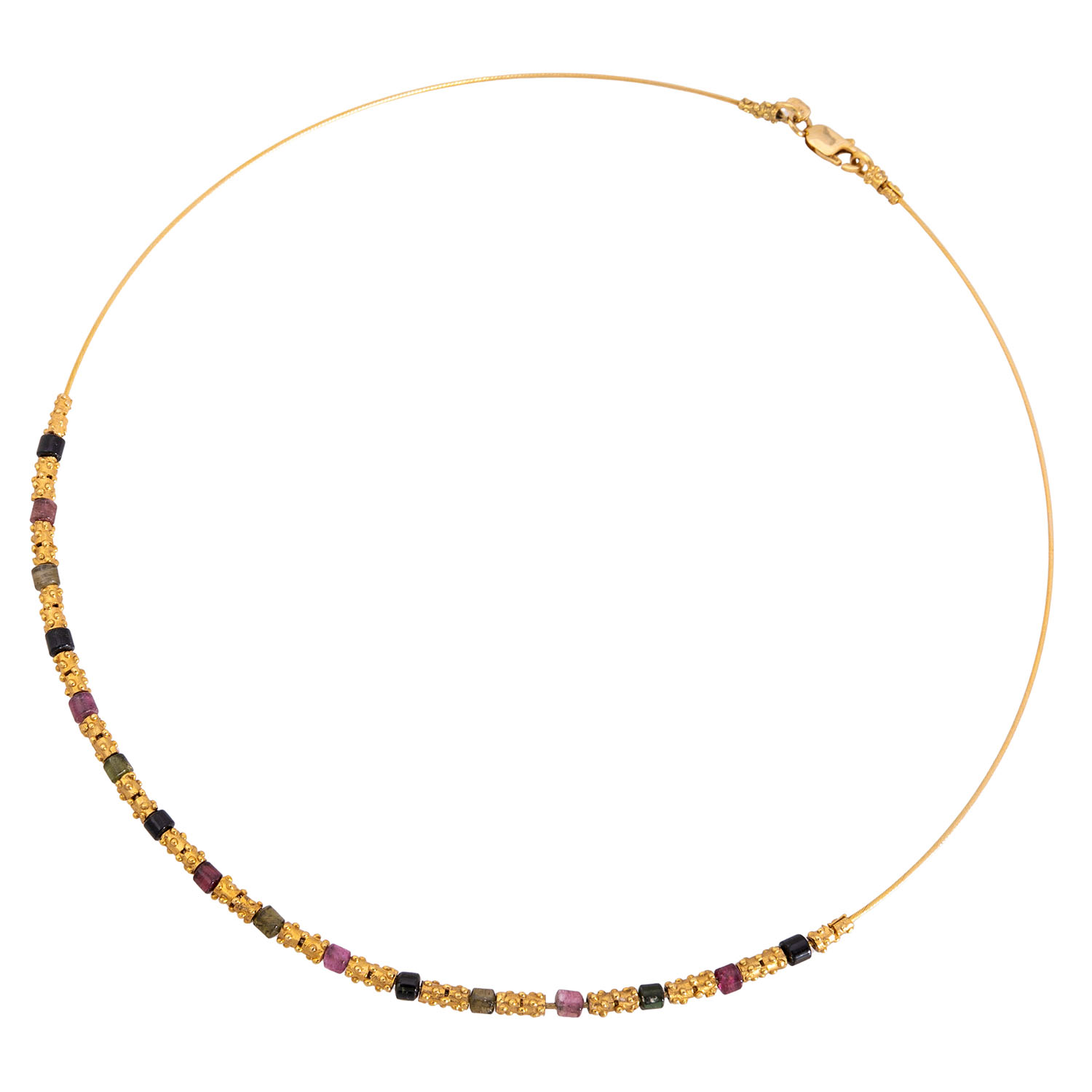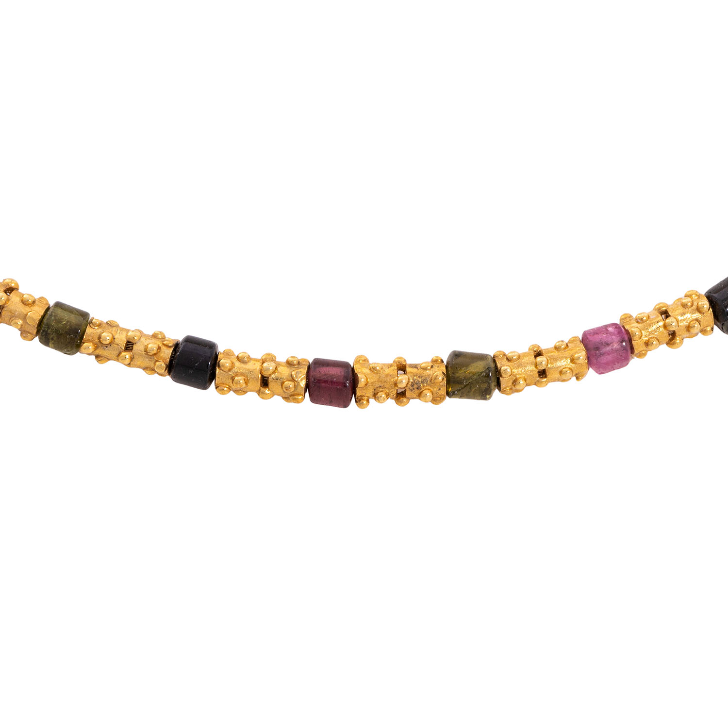 Choker with 16 tourmaline and 17 gold elements, 14K yellow gold, 9 g, L: approx. 41.5 cm, W: approx. 0.7 - 3.3 mm, 21st century, minor signs of wear.