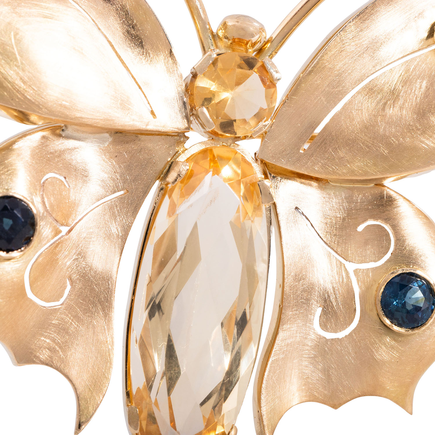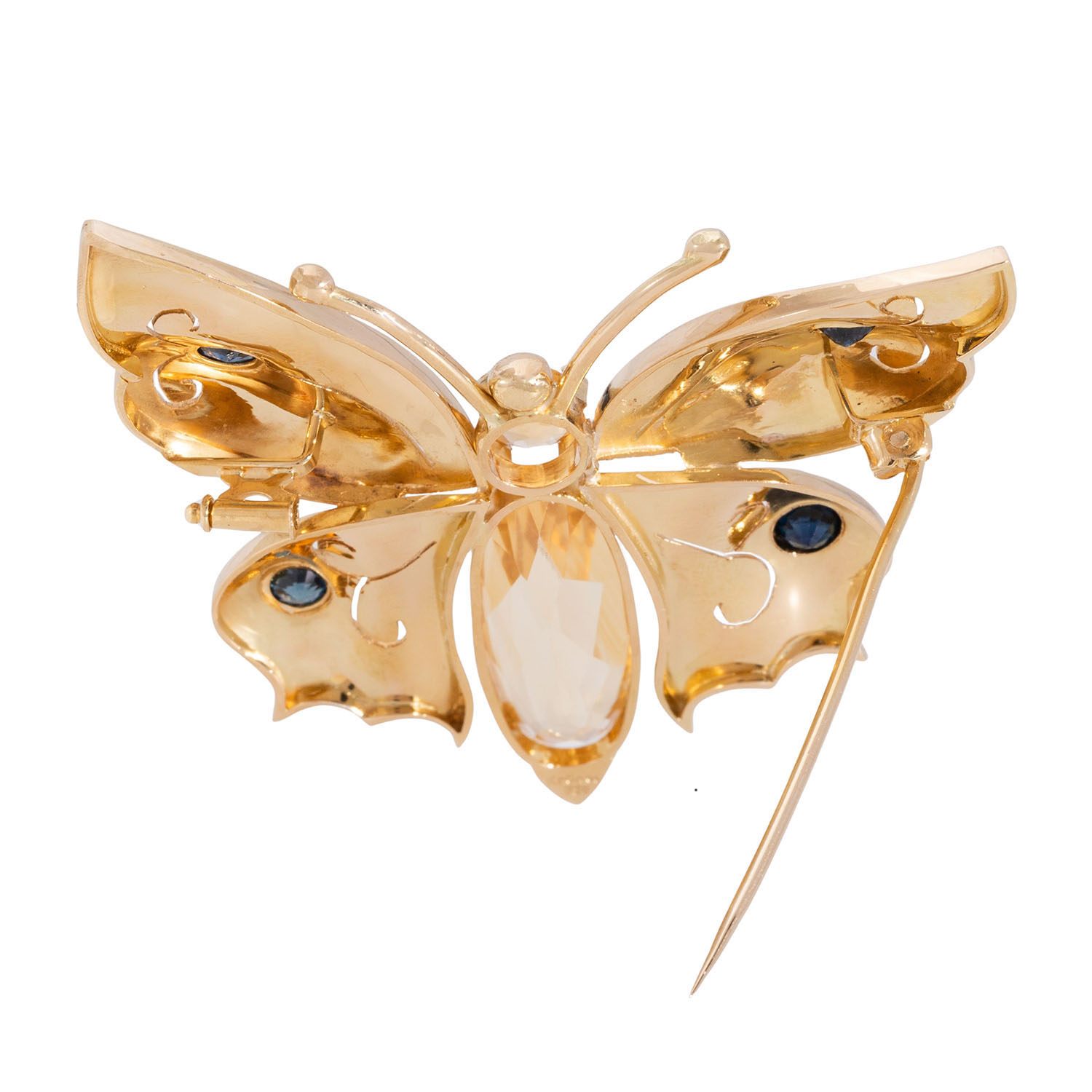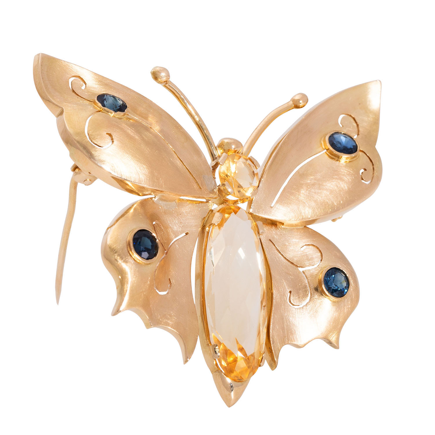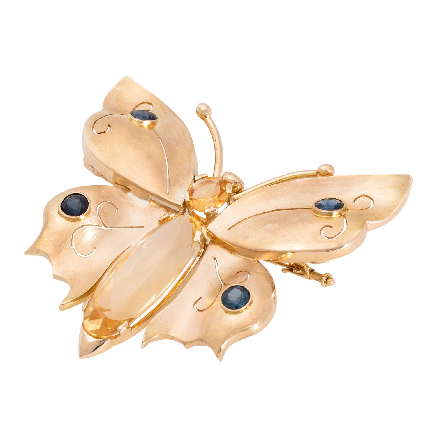 Handcrafted brooch 'Butterfly' with 4 round faceted sapphires and 1 oval and 1 round faceted light yellow gemstone, prob. citrine, 18K yellow gold, 17.5 g, 5.5x5 cm, 20th/21st century, good condition, marked 'Kröner', solid and elaborate craftsmanship.