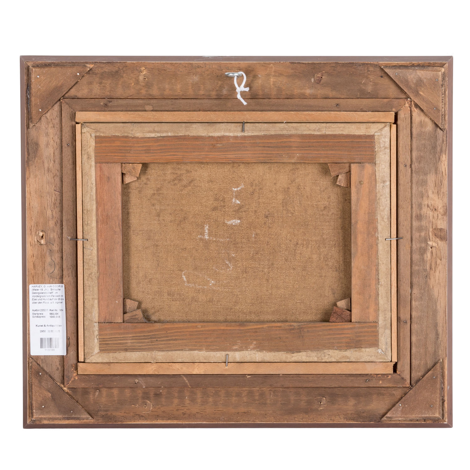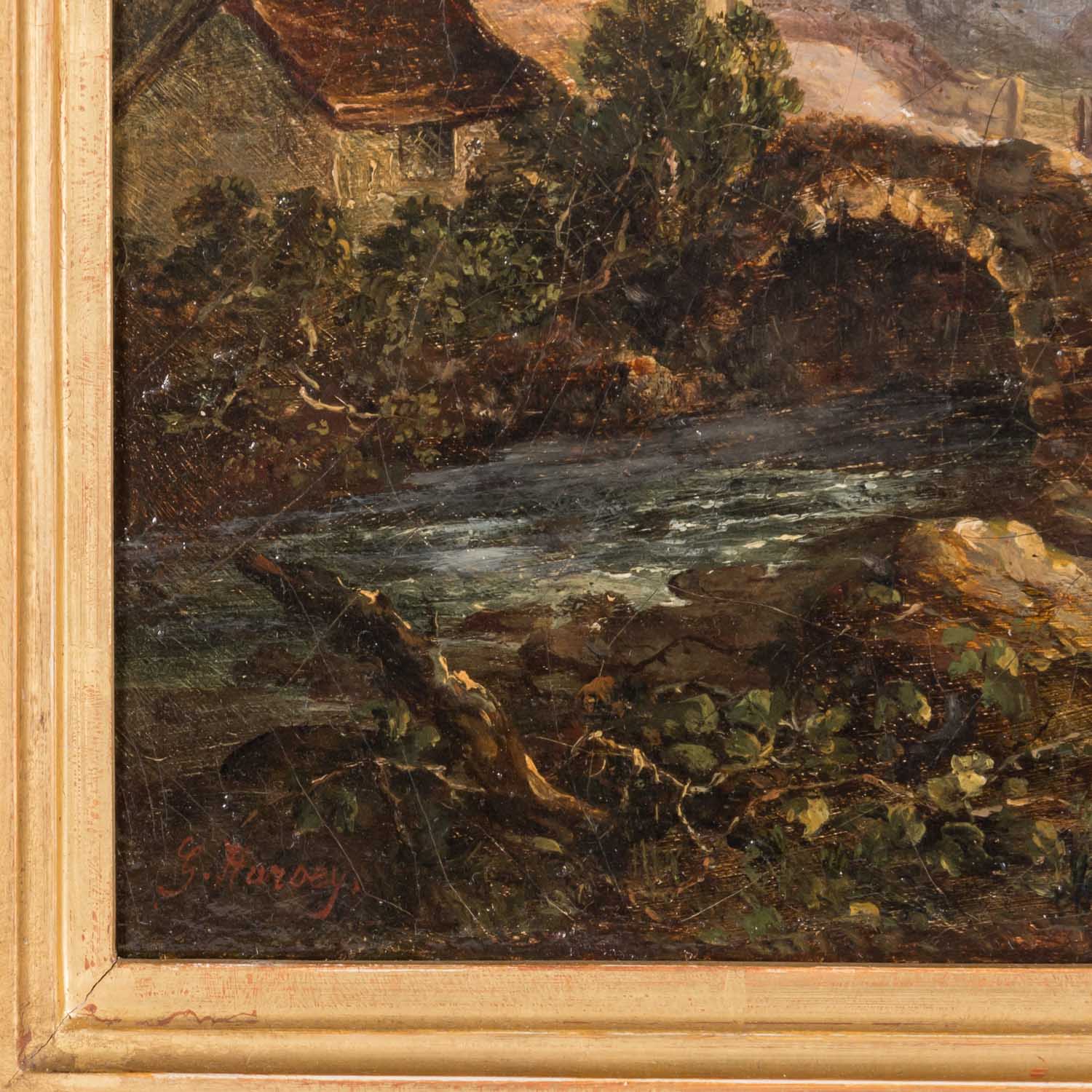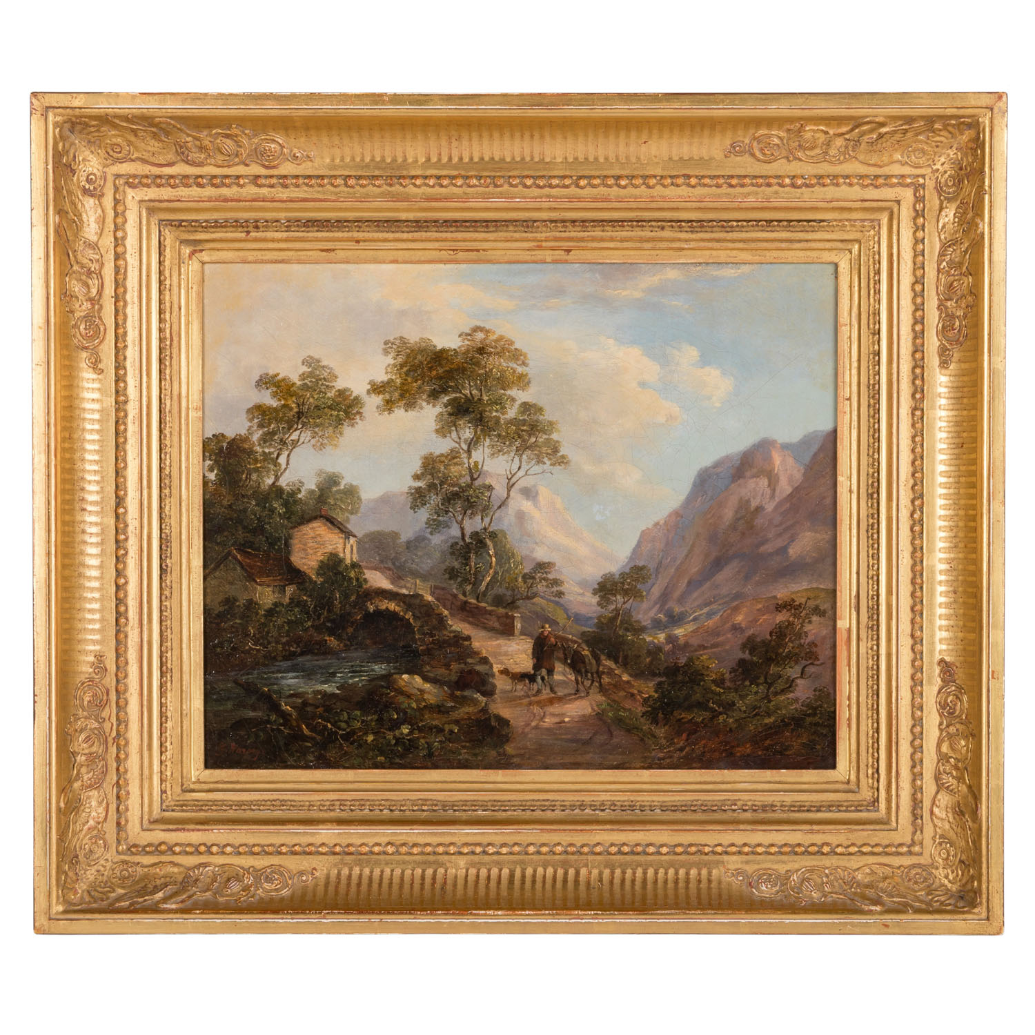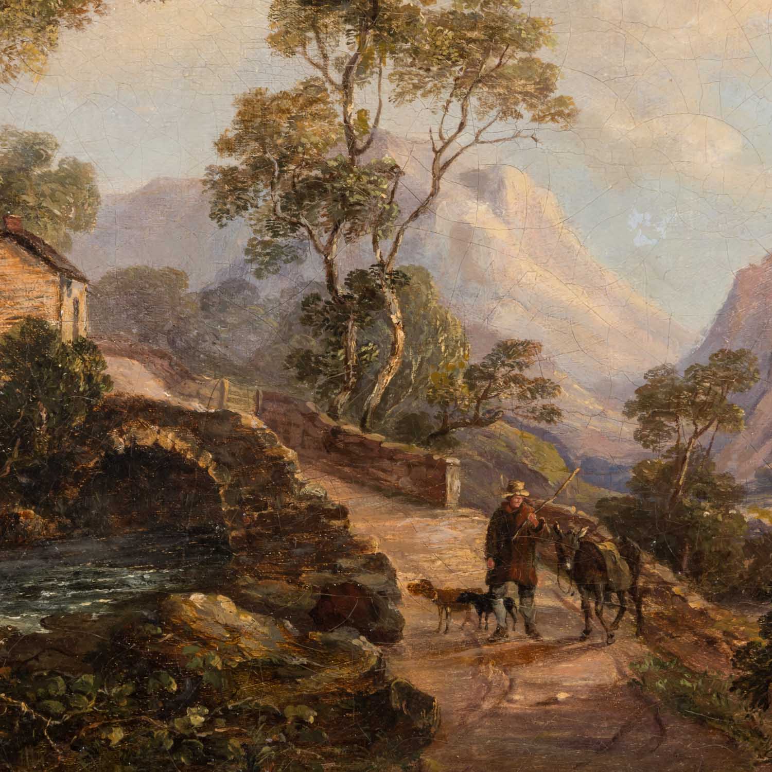 HARVEY, G. probably GEORGE (painter 19th century), 'British mountain landscape’, in the foreground a passer-by with donkey and dog on the bridge over the river, signed ’G. Harvey', oil/canvas relined, HxW: approx. 26x35 cm (43x50 cm with frame). Traces of age and rubbing, craquelure, restored and partially retouched. With frame (frame minimally rubbed).