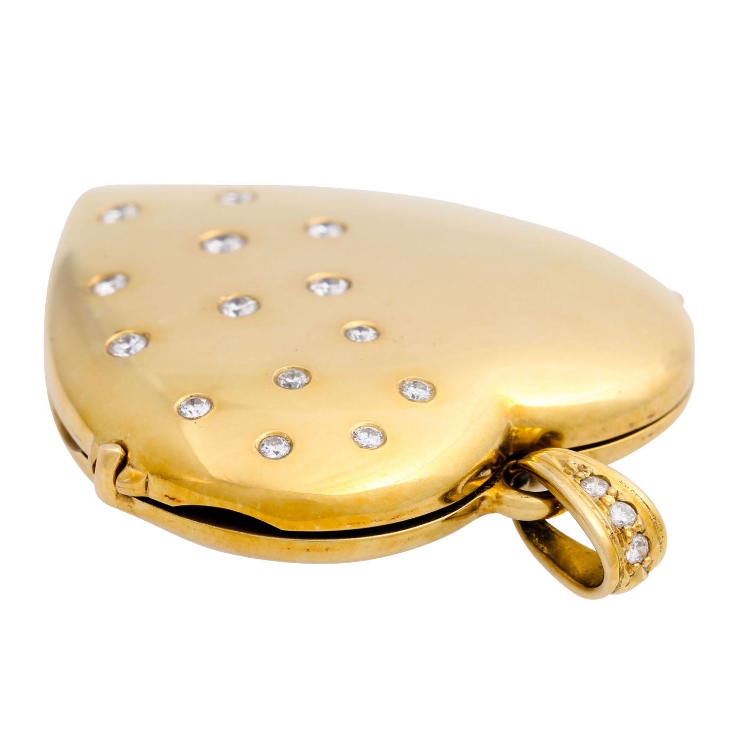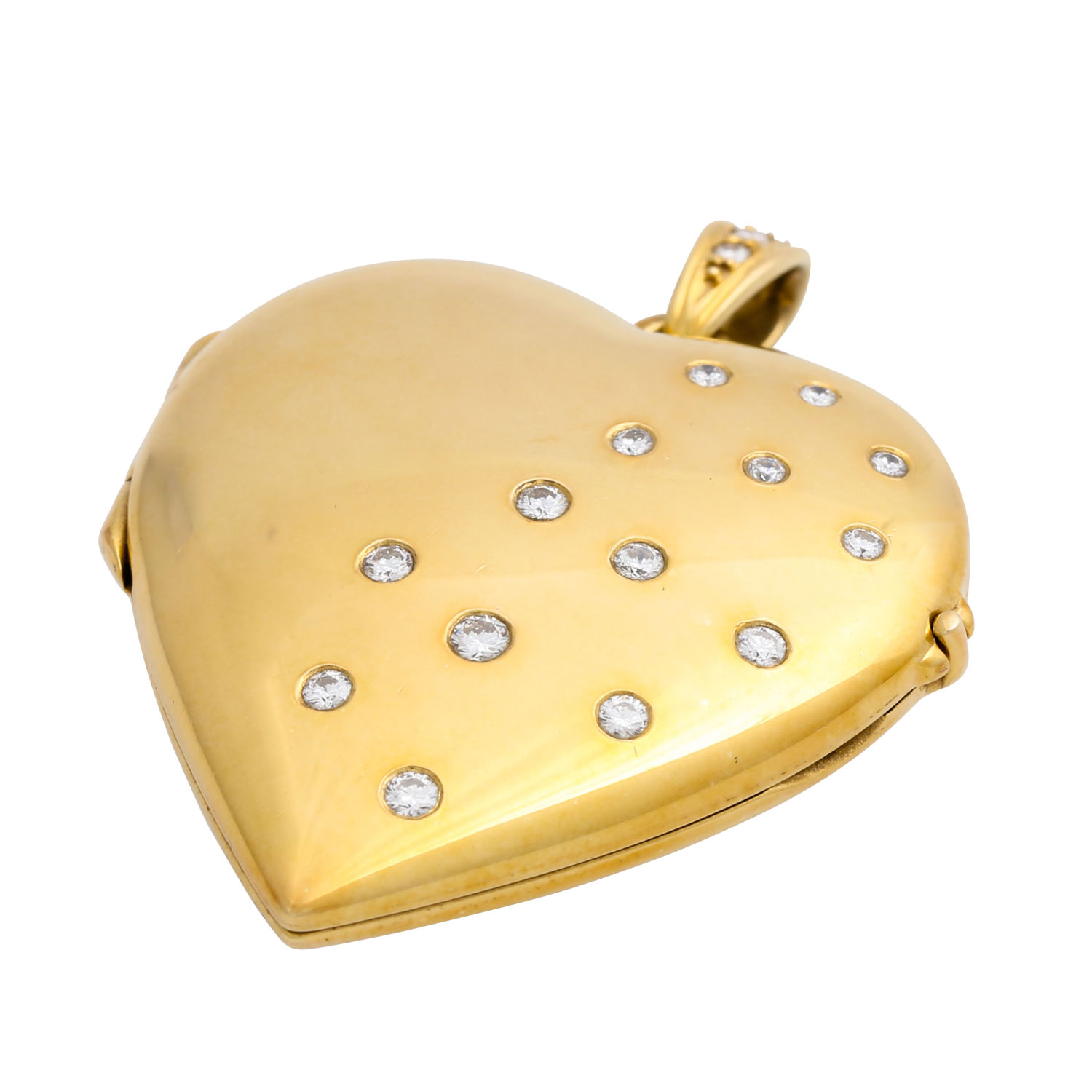 Heart medallion set with 17 brilliant-cut diamonds totalling ca. 0.28ct of very good colour and clarity, YG 14K, 15.5g, L x W 3.8 x 2.9 cm, 20th/21st century, signs of wear.